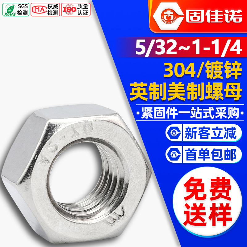 304 스테인레스 스틸 아연 도금 앵글로-미국 육각형 너트 외부 육각형 게이지 너트 10 #1/4 "1/2" 3/16"