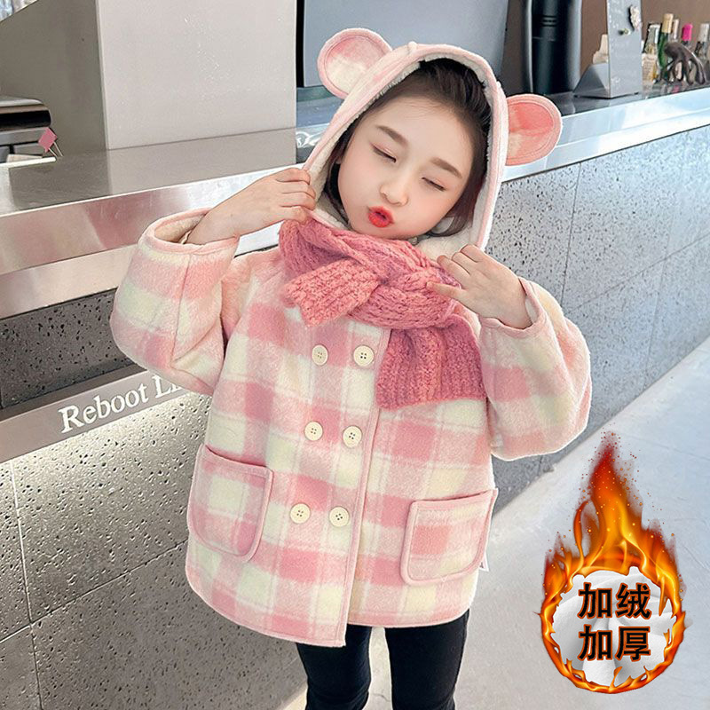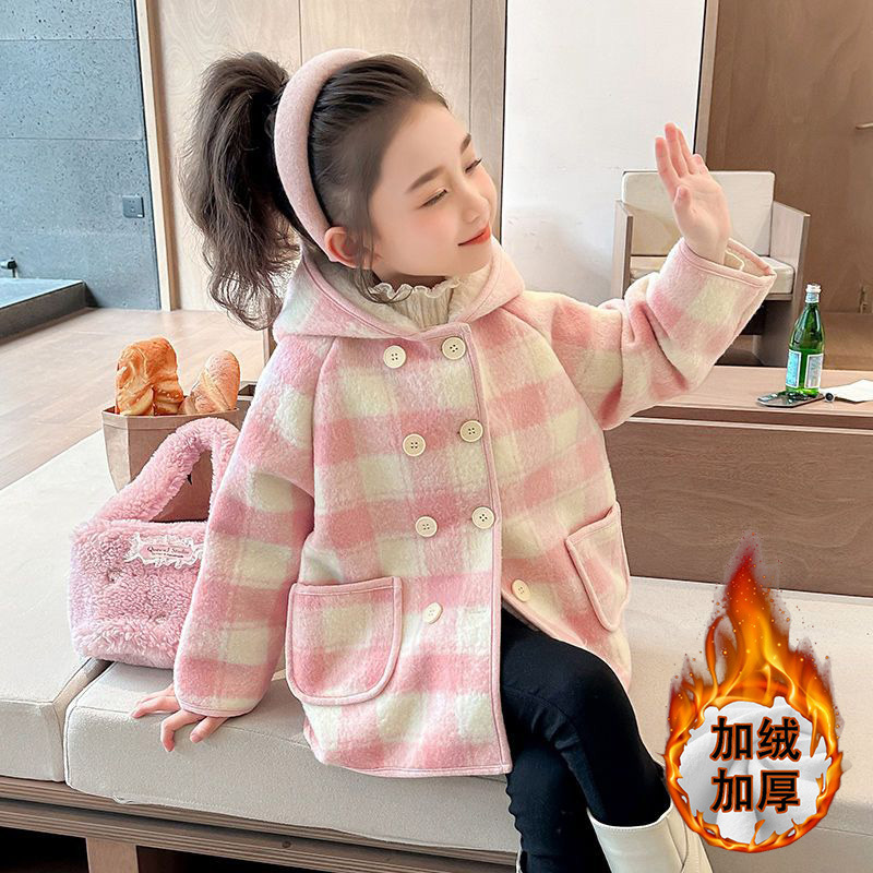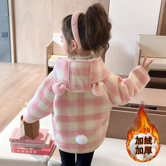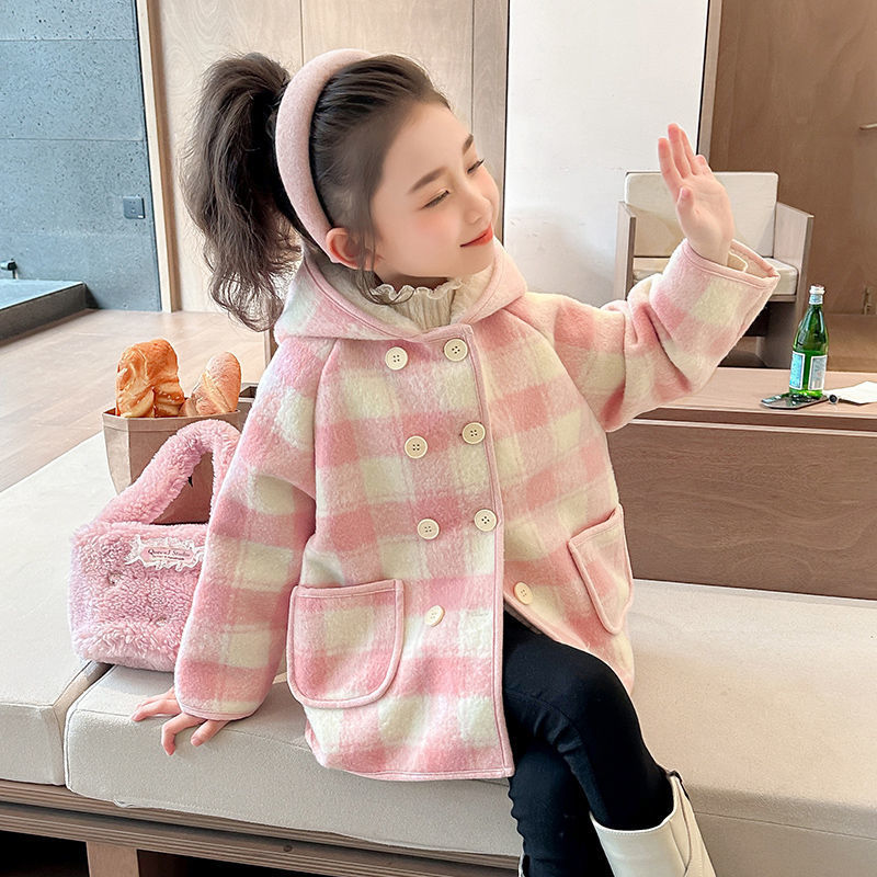 여성 격자 무늬 만화 후드 코트 큰 어린이 가을과 겨울 새로운 색상 매칭 올매치 달콤한 올매치 귀여운 재킷 트렌디