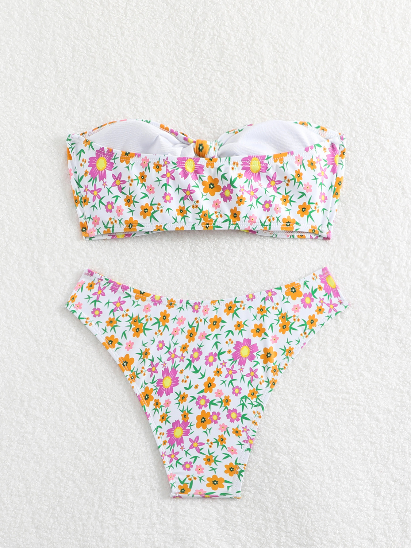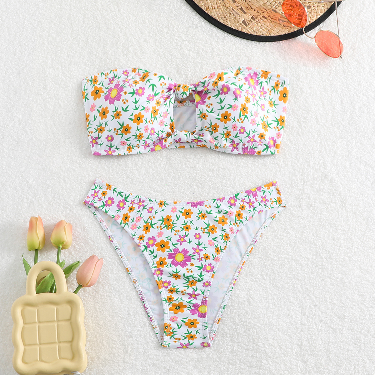 2024欧美新款抹胸聚拢比基尼女跨境性感露背高腰加厚分体泳衣