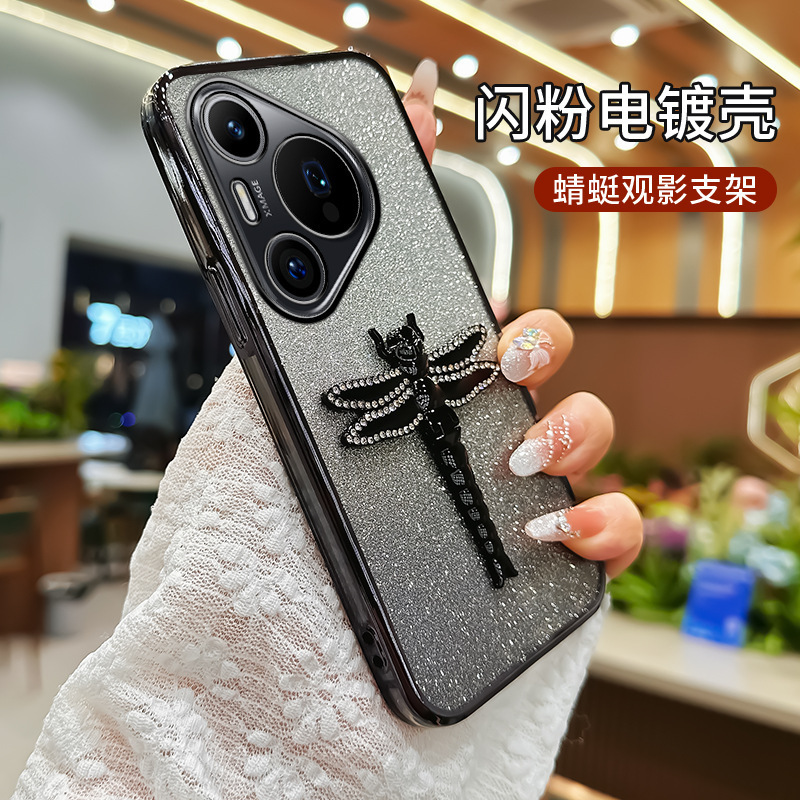 Huawei Pura70 휴대 전화 케이스 Rhinestone Dragonfly 브래킷 전기 도금 반짝이 TPU 드롭 방지 케이스 P60 모든 포함 남성과 여성을 위해 적당한