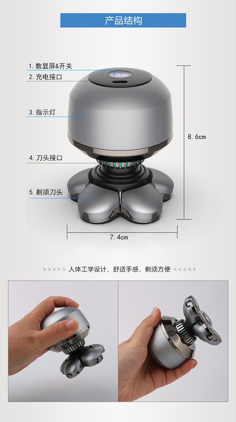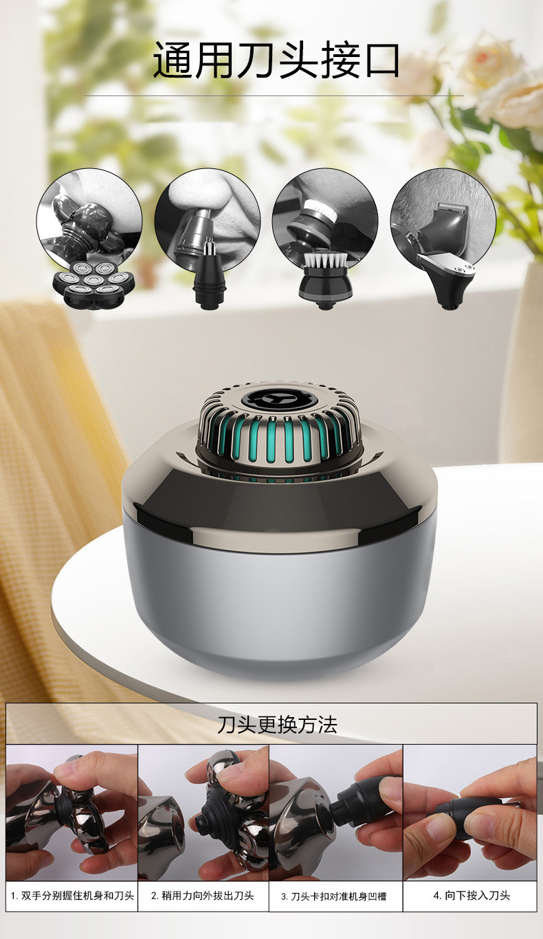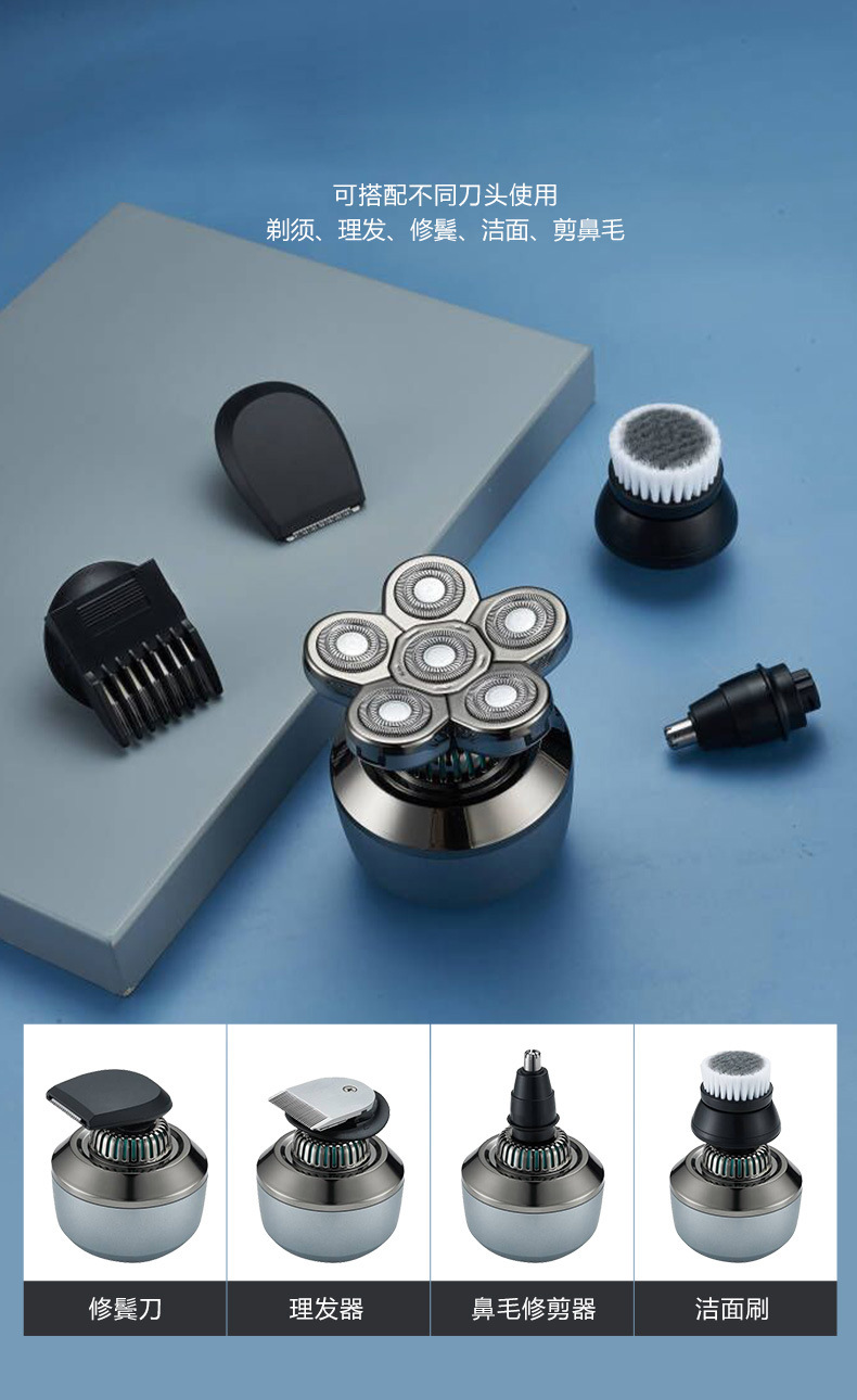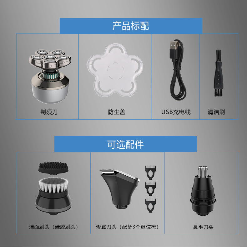 配置:机子+毛刷+刀头保护盖+USB线+说明书+常规彩盒(鼻毛器,理发头,洗脸刷,硅胶头可根据希求选配)