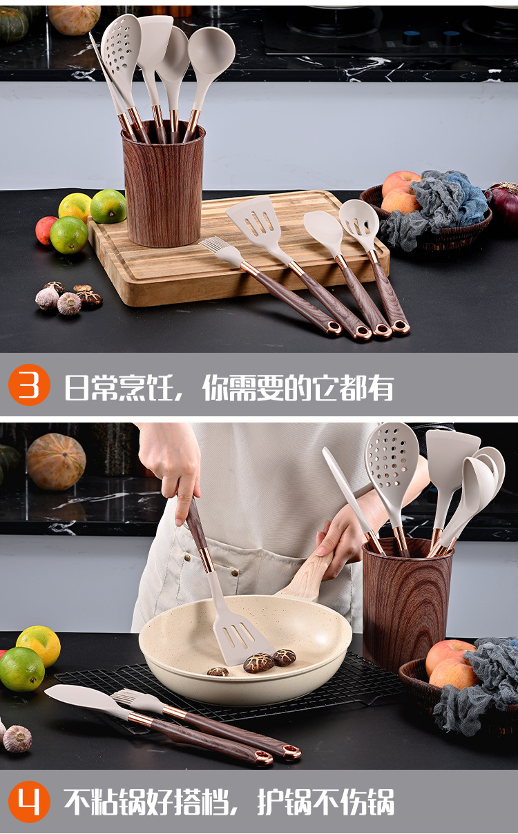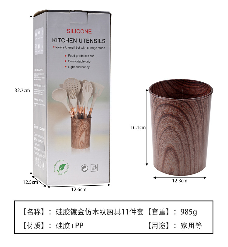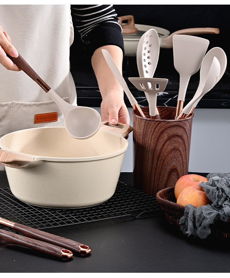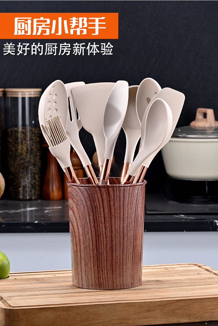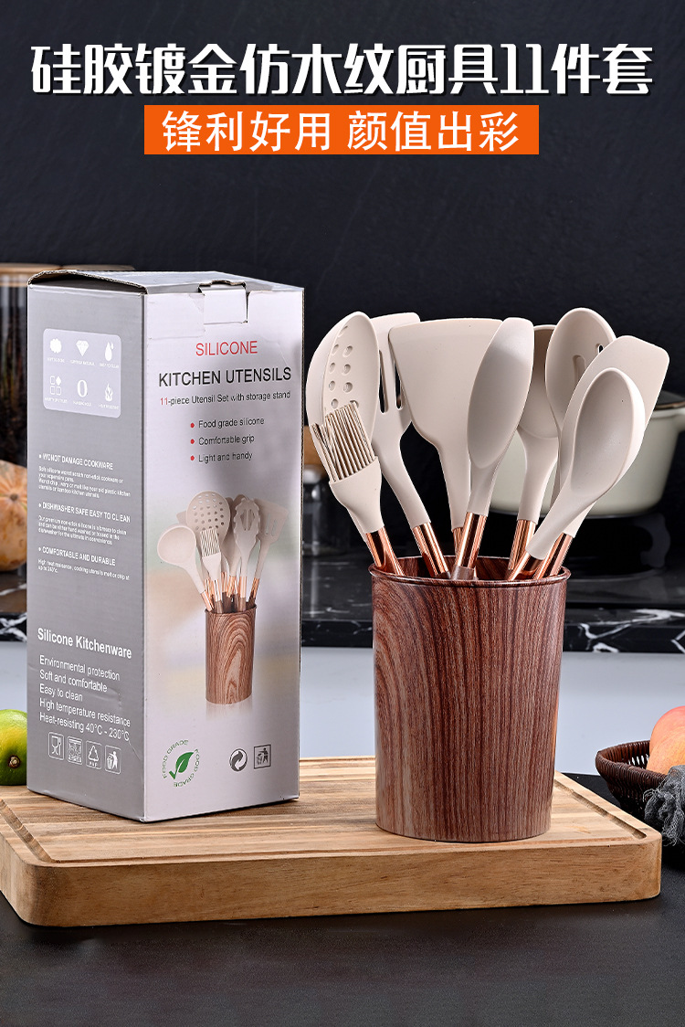 목재 곡물 손잡이로 덮인 국경 간 새로운 실리콘 주방 용품 11 개 세트 가정용 비 스틱 스푼 삽 요리 도구 세트스토어 가기