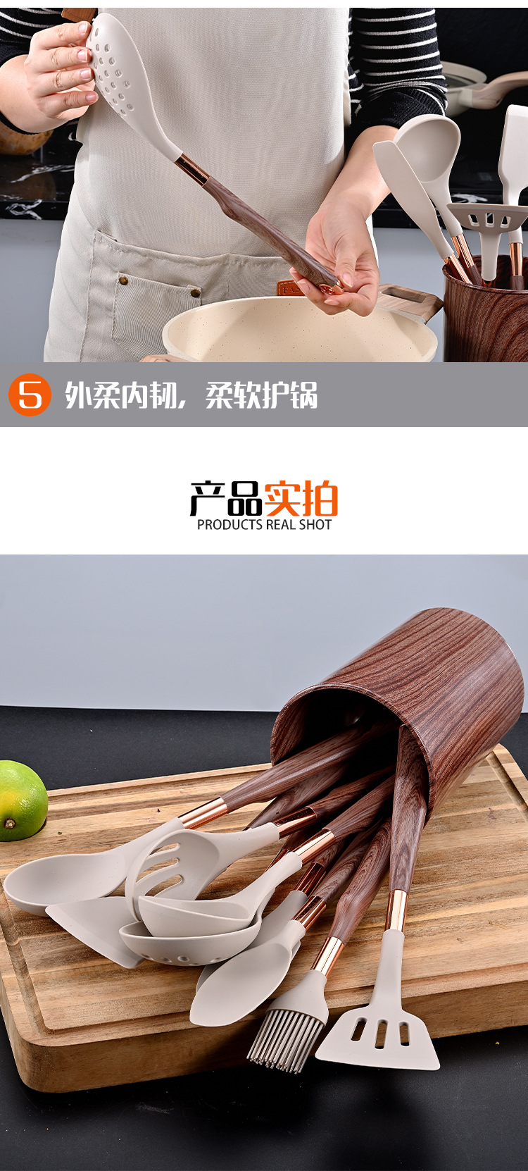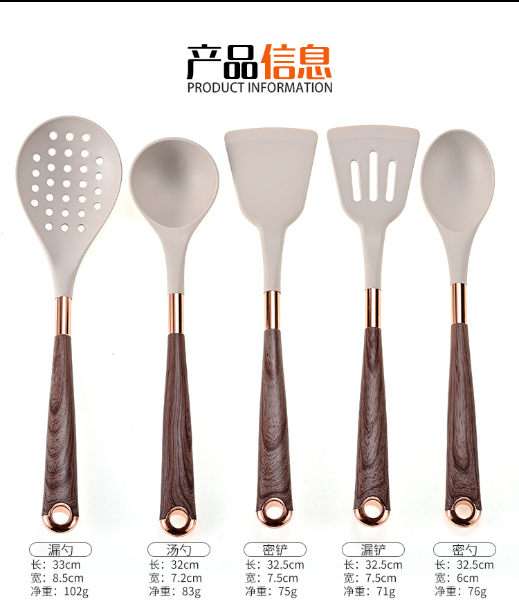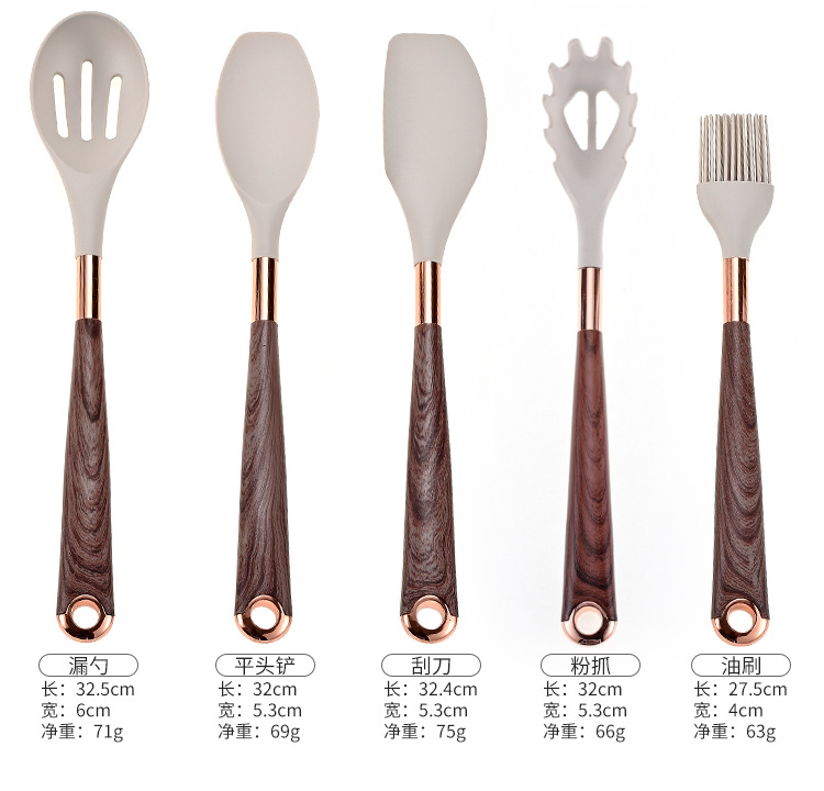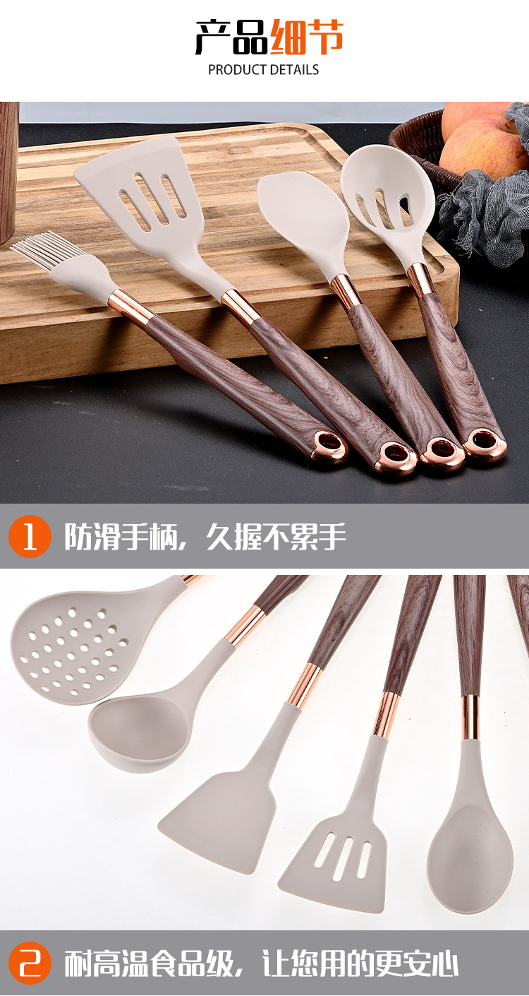 목재 곡물 손잡이로 덮인 국경 간 새로운 실리콘 주방 용품 11 개 세트 가정용 비 스틱 스푼 삽 요리 도구 세트스토어 가기