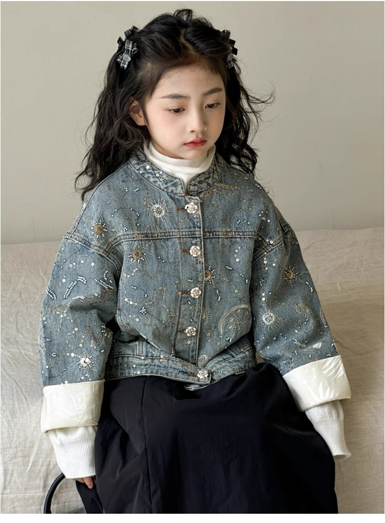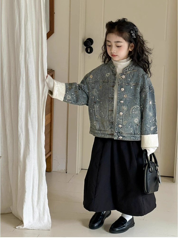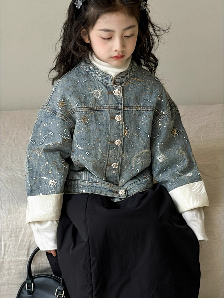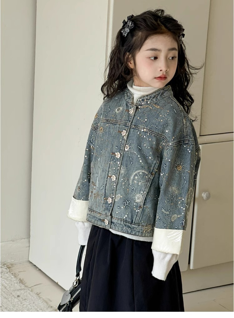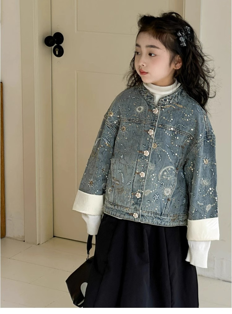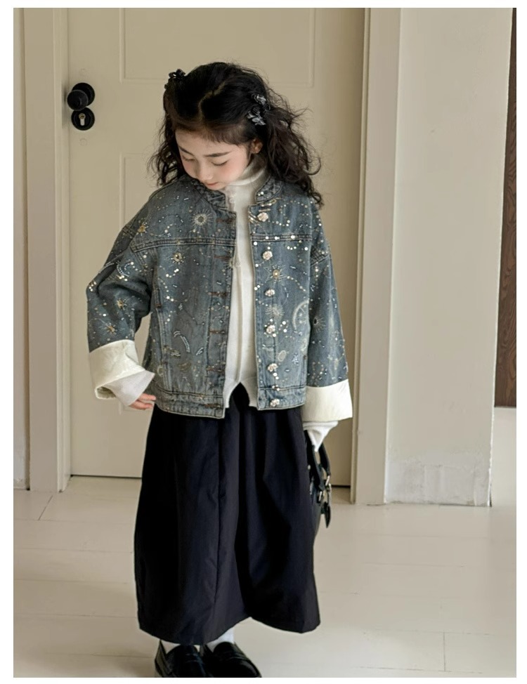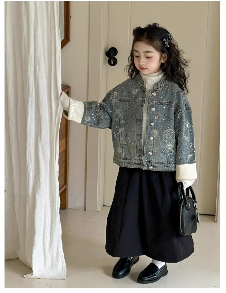 소녀 코트 새로운 중국 스타일 국가 스타일 어린이 코튼 두꺼운 데님 코트 가을 및 겨울 중대형 어린이를위한 새로운 자수 재킷
