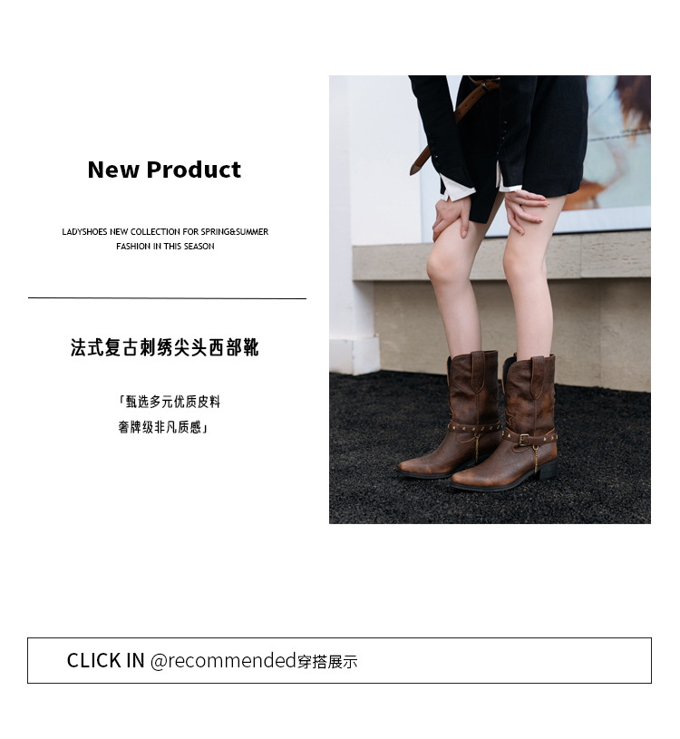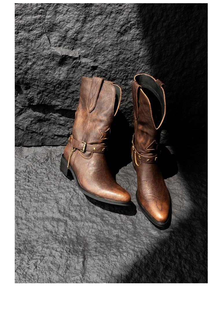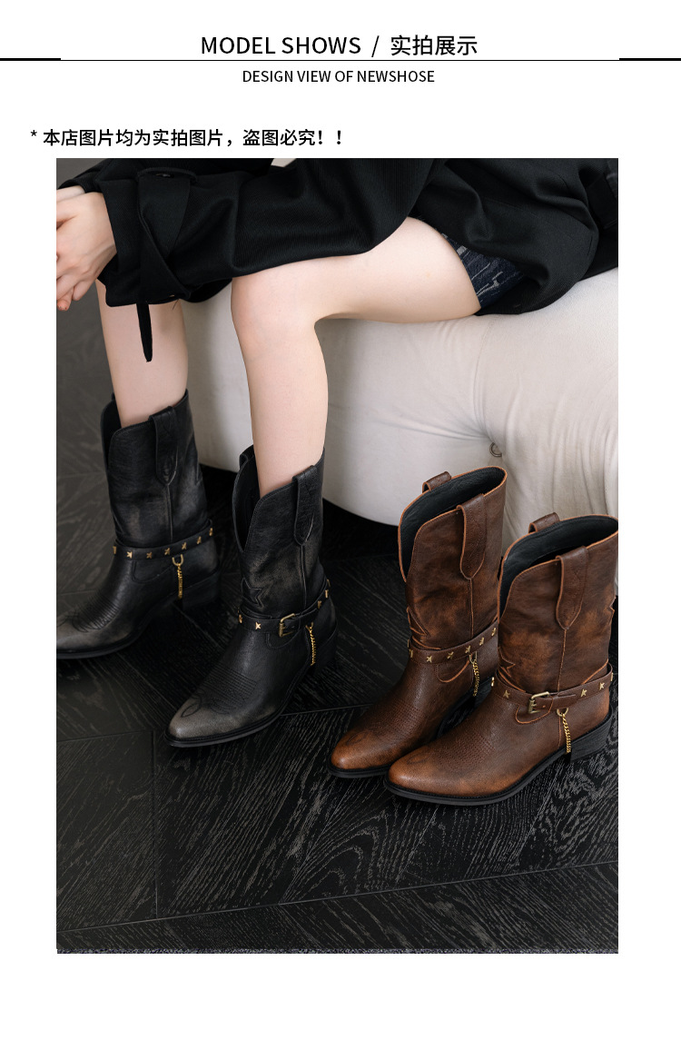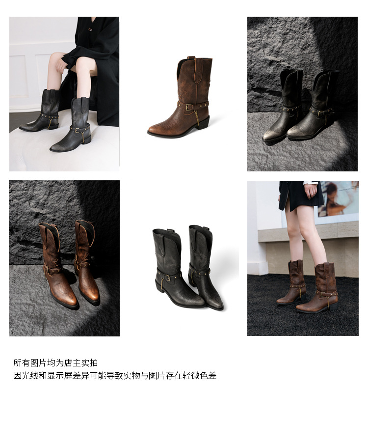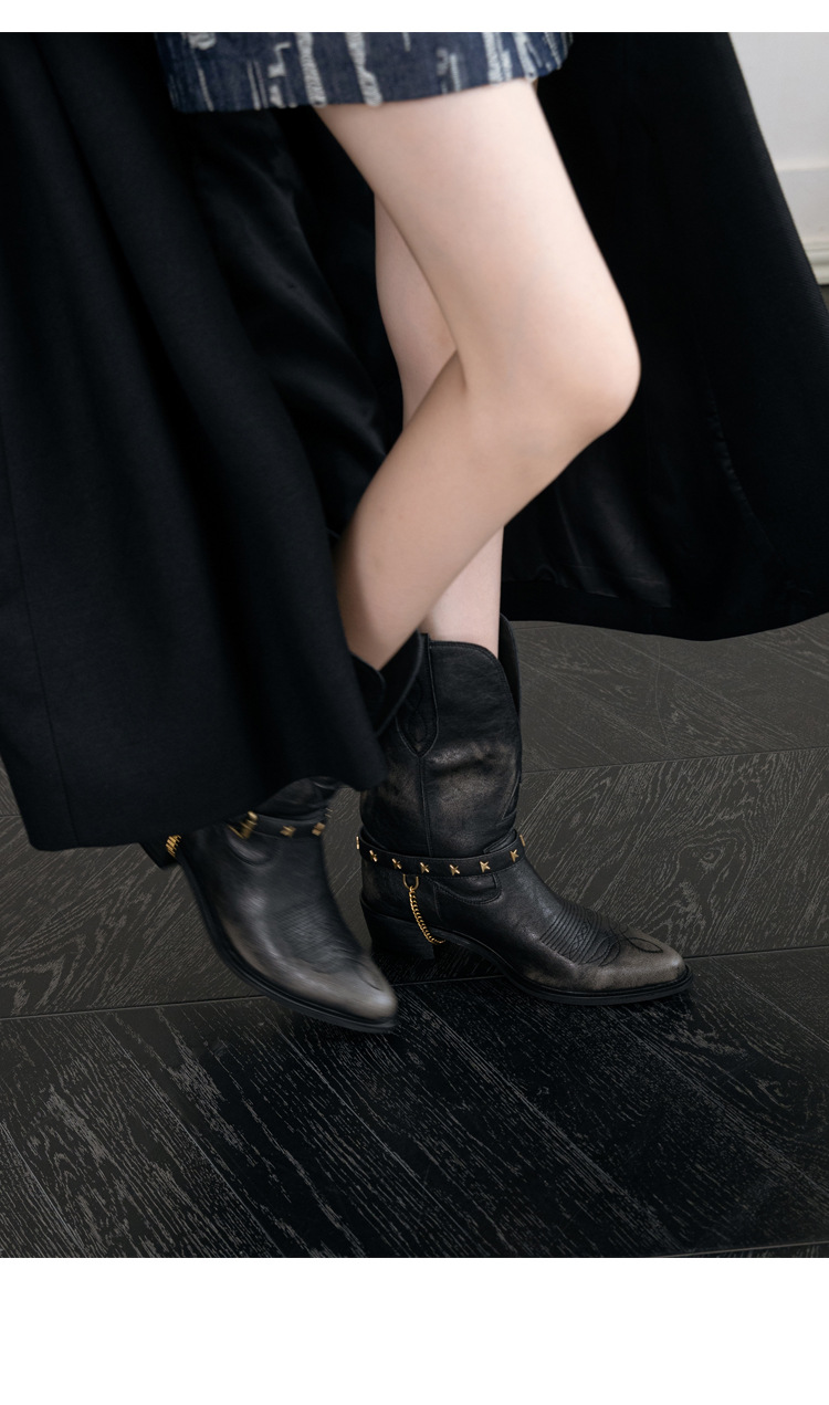 닦은 색상 고난 레트로 웨스턴 카우보이 부츠 여성 2024 새로운 V-입 포인팅 마틴 부츠 카우보이 두꺼운 힐 발목 부츠스토어 가기
