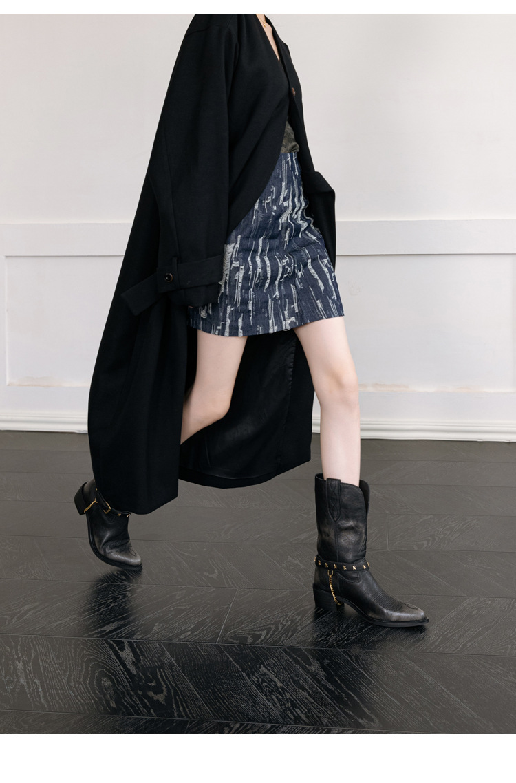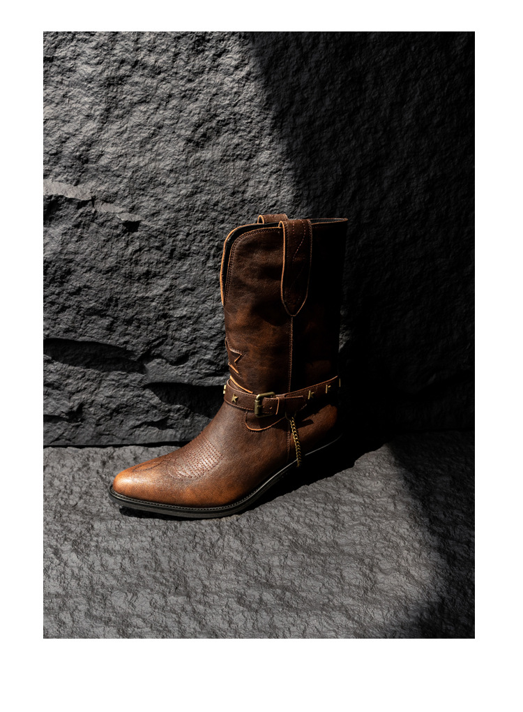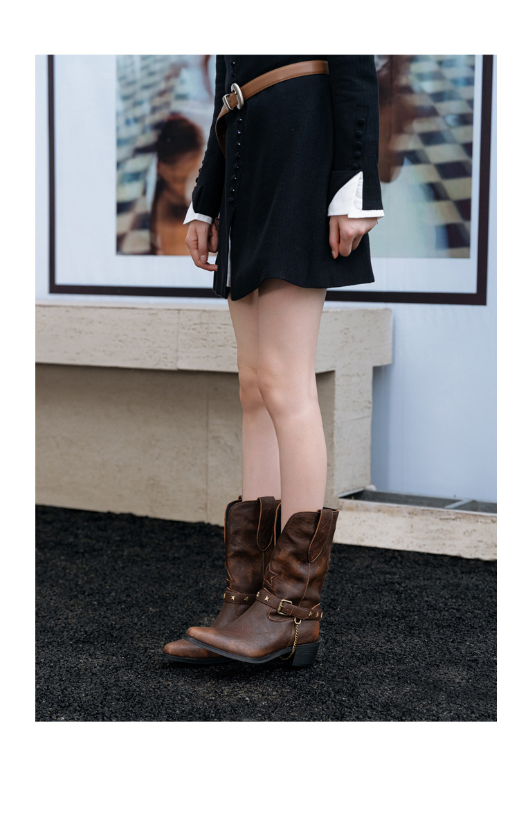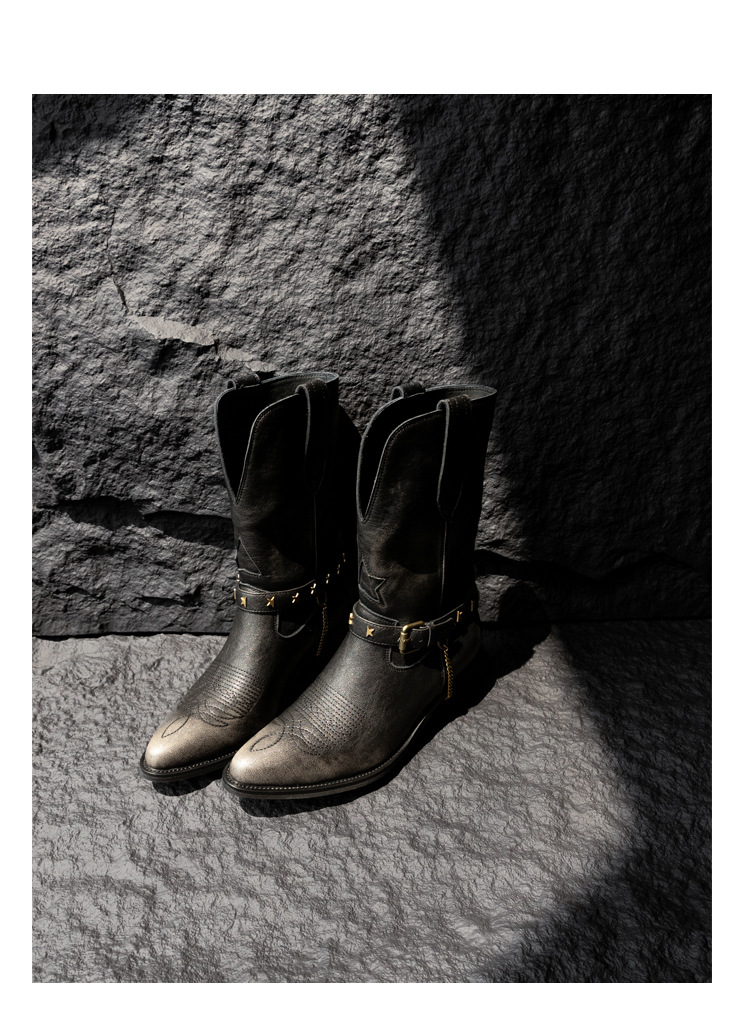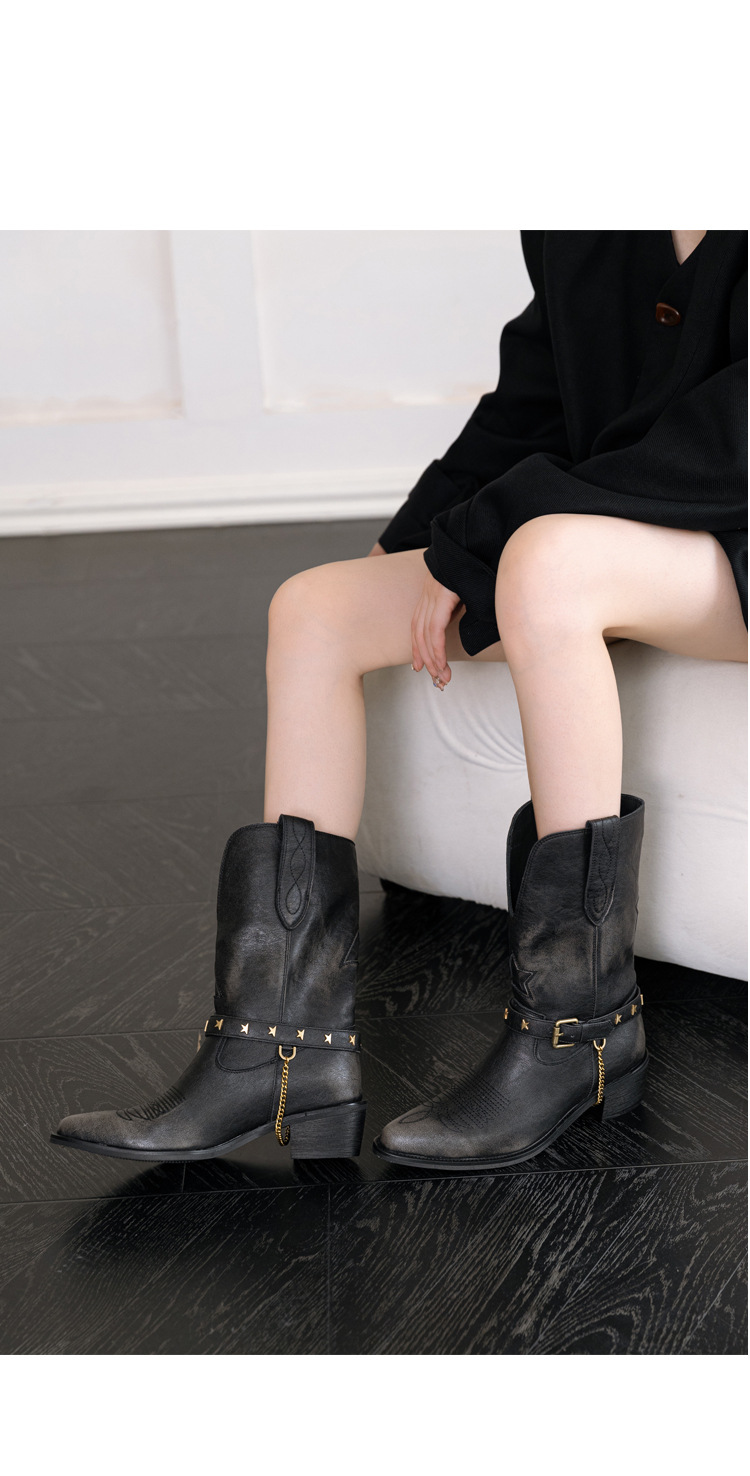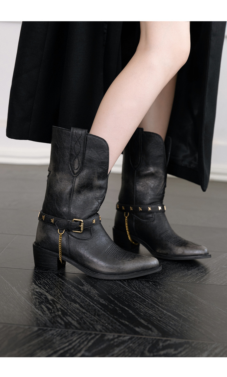닦은 색상 고난 레트로 웨스턴 카우보이 부츠 여성 2024 새로운 V-입 포인팅 마틴 부츠 카우보이 두꺼운 힐 발목 부츠