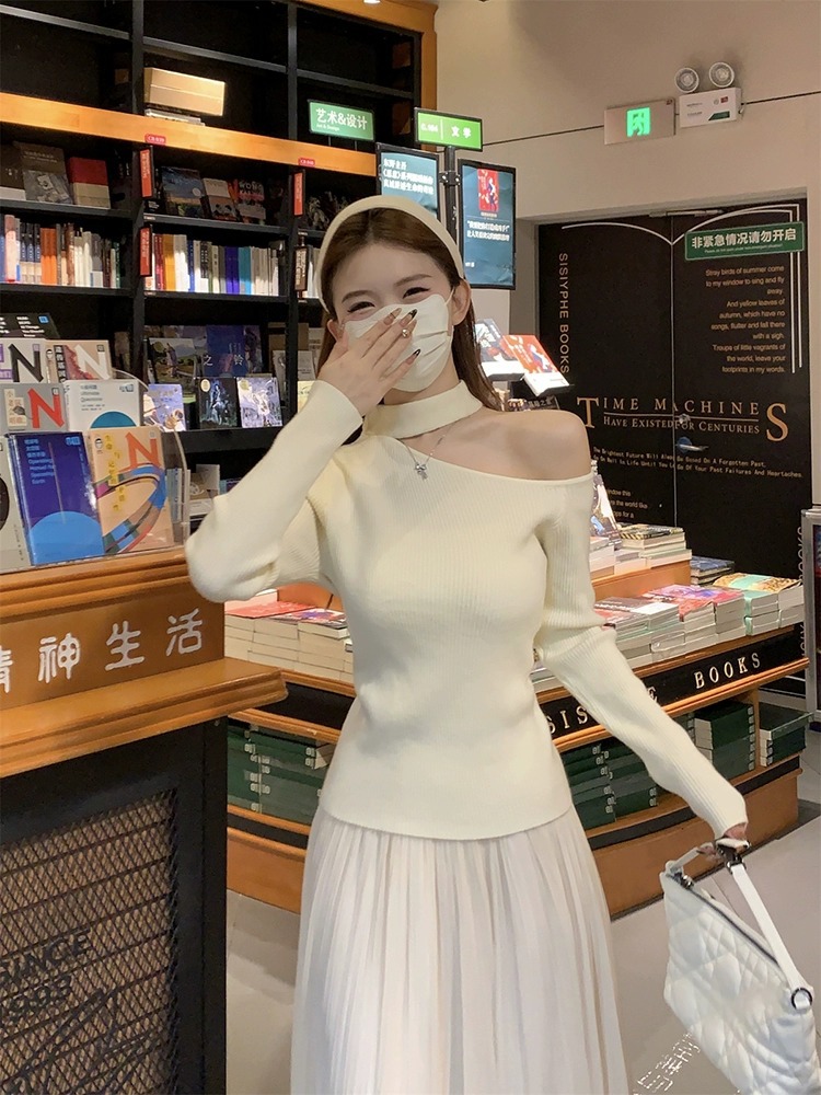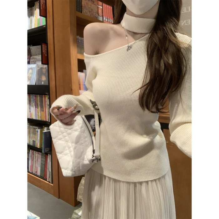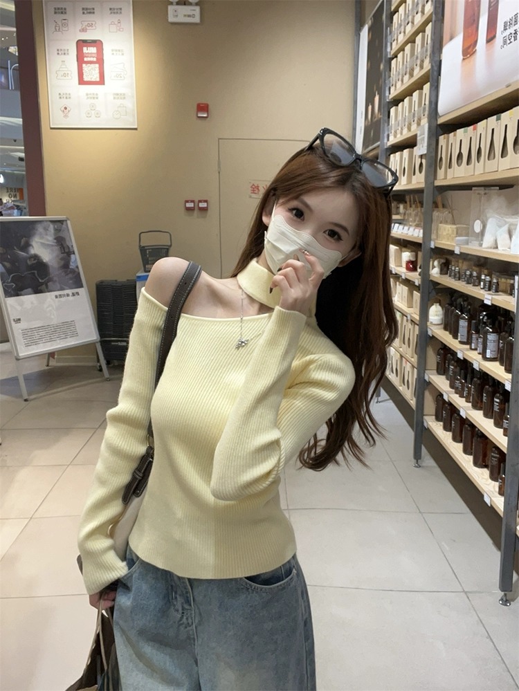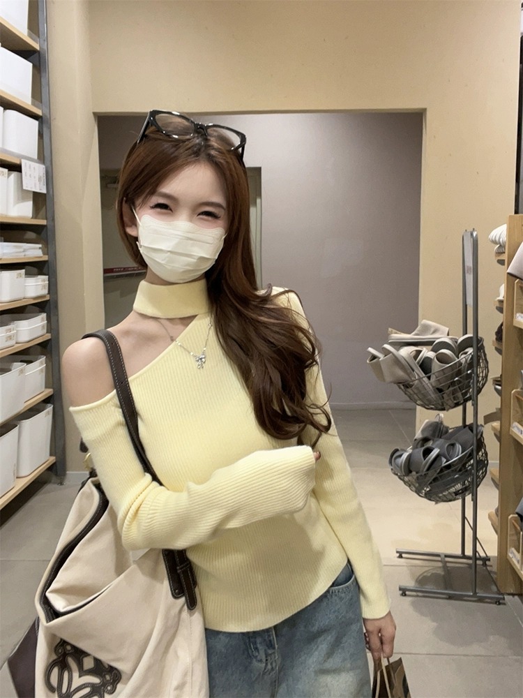 국경 도매 한국 디자인 감각 목, 어깨 슬림 기질 슬림 앤디 벨벳 긴팔 스웨터 여성용 탑