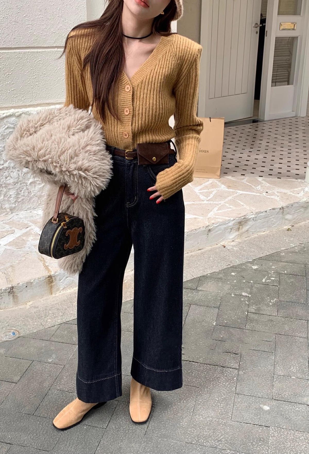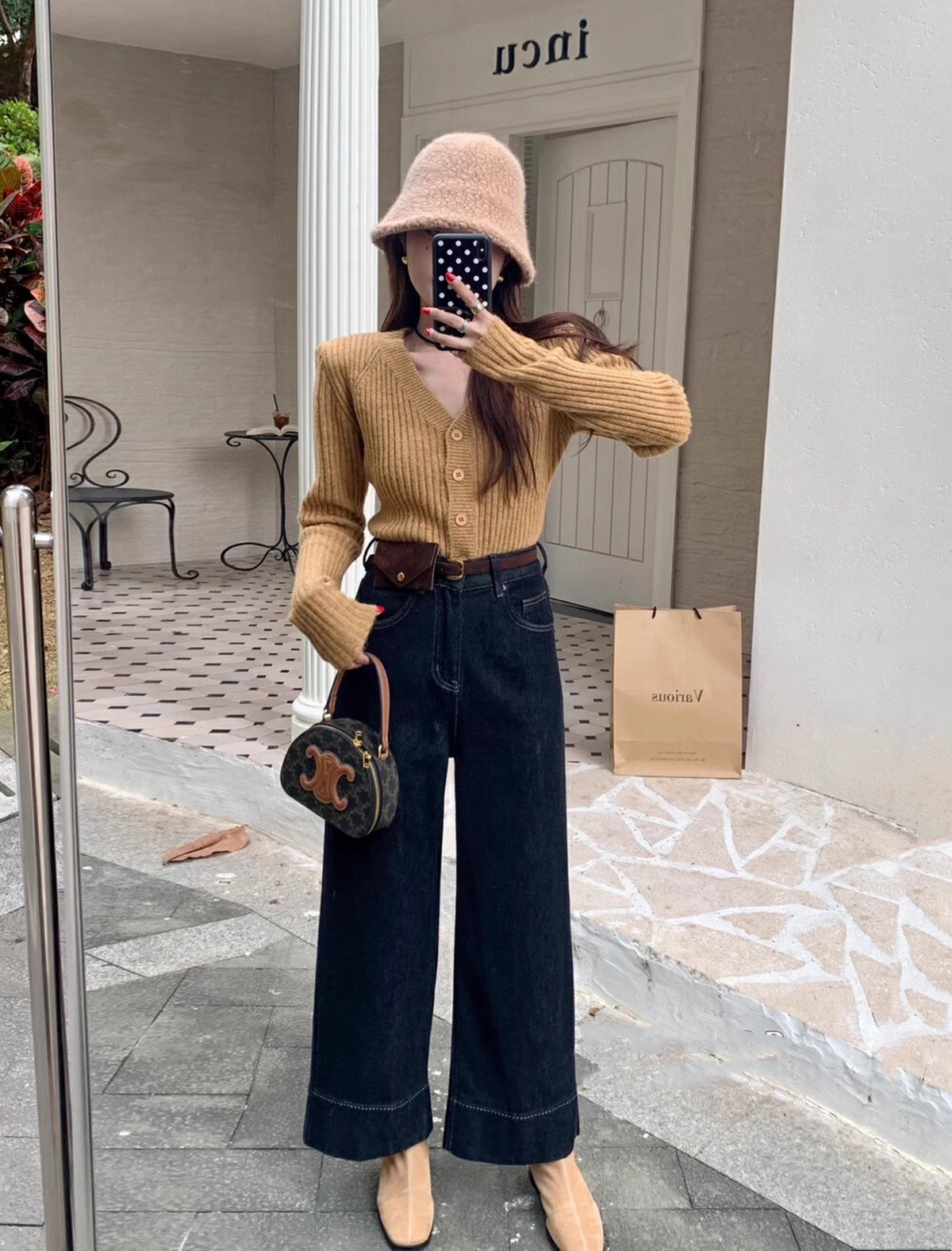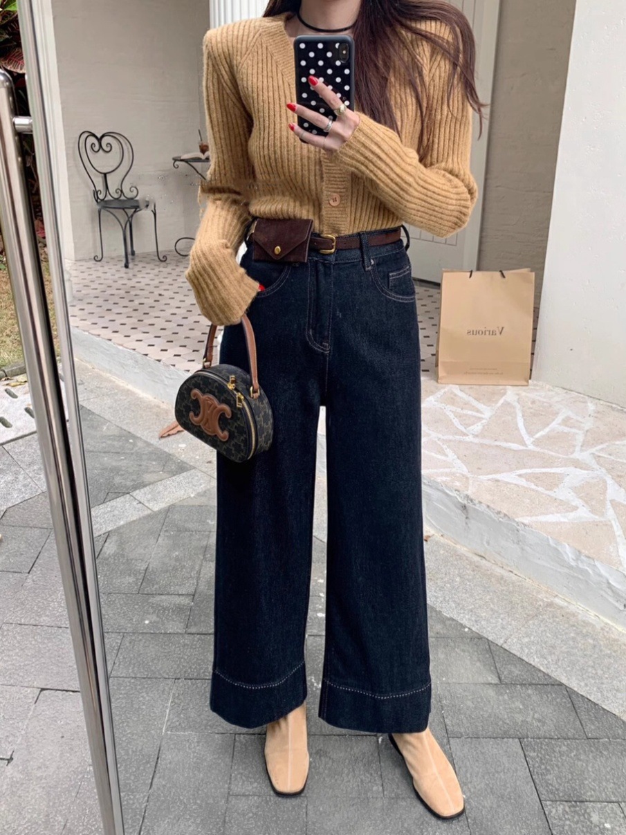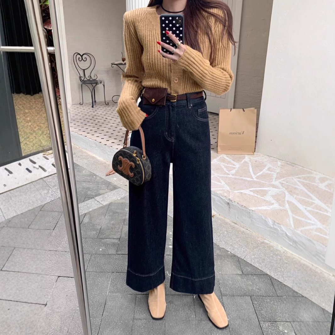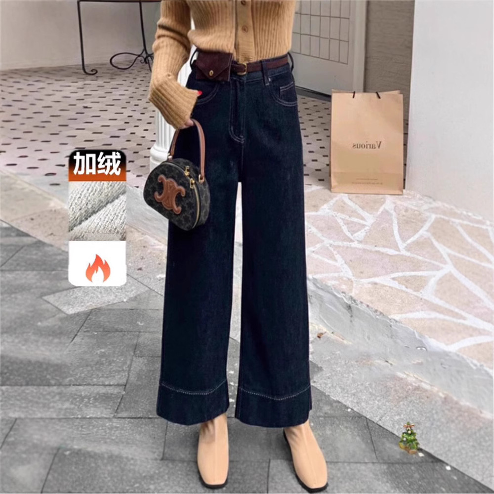 다크 블루 통근 슬림 기모 스트레이트 청바지 여성의 2024 년 가을 및 겨울 새로운 높은 허리 느슨한 자른 넓은 다리 바지스토어 가기