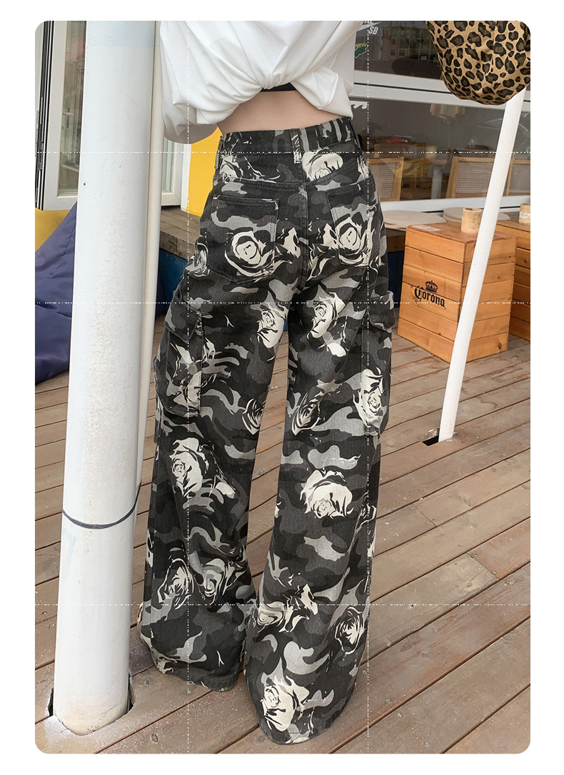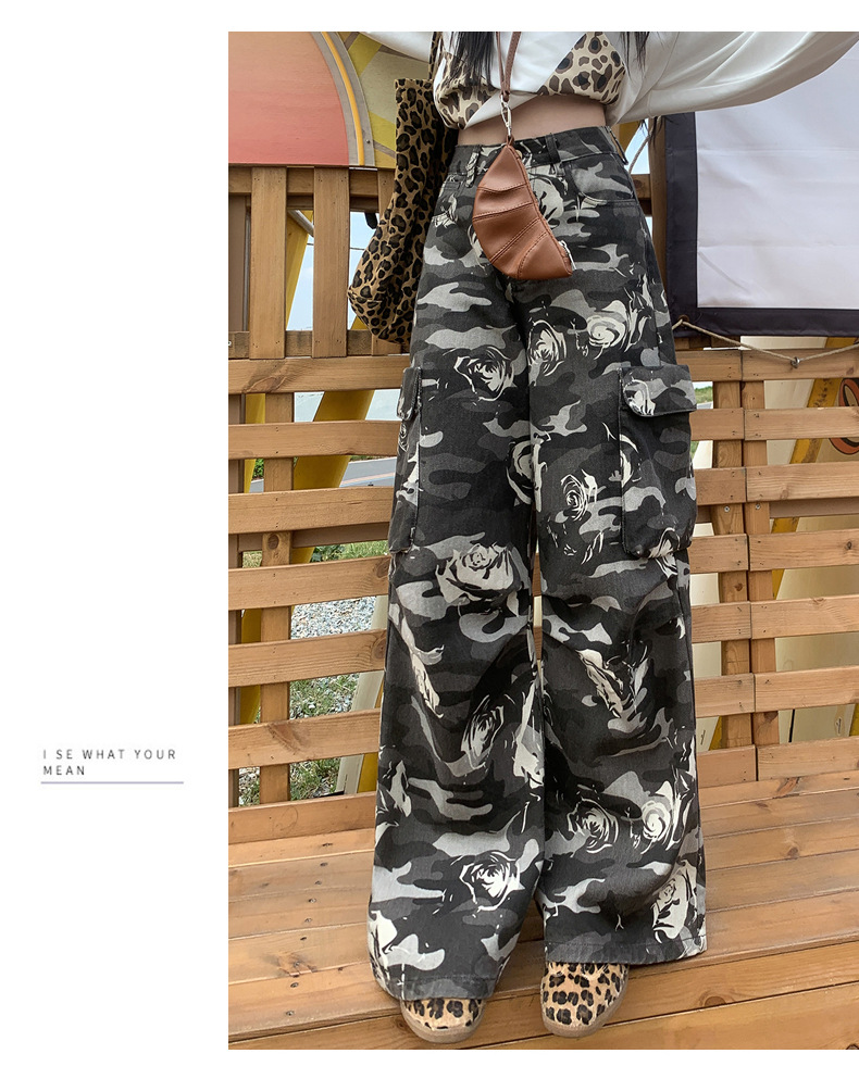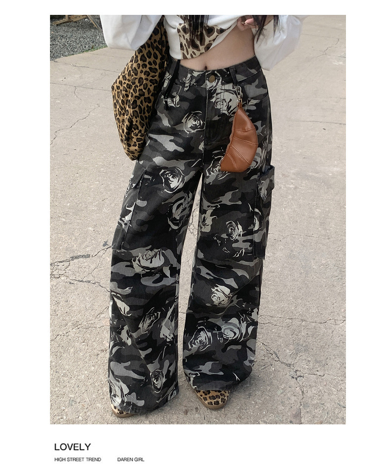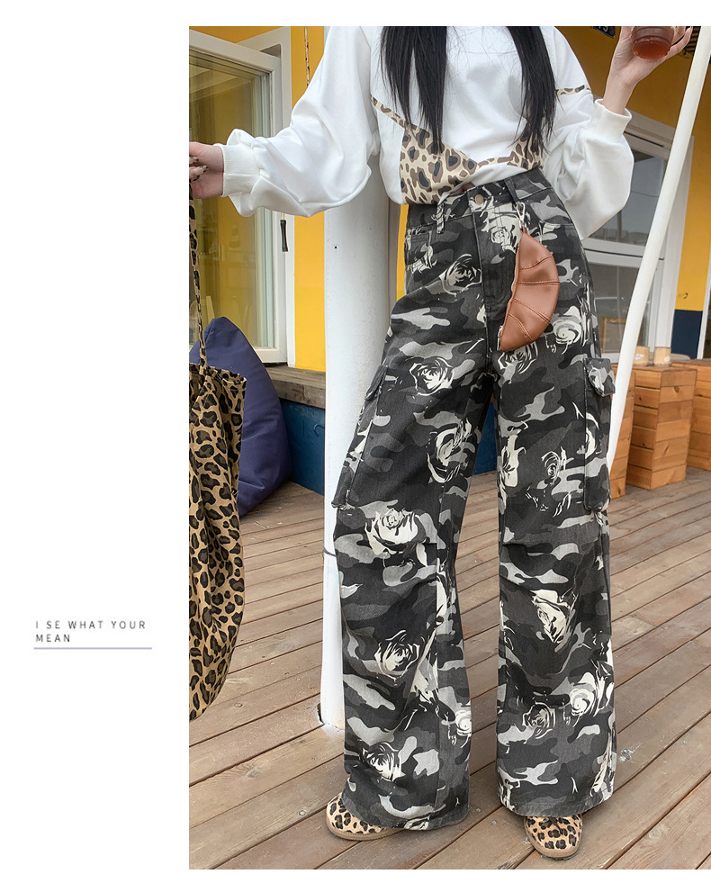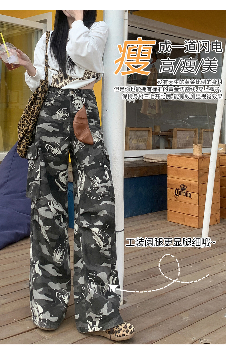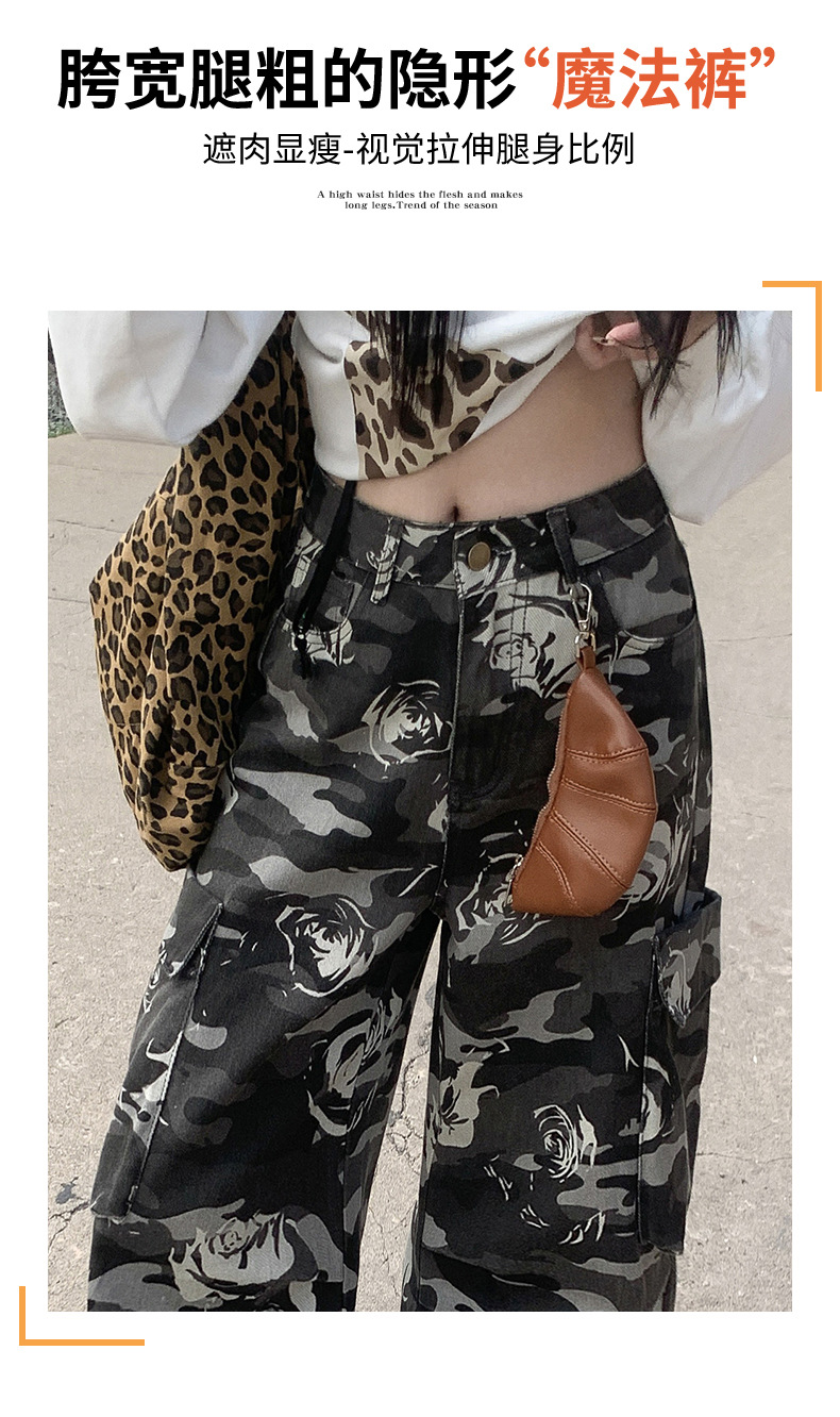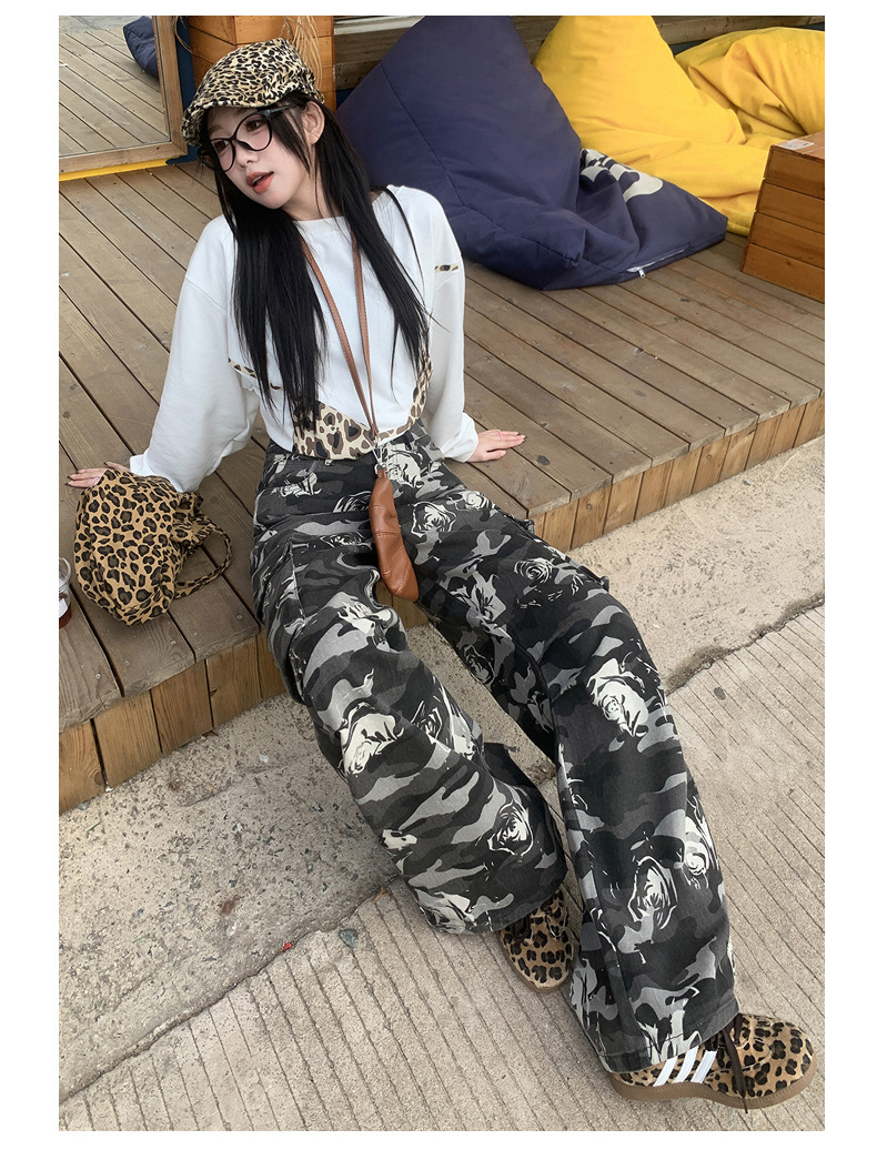 미국 위장 레트로 하이 웨이스트, 올 매치 스트레이트 청바지, 여자 2025 년 봄 새로운 캐주얼 군중 바지스토어 가기