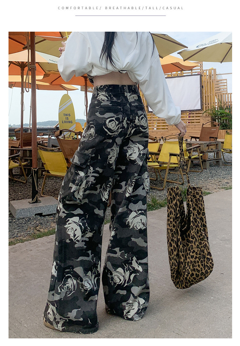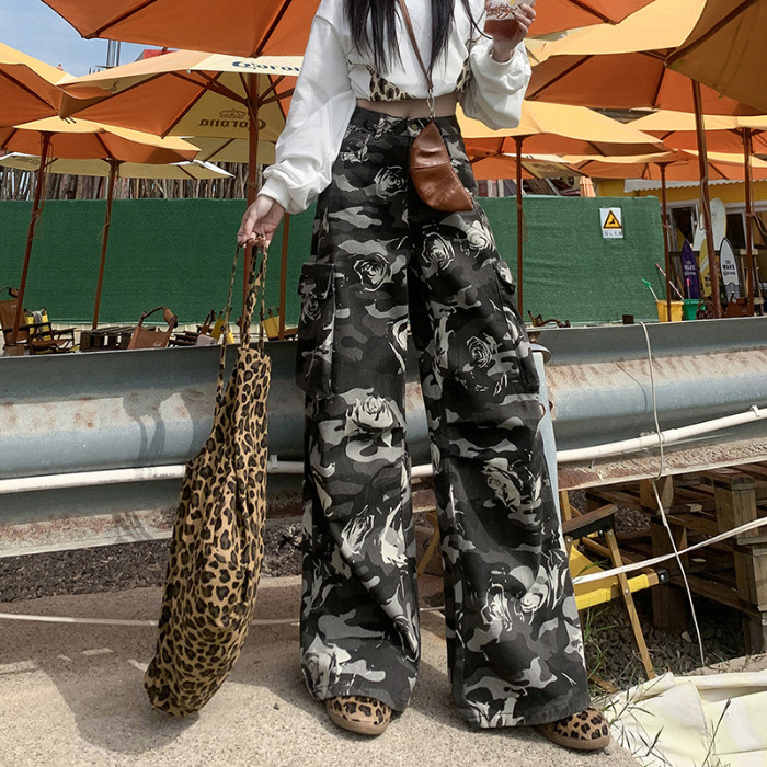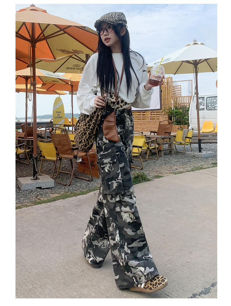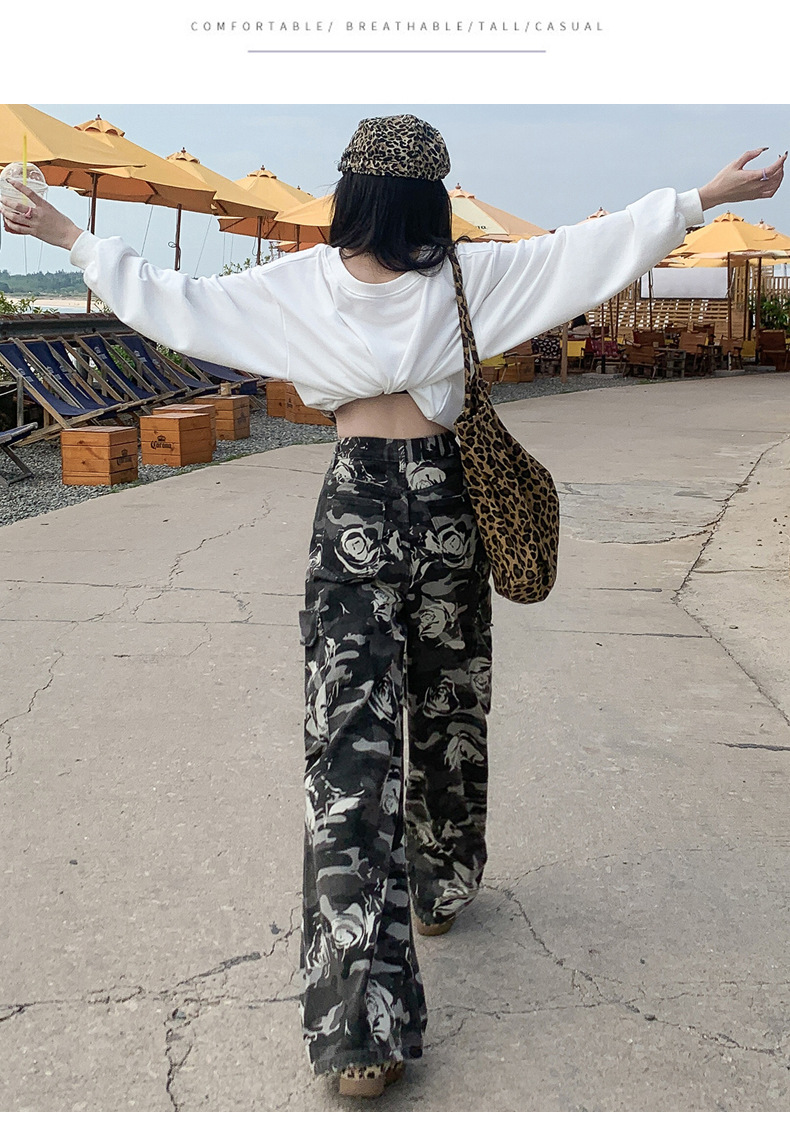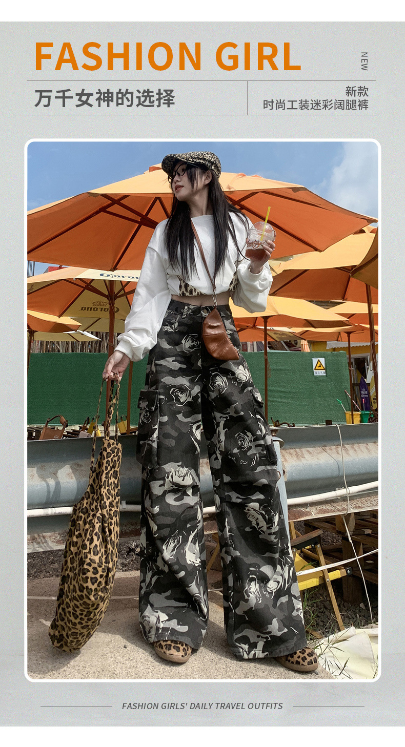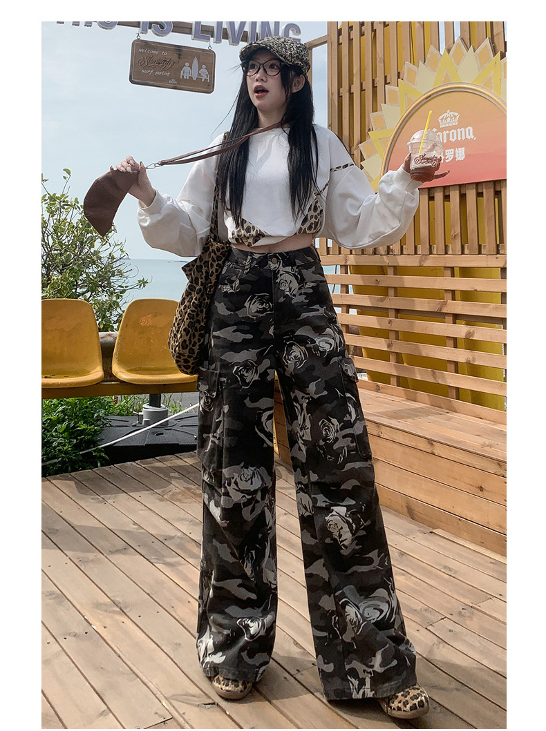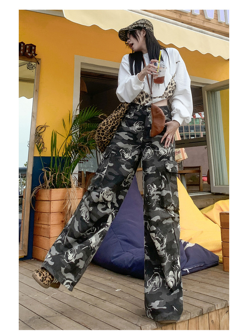 미국 위장 레트로 하이 웨이스트, 올 매치 스트레이트 청바지, 여자 2025 년 봄 새로운 캐주얼 군중 바지스토어 가기