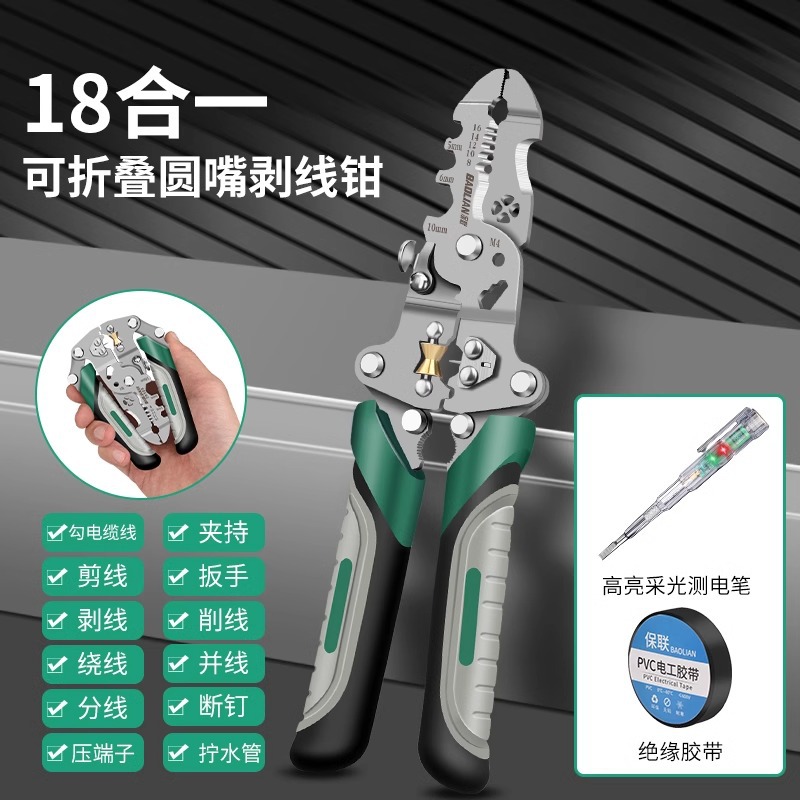 • [18-in-1] 둥근 입 와이어 스트리퍼 + 고휘도 조명 테스트 펜 + 절연 테이프