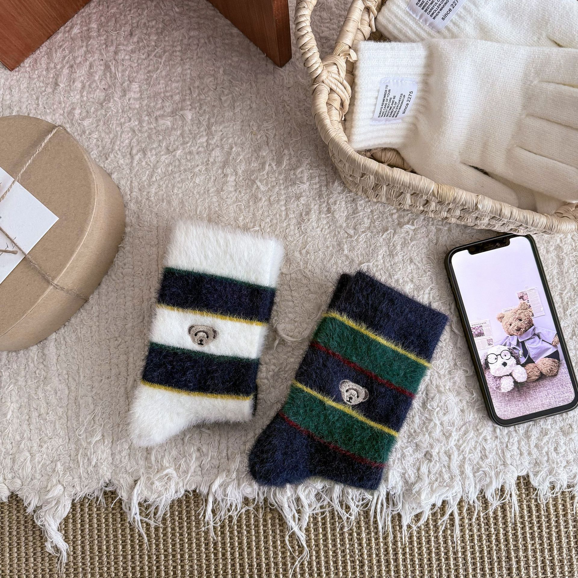 한국 동대문 겨울 두꺼운 밍크 머리 줄무늬 자수 곰 귀여운 달콤한 뷰티 양말스토어 가기