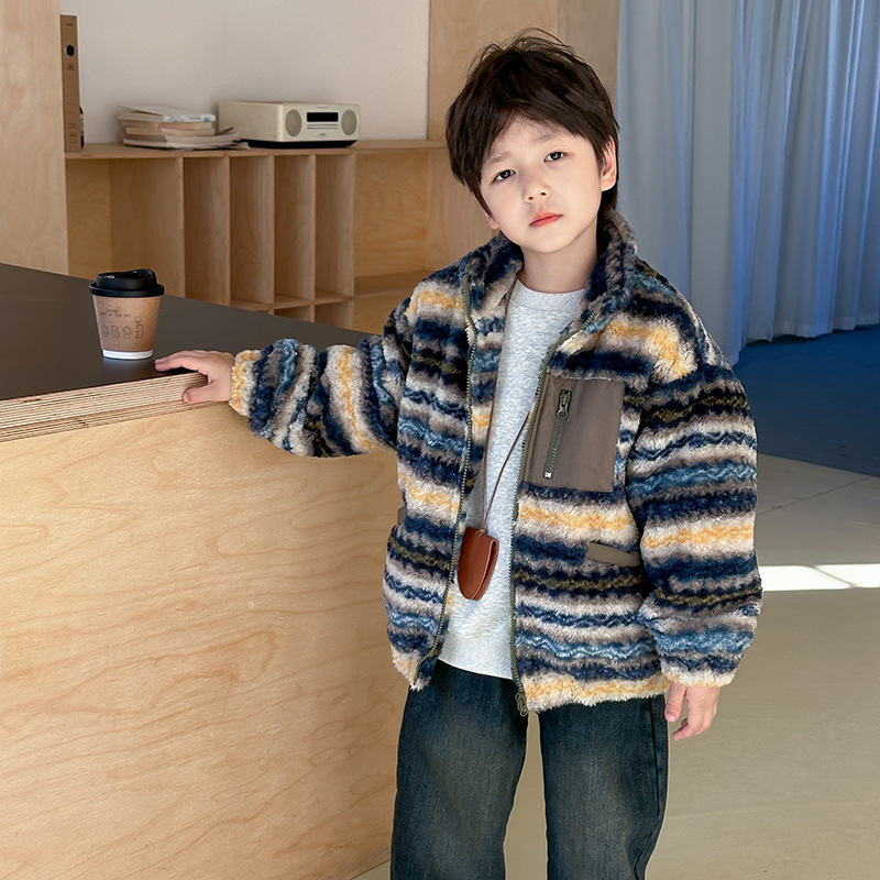 [클리어아웃 세일] 어린이 페어 아일 플러시 재킷, 중대형 어린이 따뜻하고 두꺼운 모조 실크 면 스트라이프 면 재킷
