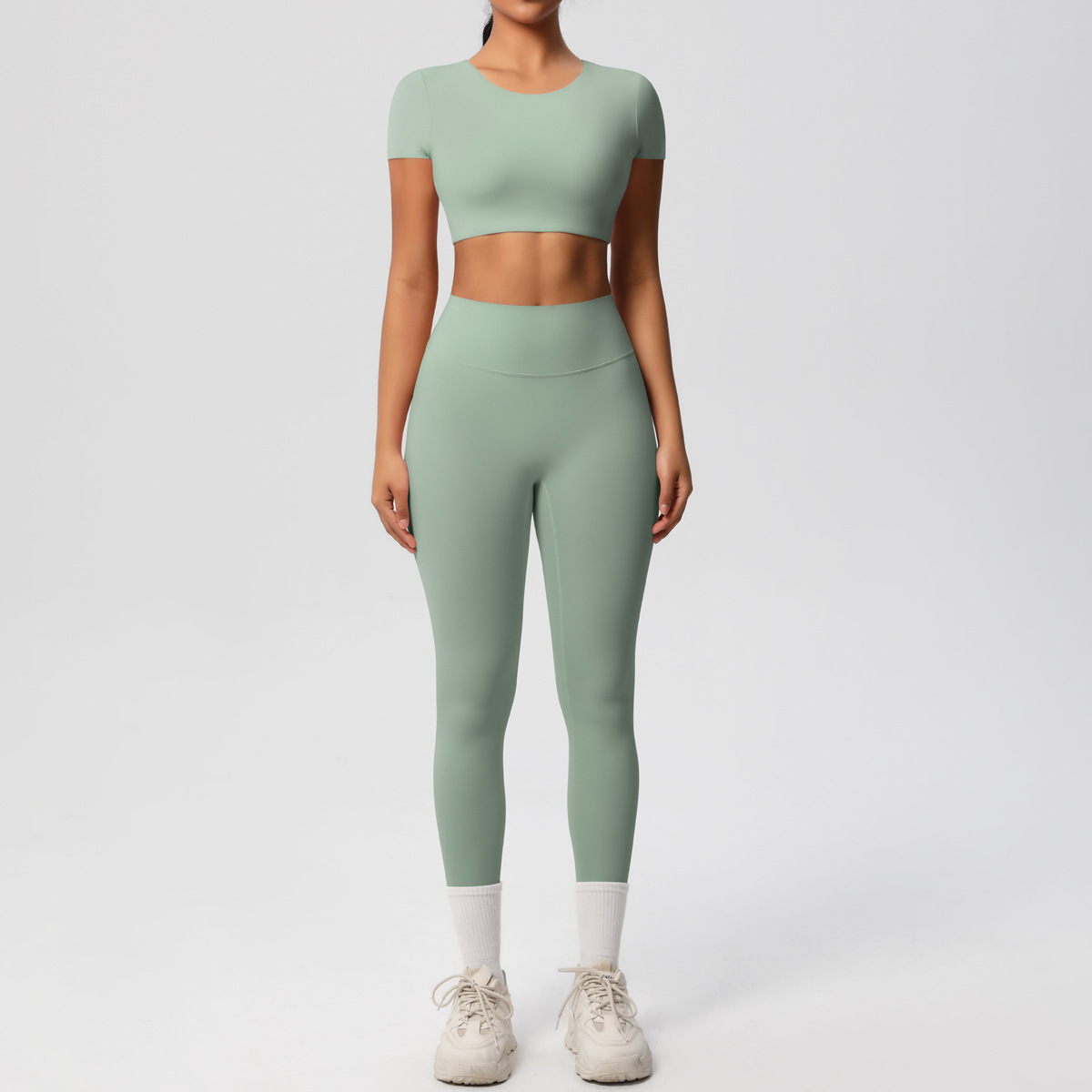 재고 있음, 크로스보더 양면 나일론 기모 누드감 타이트 스포츠 요가복 세트, 러닝 피트니스 반팔 투피스 세트스토어 가기