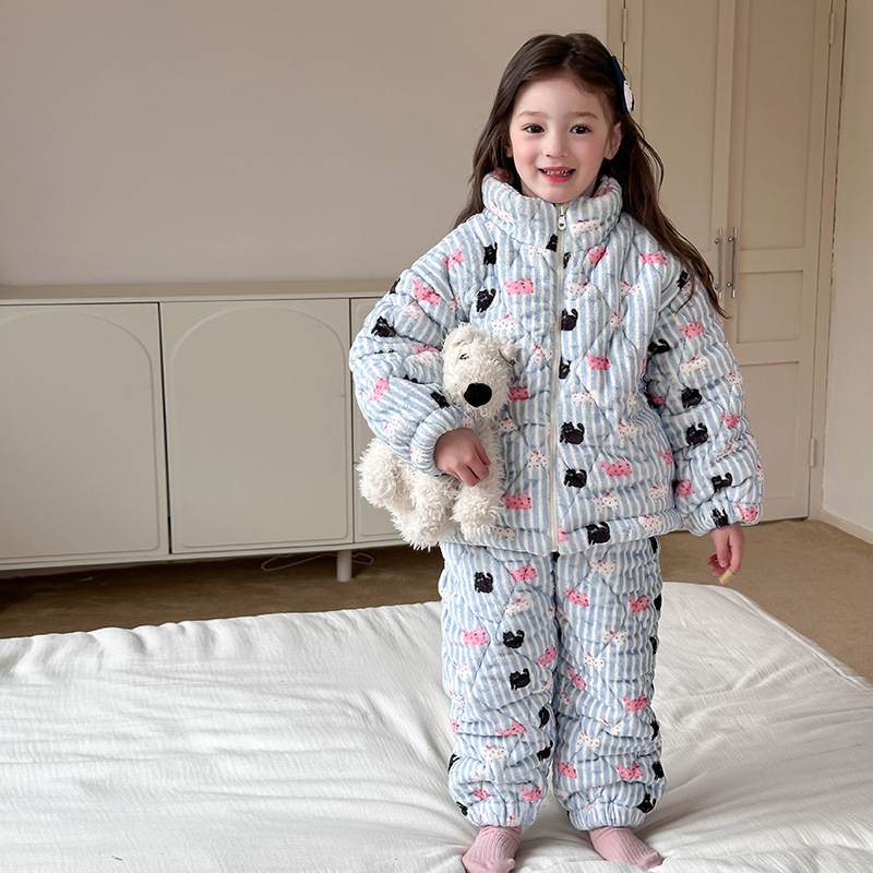 【클리어런스 세일】2024 겨울 두꺼운 플리스 홈웨어 아기용 파라플리스 실크 느낌 면 만화 캐릭터 잠옷 세트