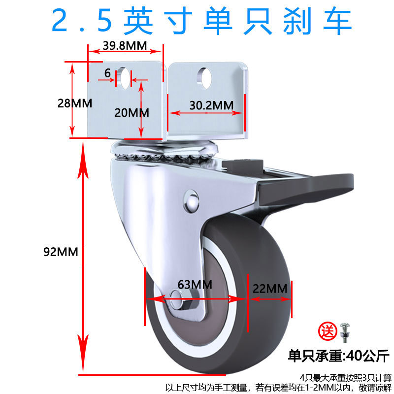 • 1.5inch 브레이크 휠 1개(U 부목 내부 폭 25MM)