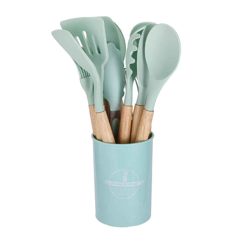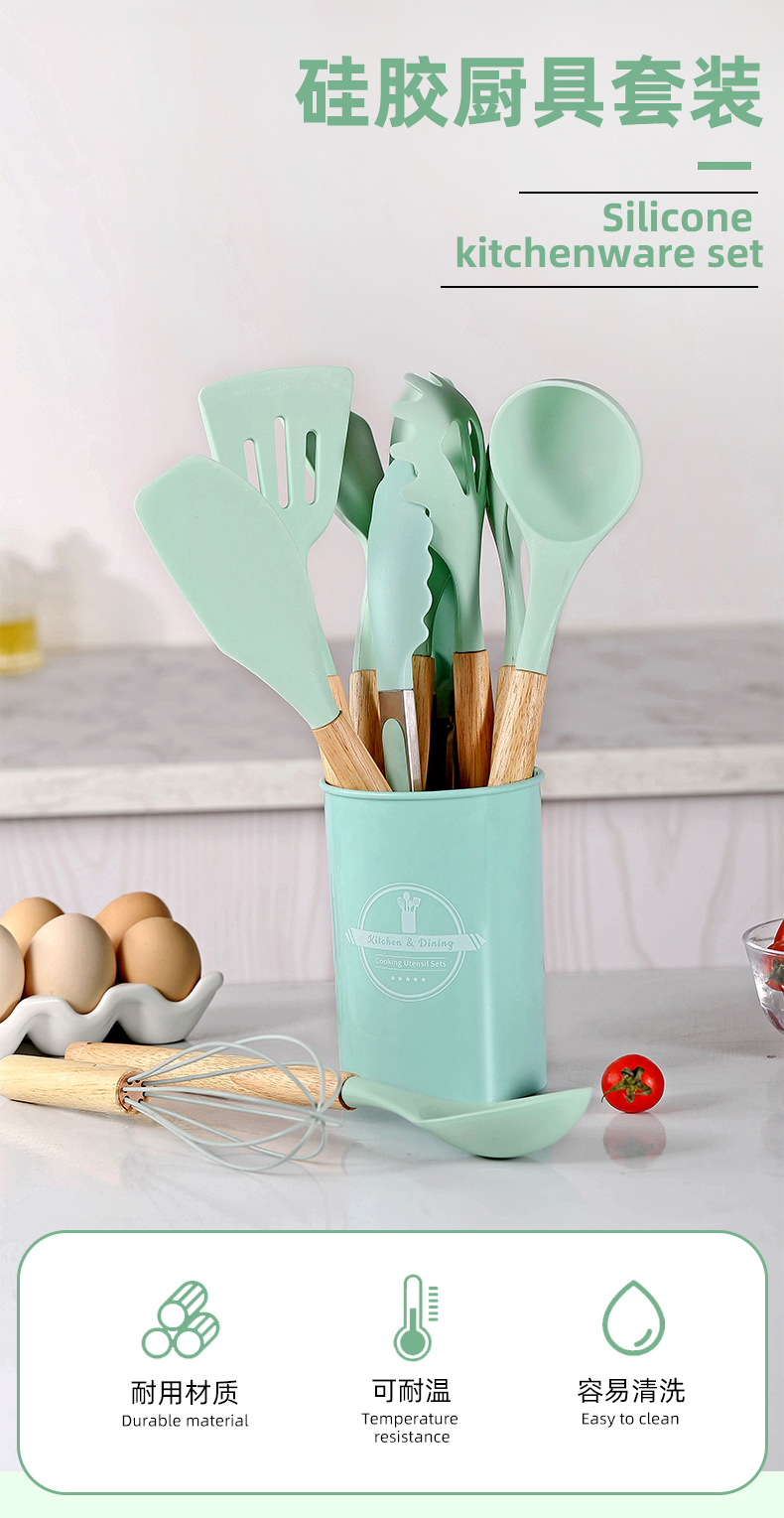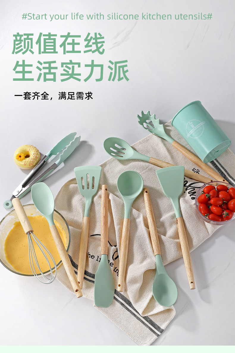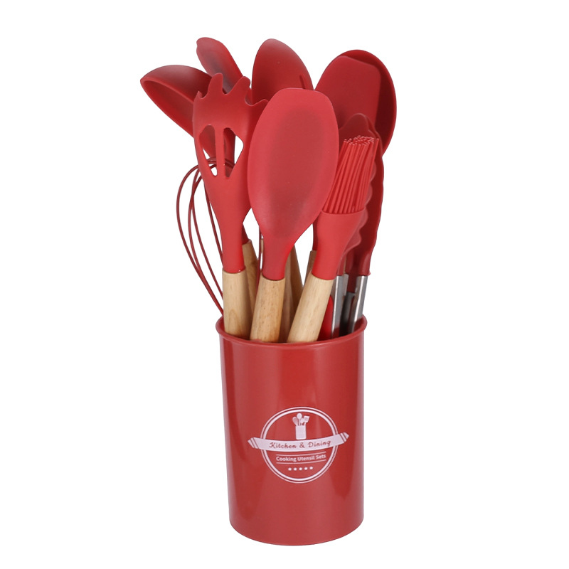 750g 재고 실리콘 주방 용품 12 pce 세트 나무 손잡이 주방 비 스틱 주걱 요리 도구 주방 세트