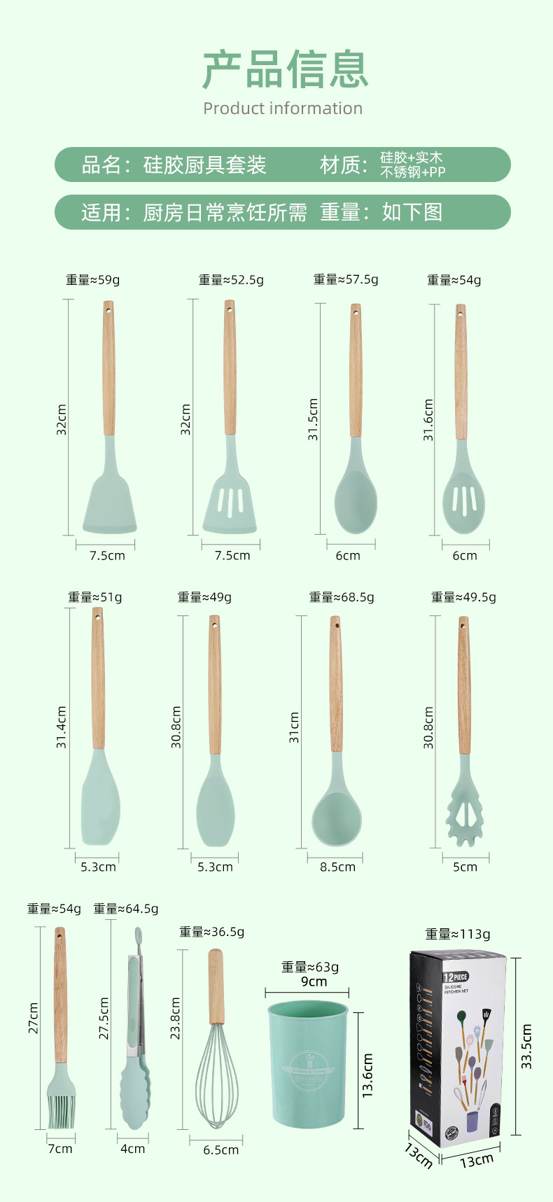 • 라이트 그린 - 실리콘 주방용품 12종 세트(통, 컬러박스 포함 750g)
