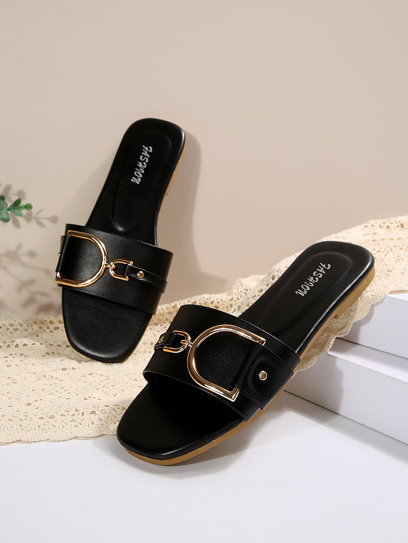국경 간 여성 신발 여성의 새로운 패션 슬리퍼 클래식 기질 올 매치 단색 금속 장식 사각형 평면 샌들스토어 가기