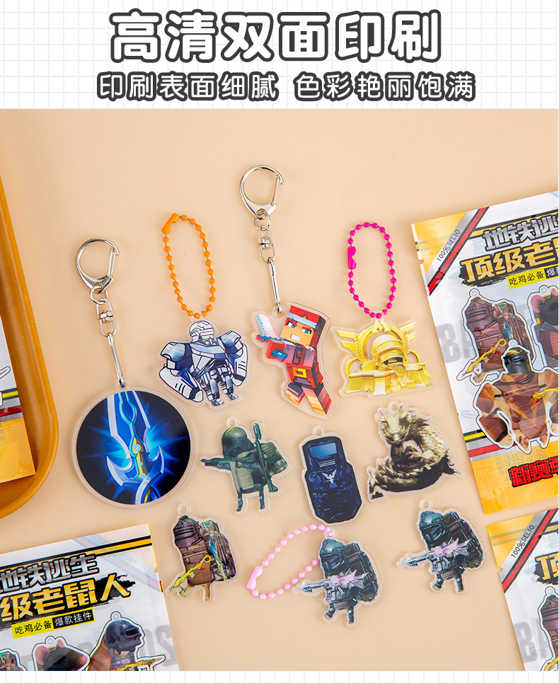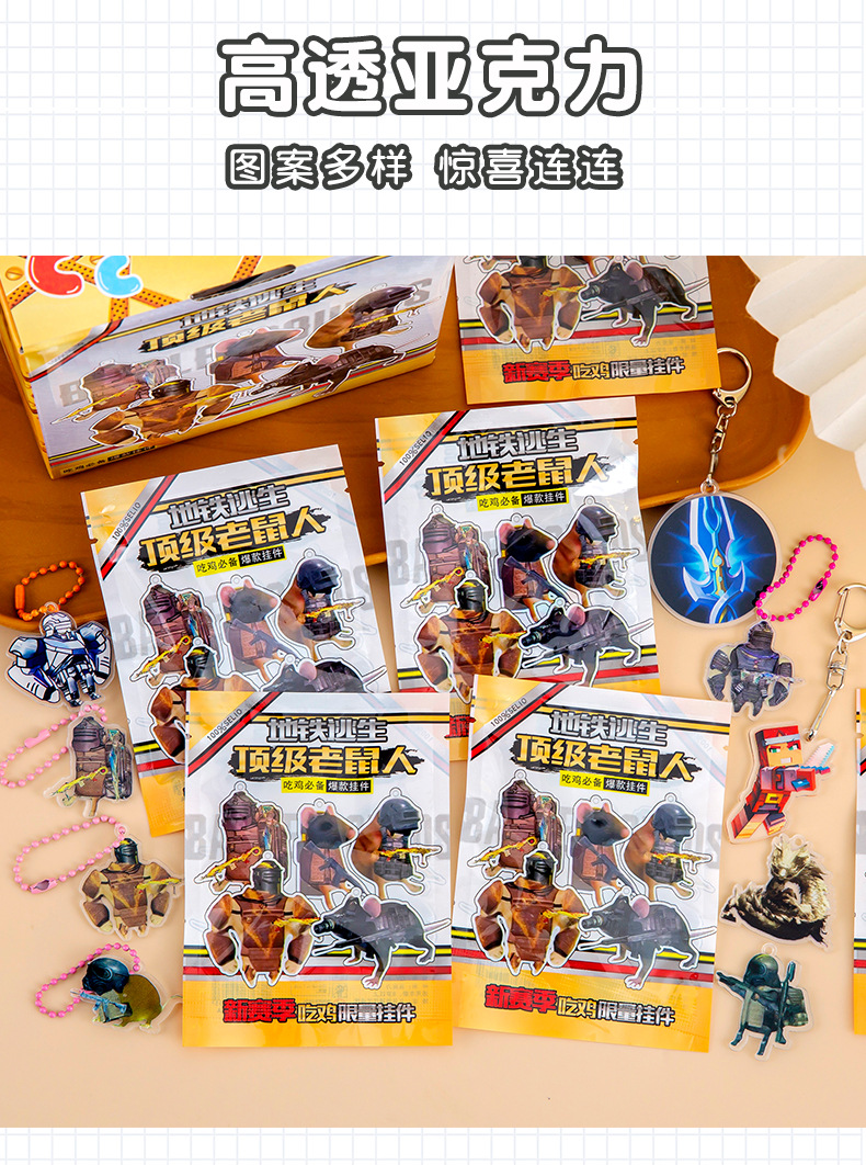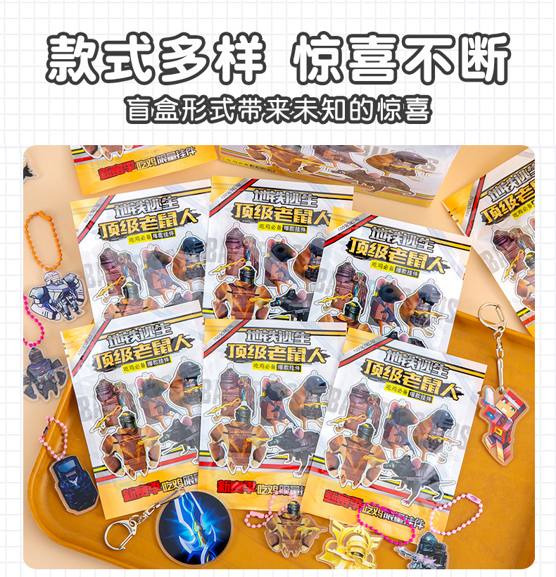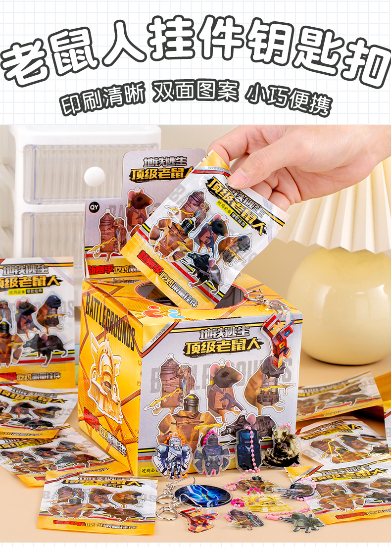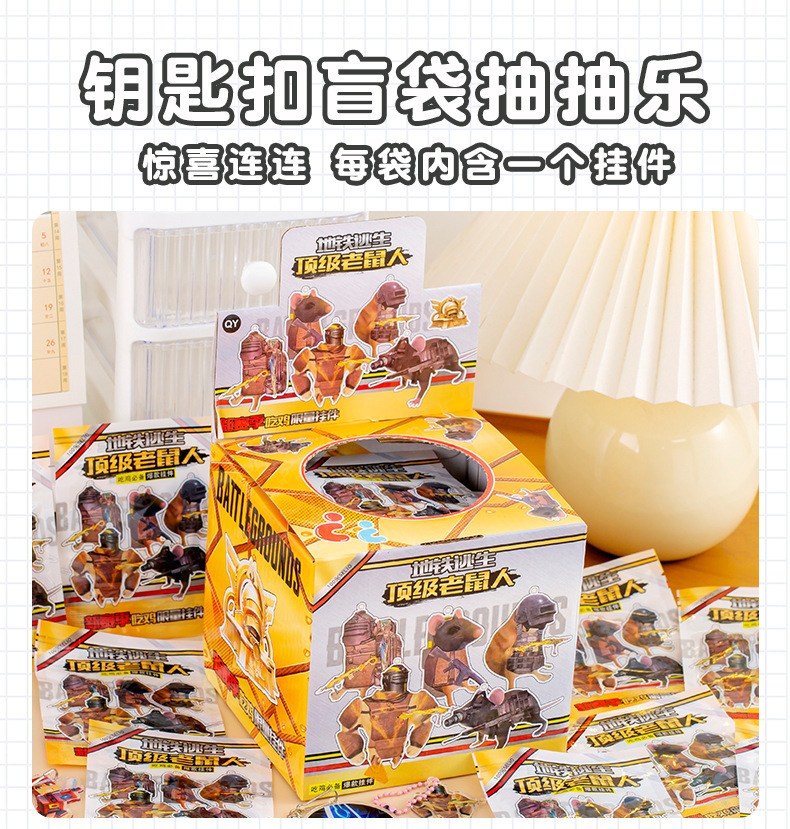 内含:老鼠人系列珠链2个/包,吃鸡系列钥匙扣1个/包,每盒两款混装