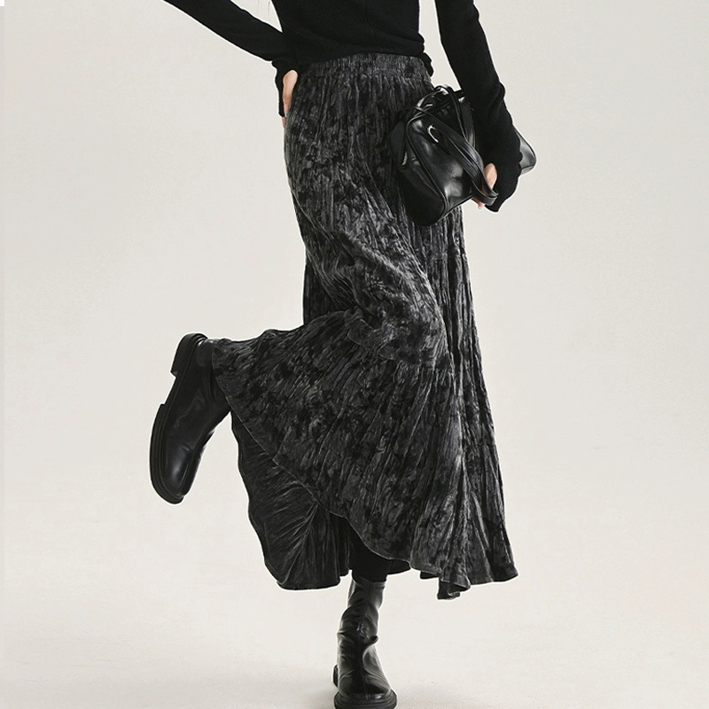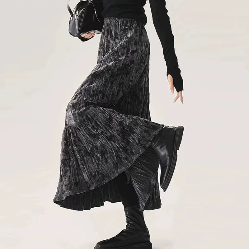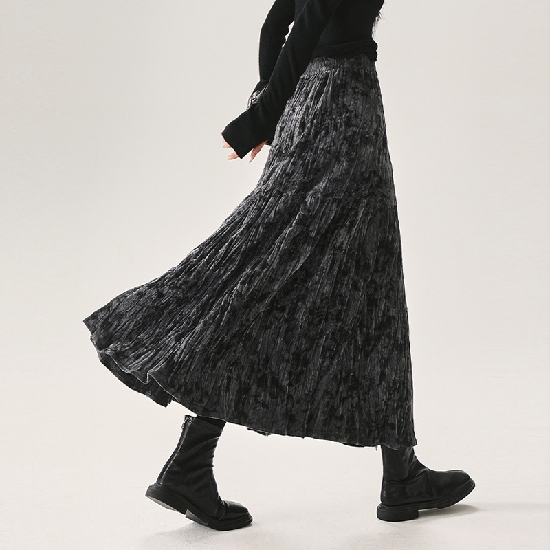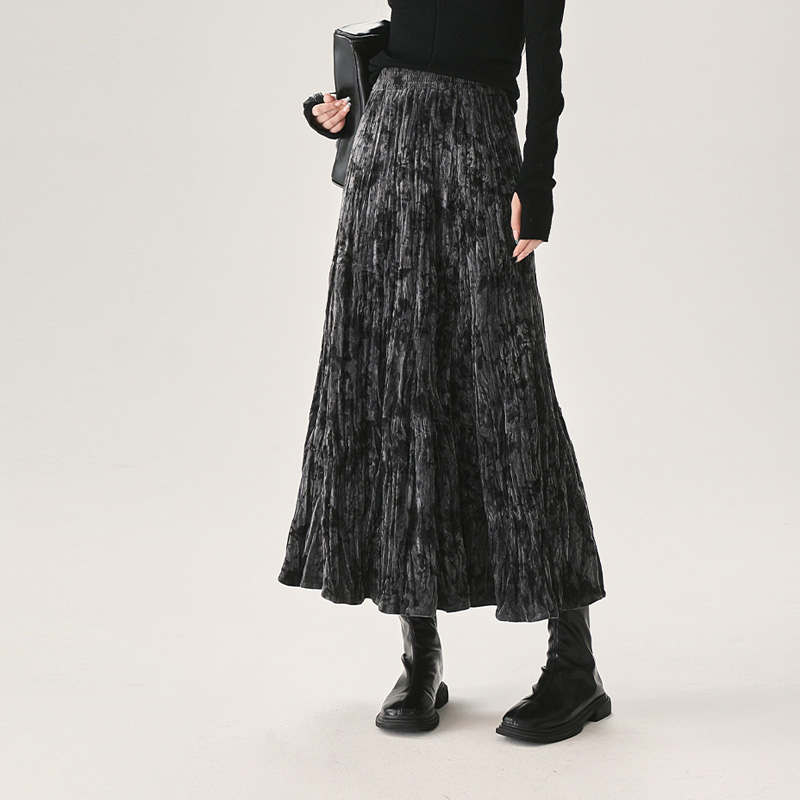 긴 벨벳 주름 질감 두꺼운 우산 스커트 여성의 가을과 겨울 빈티지 중국 스타일 잉크 주름 치마스토어 가기