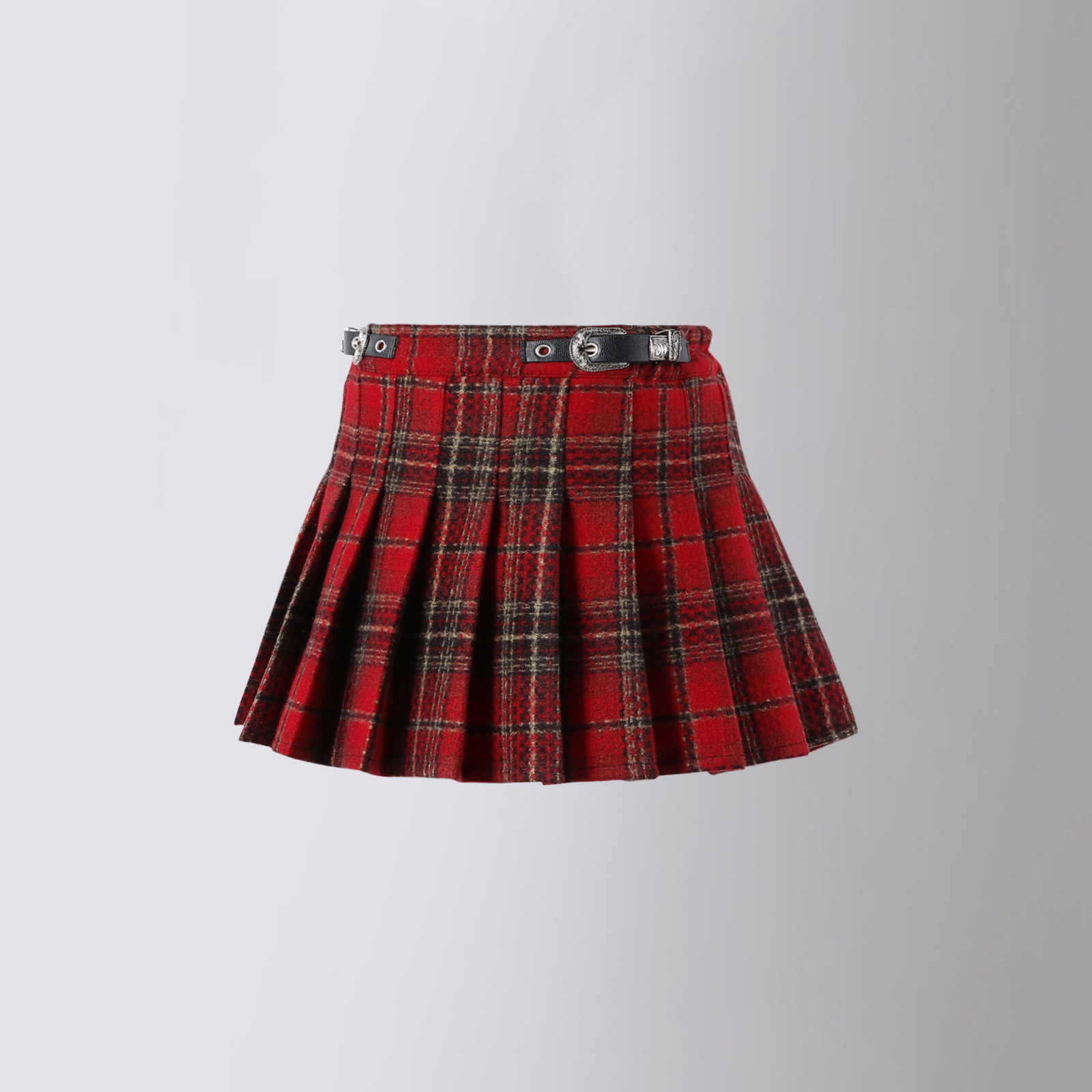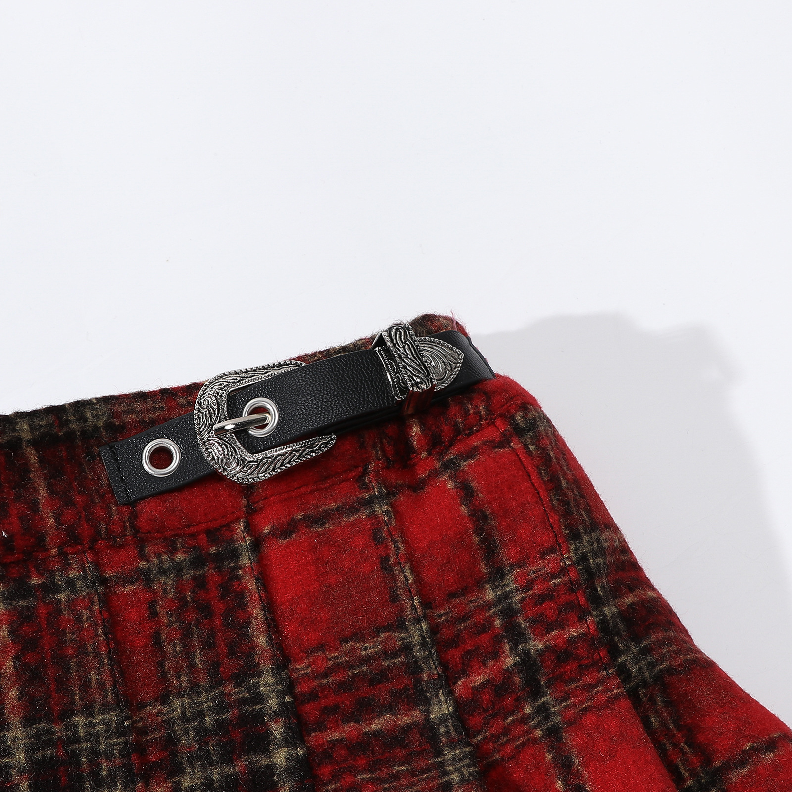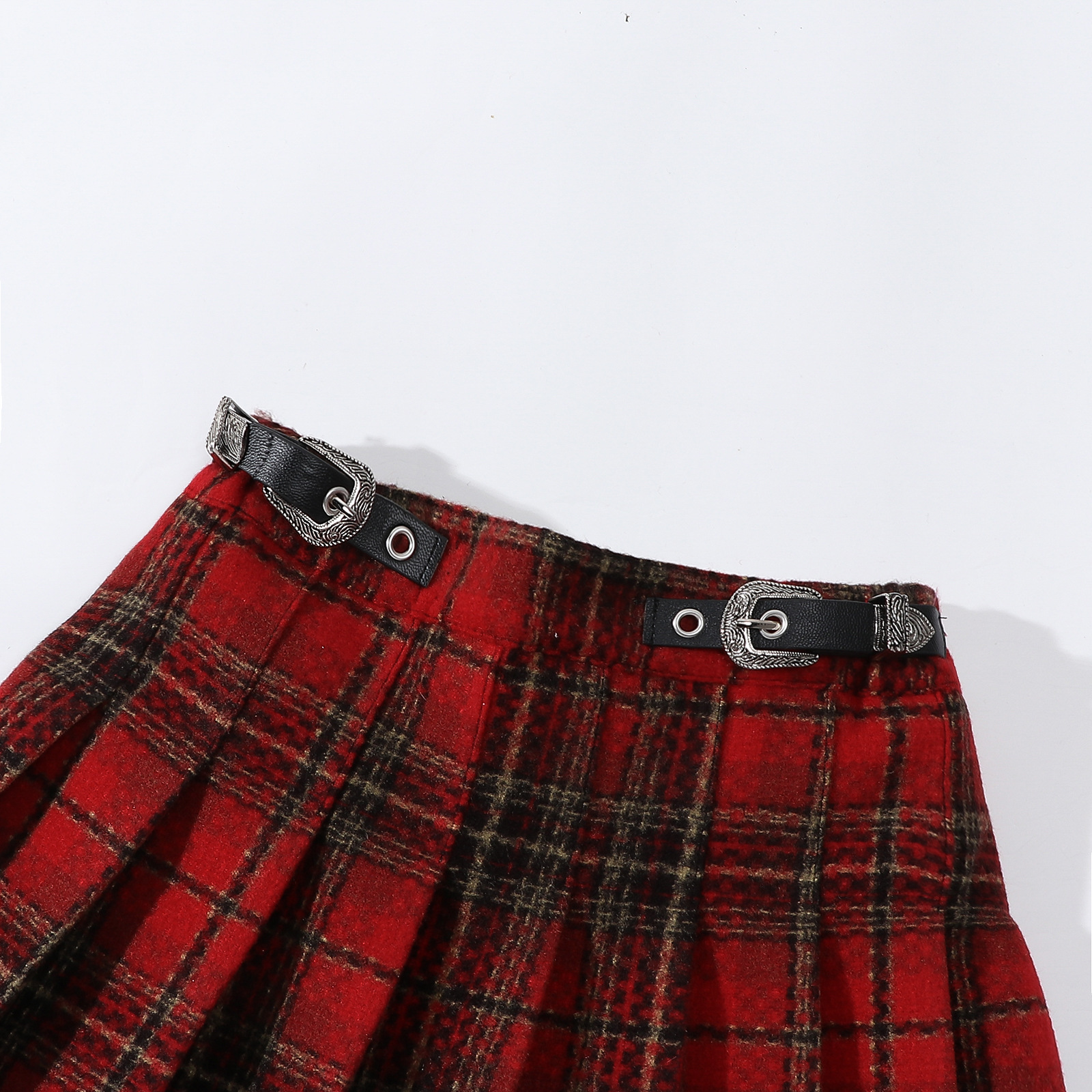 소녀의 봄과 가을 주름 치마 2024 크리스마스 격자 무늬 가죽 버클 A-라인 높은 허리 디자인 틈새스토어 가기