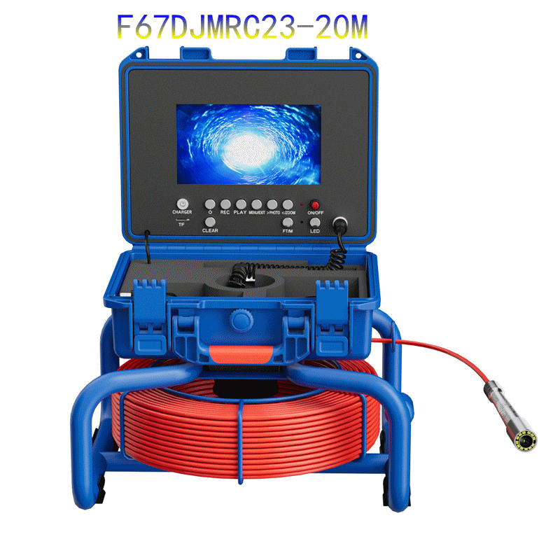 型号:F67DJMRC23:7寸AHD录像屏,带计米器,直径23mm不锈钢探头蓝宝石镜片,高清1080P,镜头角度145度,20米-30米管道内窥镜,4500MA内置电池,带电量显示,12个白光灯,带摄像头保护套2种,送16G卡。5MM红色线缆。