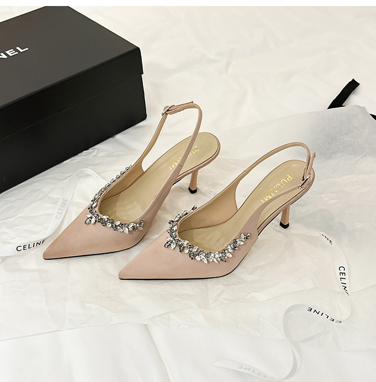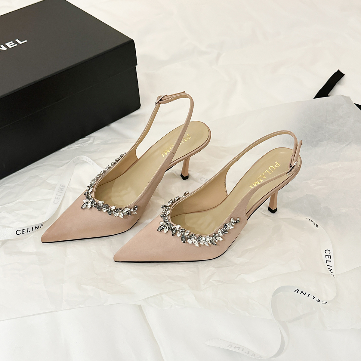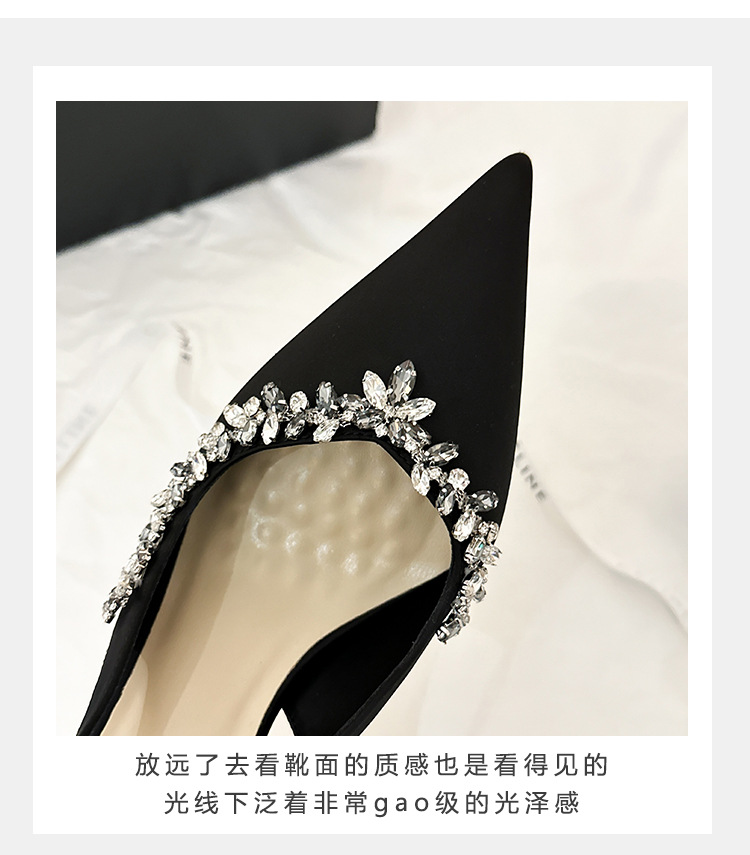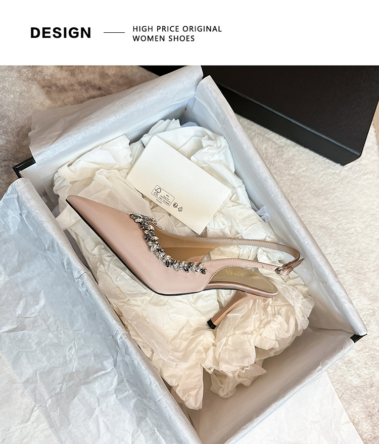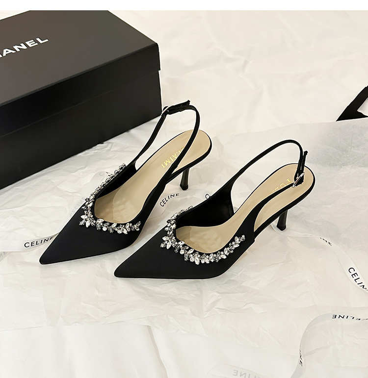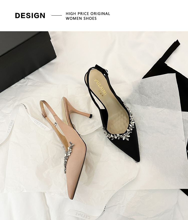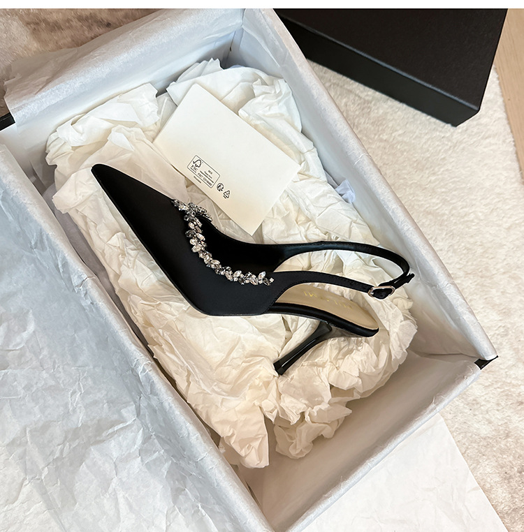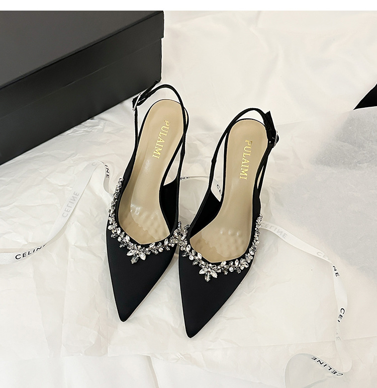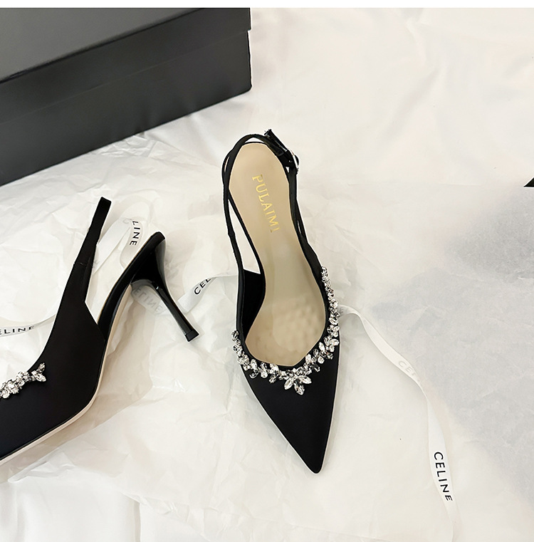 2025 라인스톤 하이힐 슈즈 새틴 스틸레토 힐 포인티드 발가락 프렌치 싱글 레이어 슈즈 여성용 반썰매 샌들스토어 가기