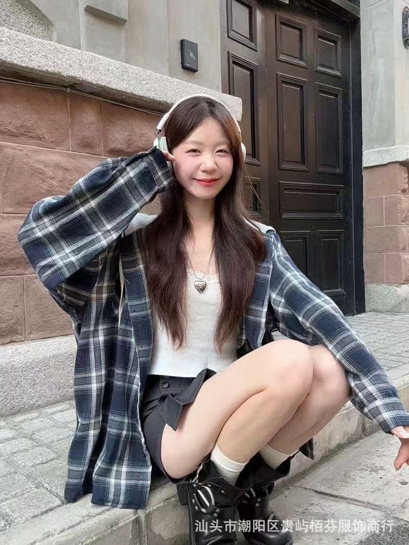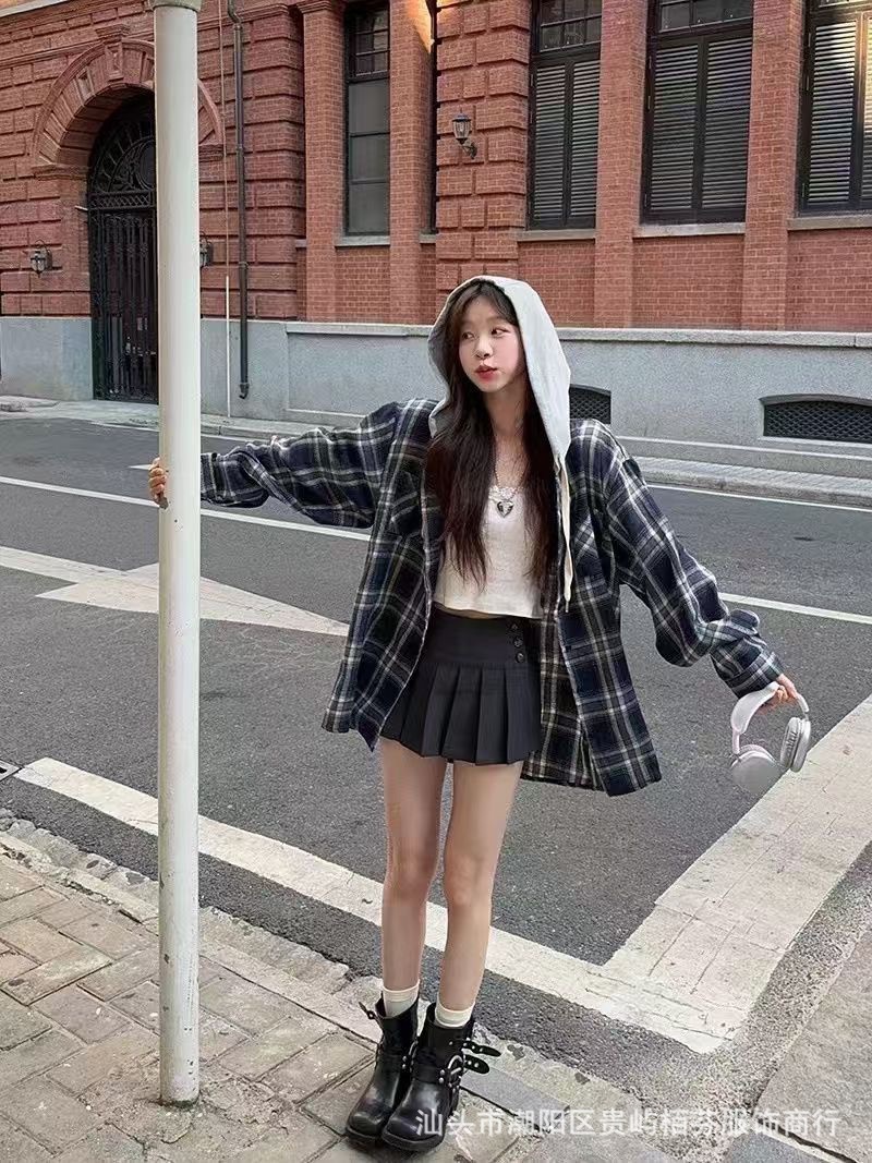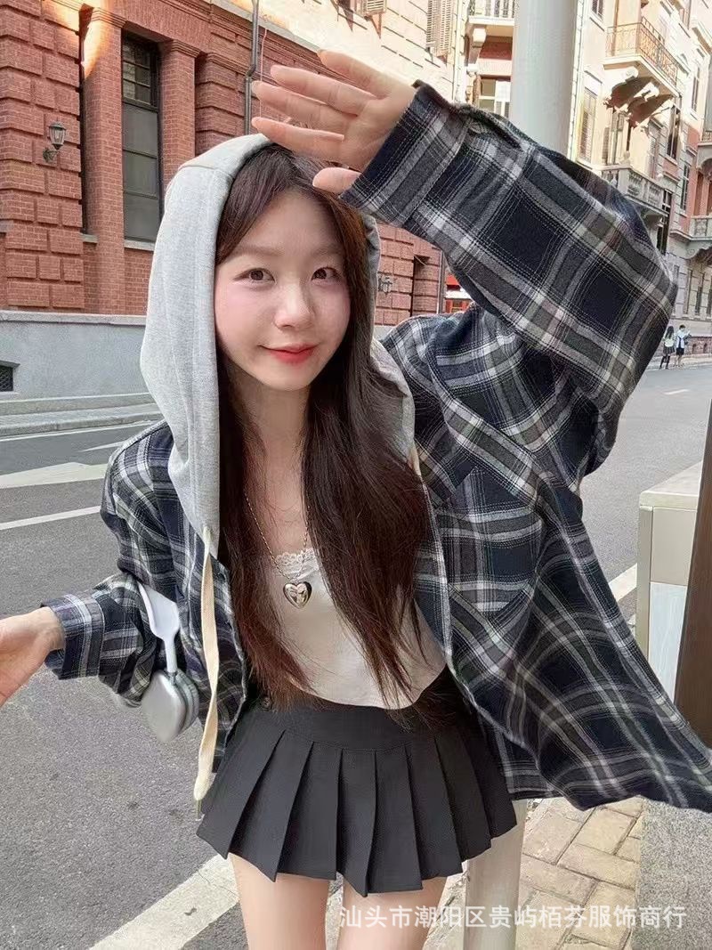 [공장 재고] 레트로 후드 체크 무늬 셔츠 여성의 새 초가을 한국 느슨한 스타일 작은 라이닝스토어 가기
