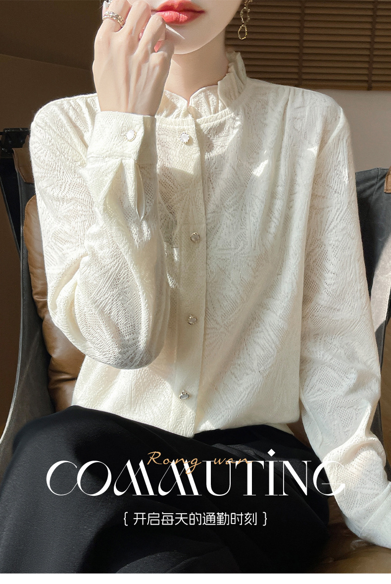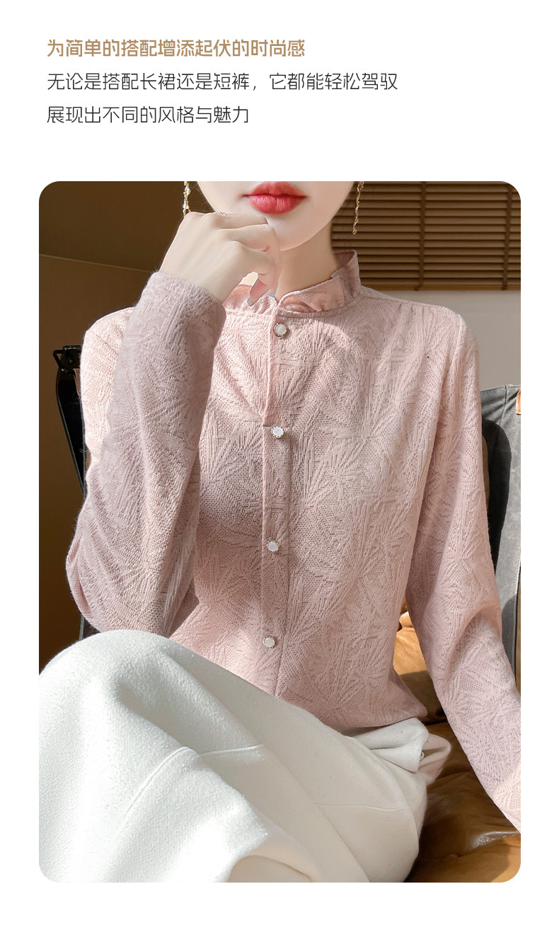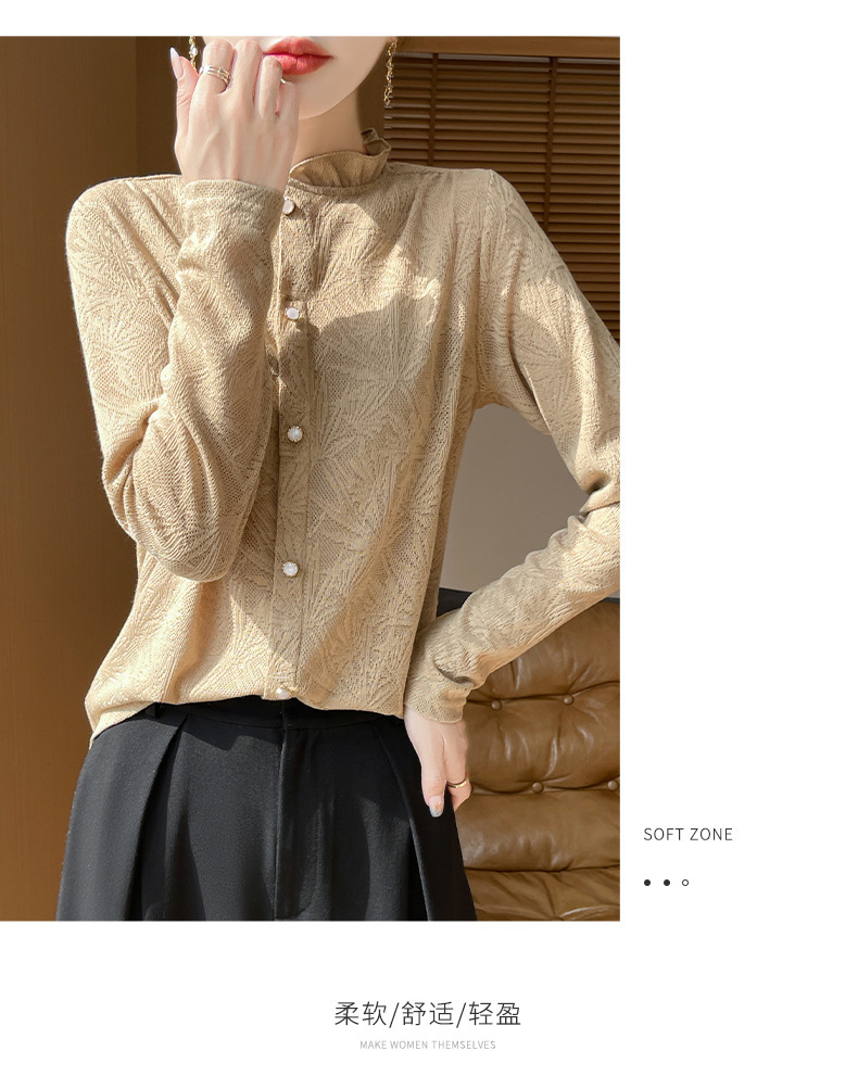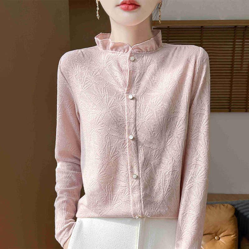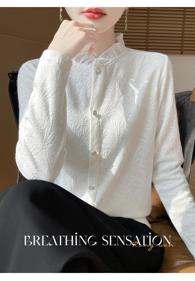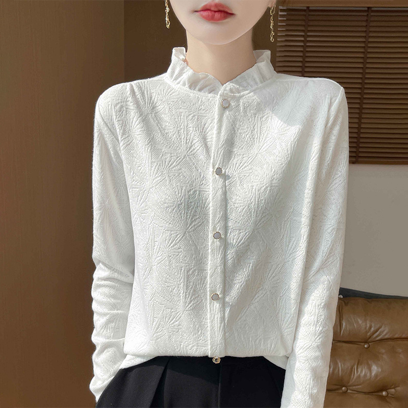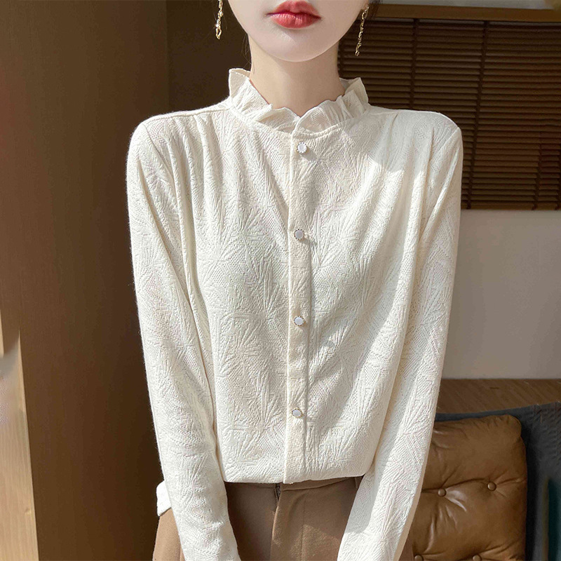 도매 새로운 프랑스 레이스 탑 여성의 기질 나무 칼라 스웨터 긴 소매 기본 셔츠 반 높은 칼라