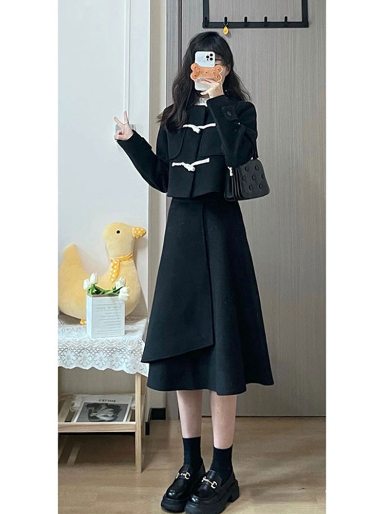 높은 수준의 사교계 슬리밍 기질 작은 향기로운 스타일 울 코트 여성 스커트 투피스 세트 2024 가을과 겨울 새로운스토어 가기