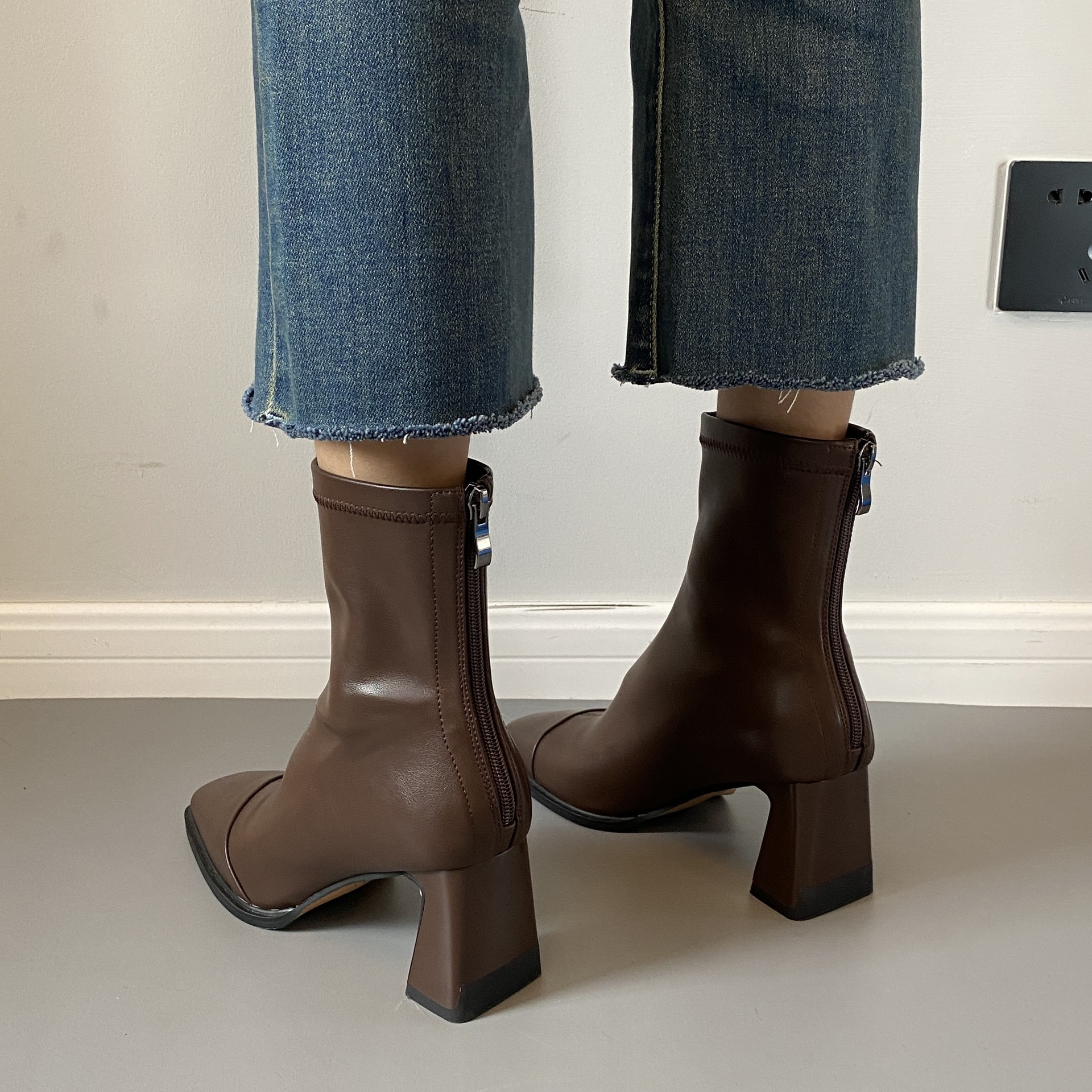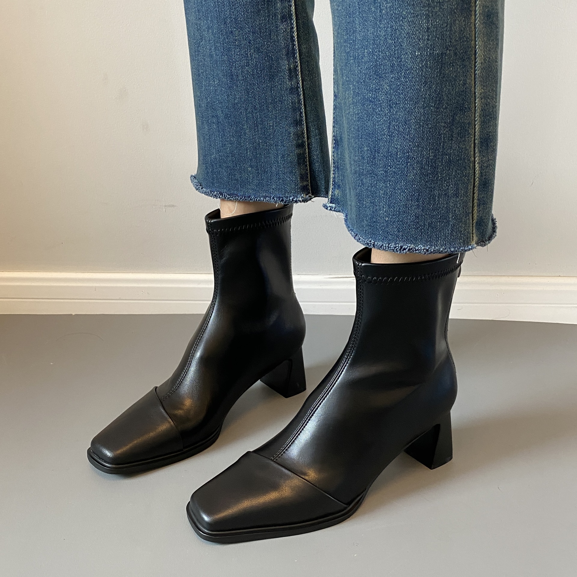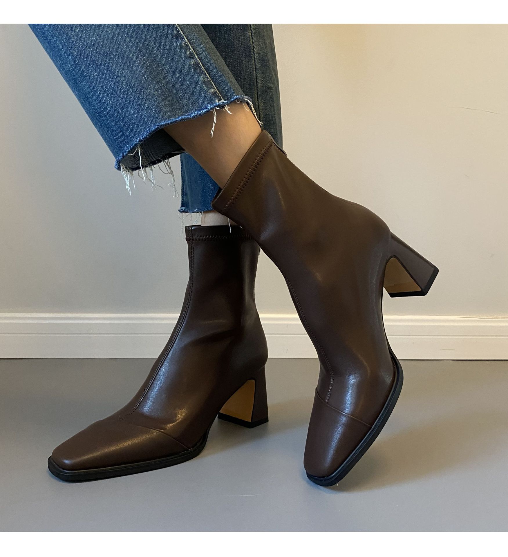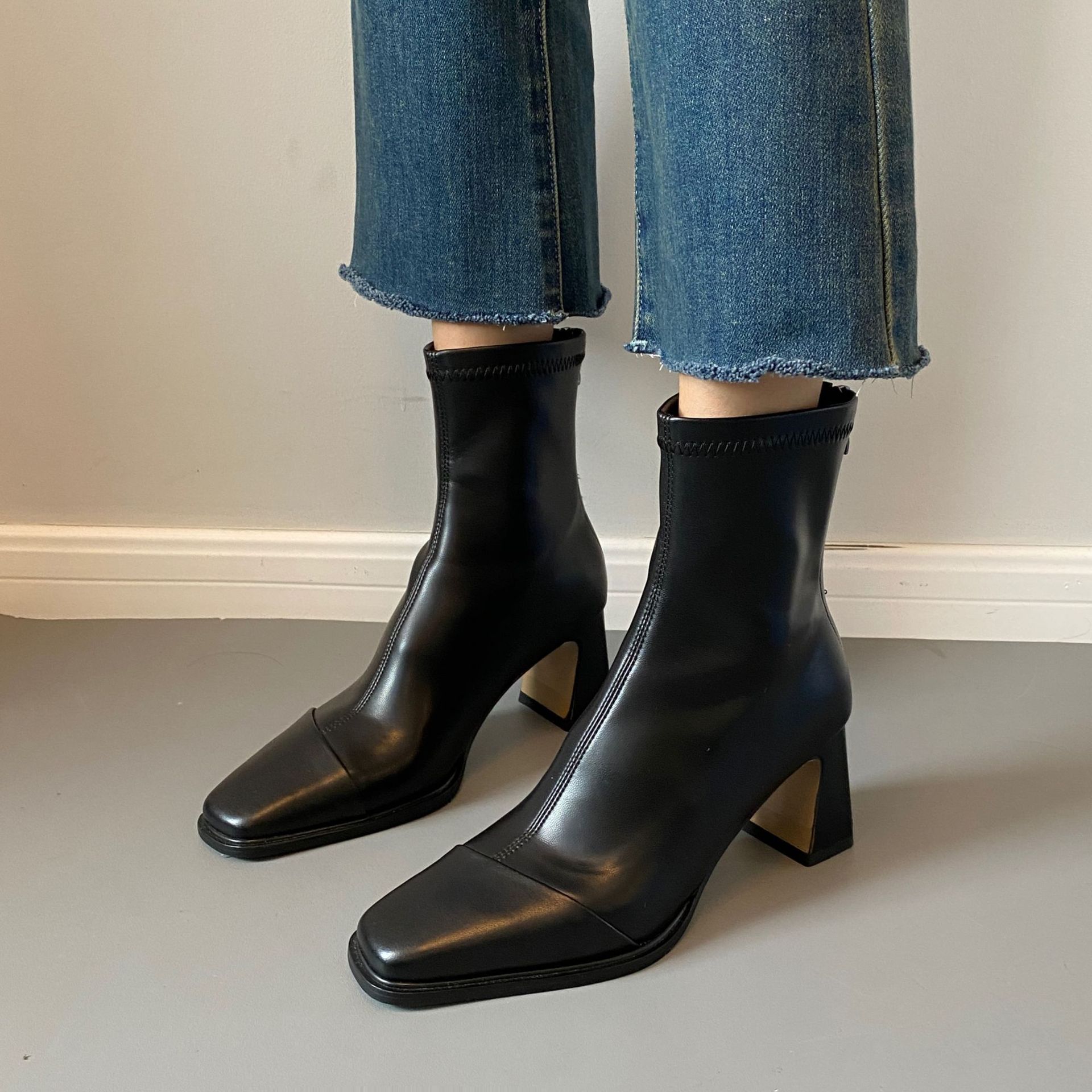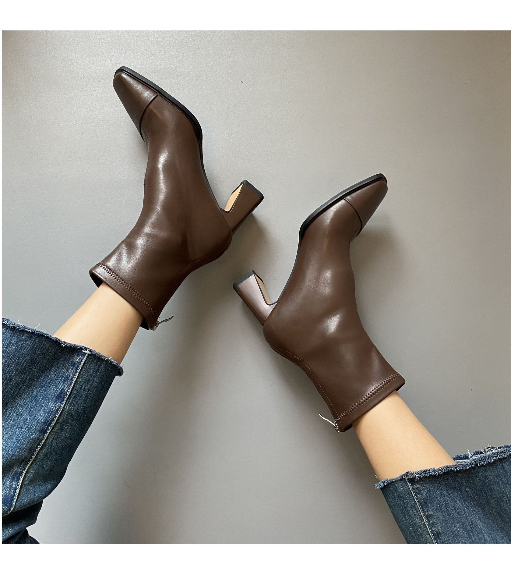 재고! Cowhide 프렌치 레트로 씬 부츠 여성용 마틴 부츠 가을 겨울 기모 하이힐 짧은 부츠 두꺼운 힐스토어 가기