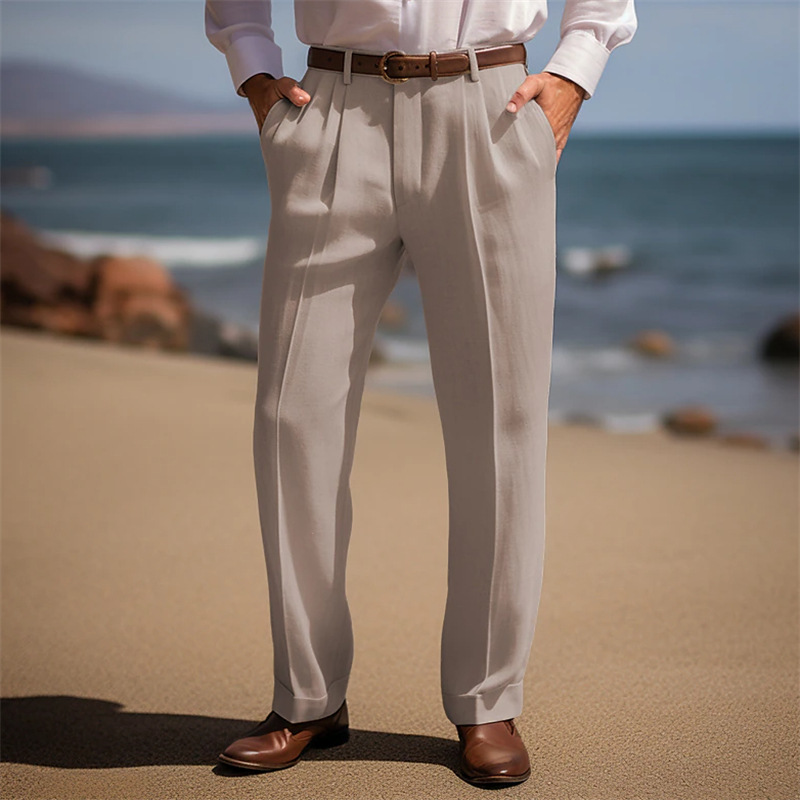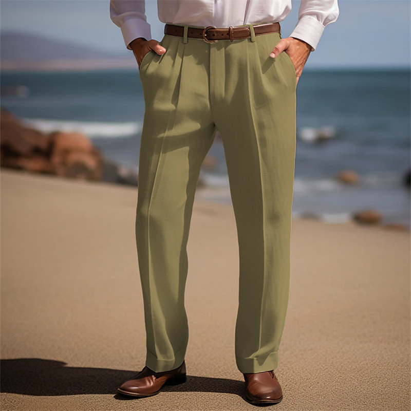 남성 리넨 바지 여름 프론트 포켓 주름 스트레이트 플레인 컬러 편안한 통기성 캐주얼 매일 휴가 패션 베이스