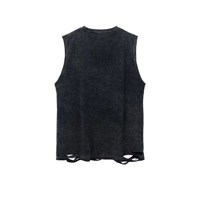 유럽과 미국의 트렌디 하이 스트리트 리핑 디자인 센스 조끼 남자 및 여자 올 매치 워시 올드 레트로 힙합 티셔츠 체인