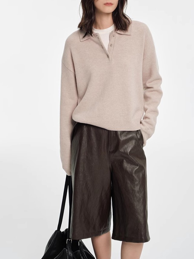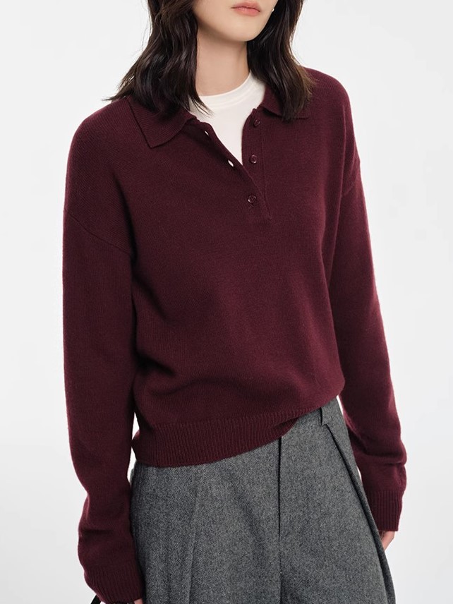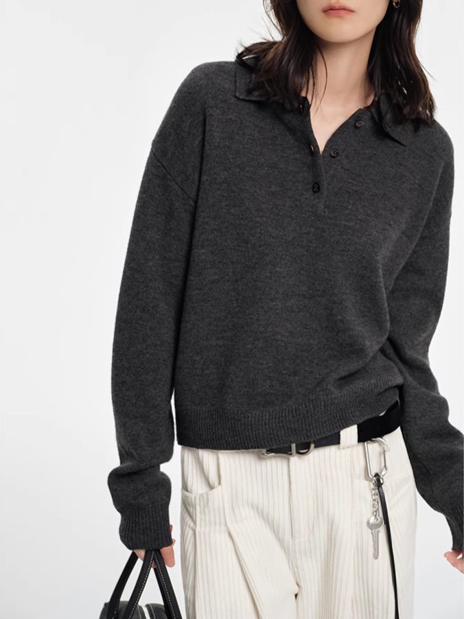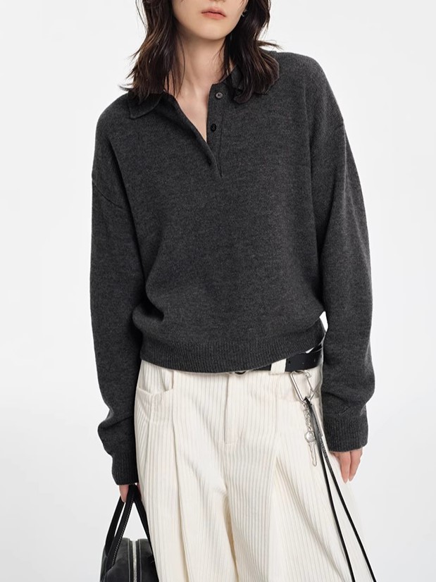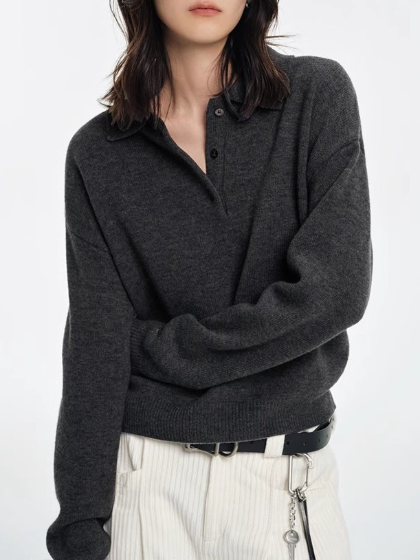 2024 회색 폴로 칼라 풀오버 스웨터 여성의 가을과 겨울 느슨한 게으른 내부 짧은베이스 옷깃 니트 탑