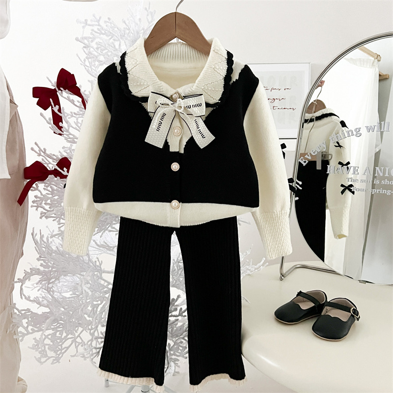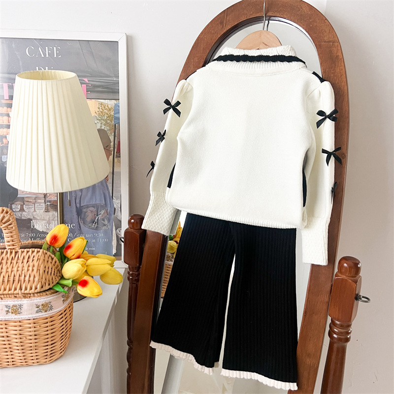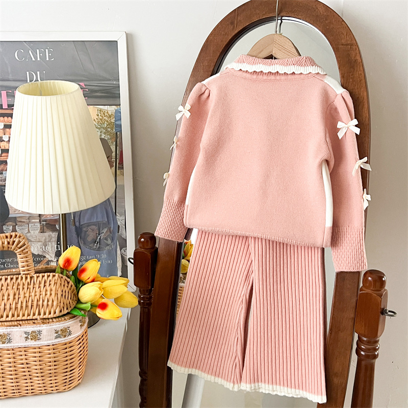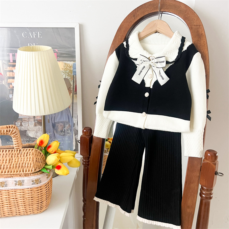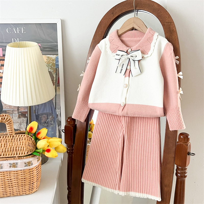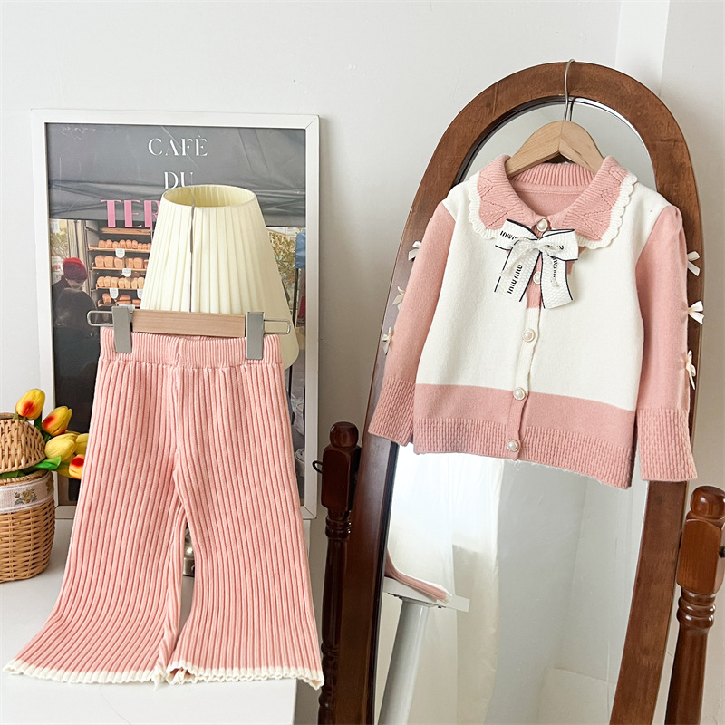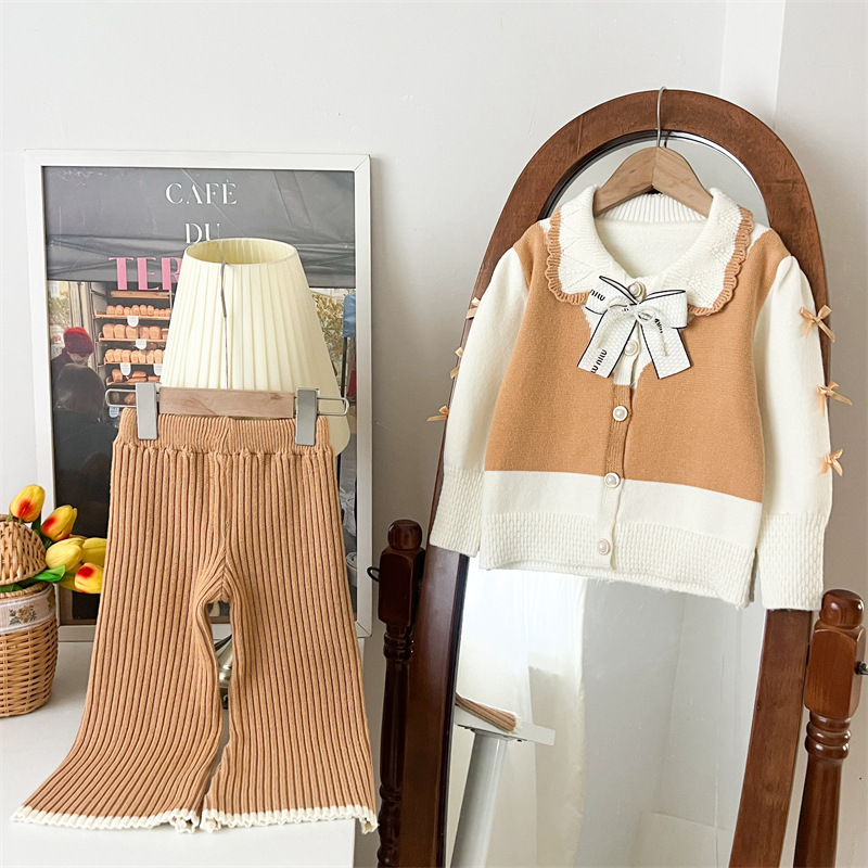 국경 간 폭발 소녀 스웨터 세트 2024 가을과 겨울 새로운 가짜 두 카디건 울 바지 외국 스타일 투피스 세트