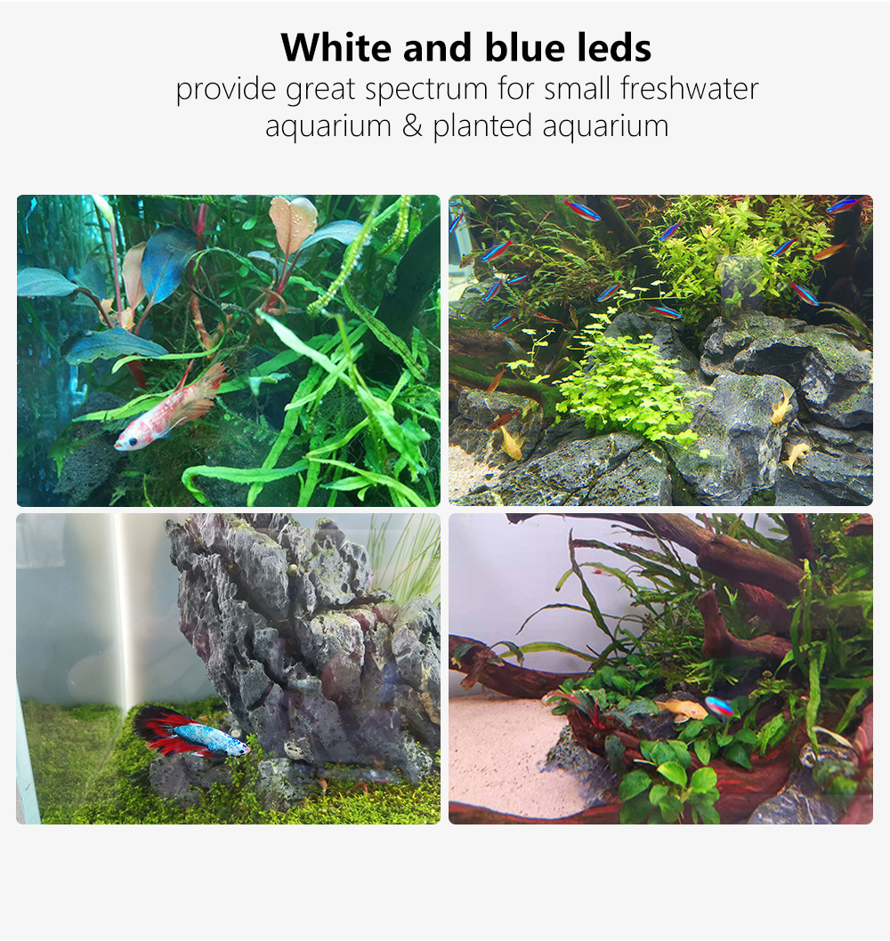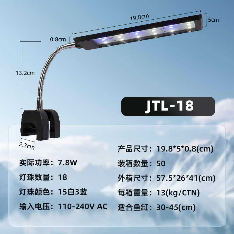 • JTL-18 흰색 15개 파란색 램프 구슬 3개 크기: 19.8*5*0.8 무게 240g 30-45cm 수조 7.8w에 적합