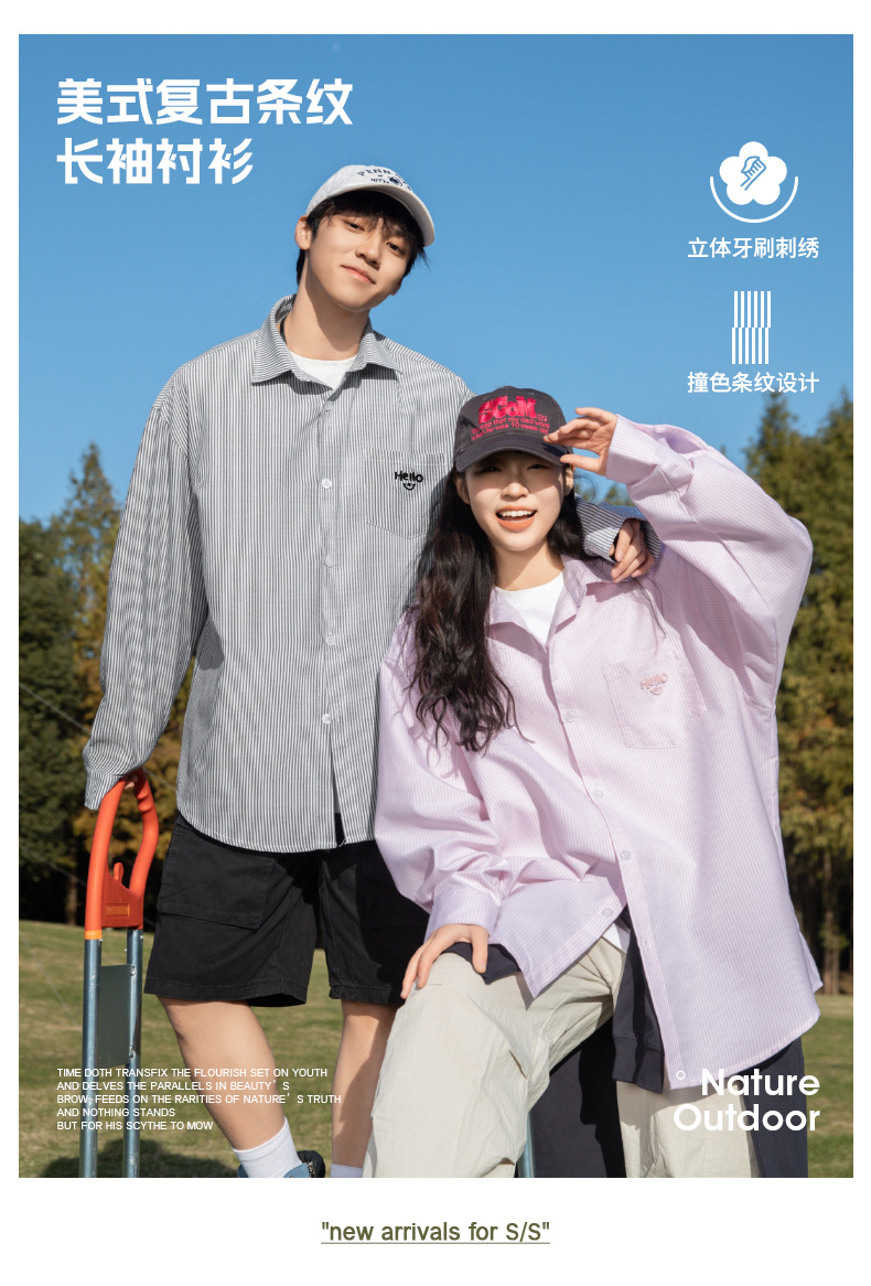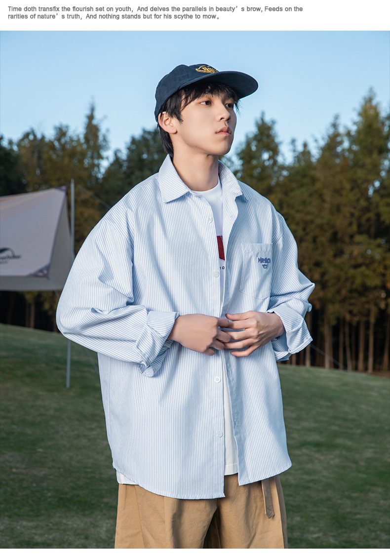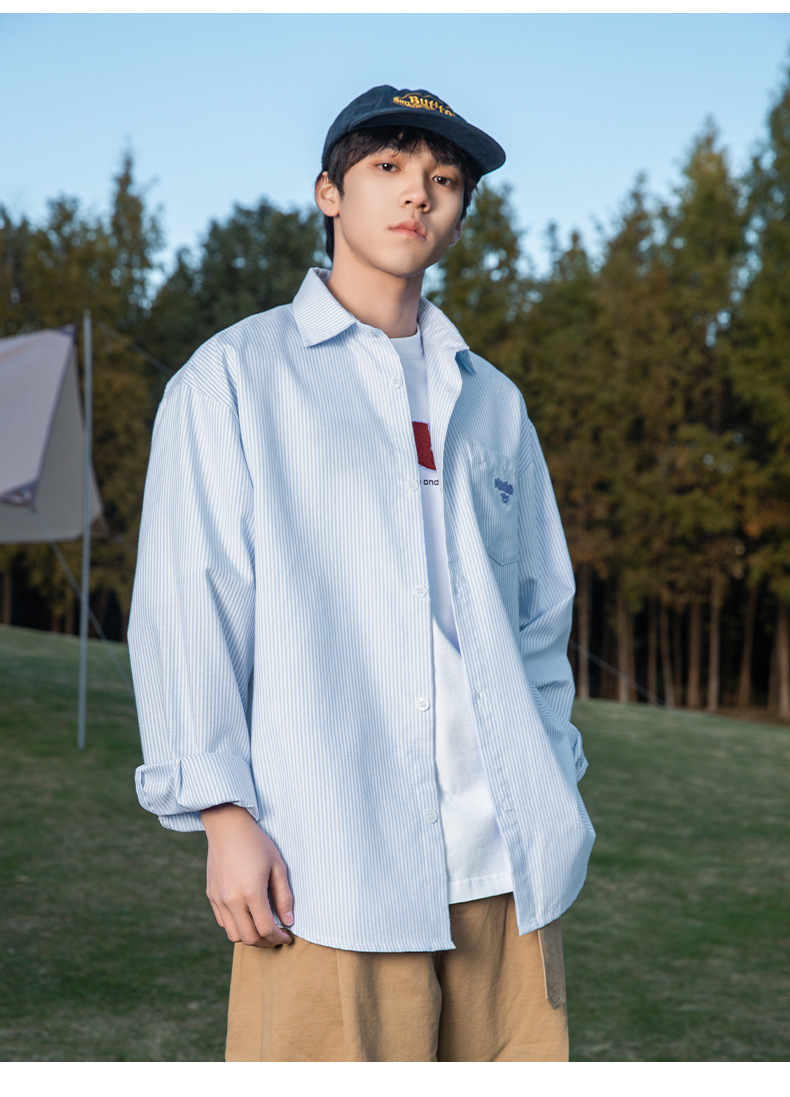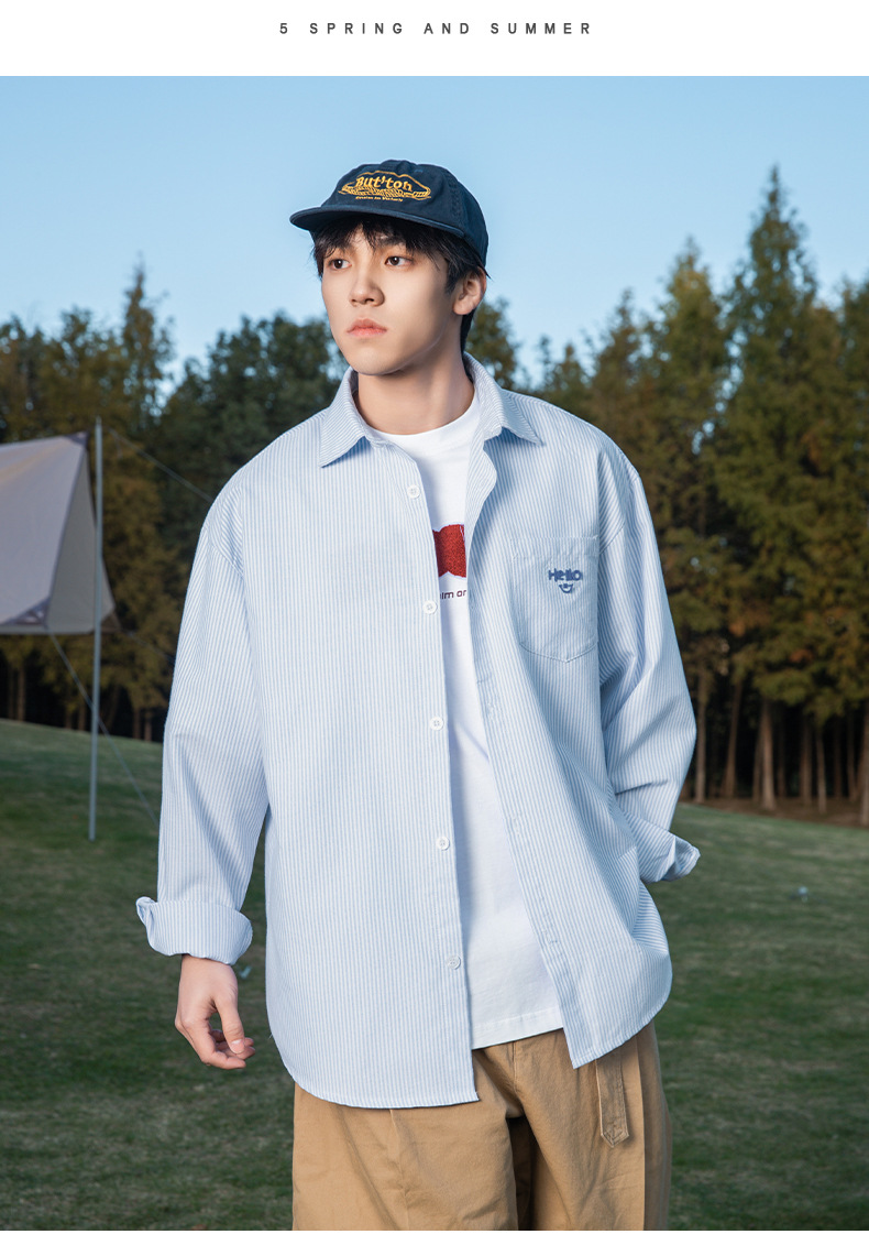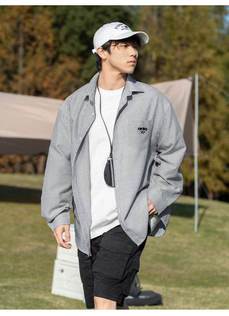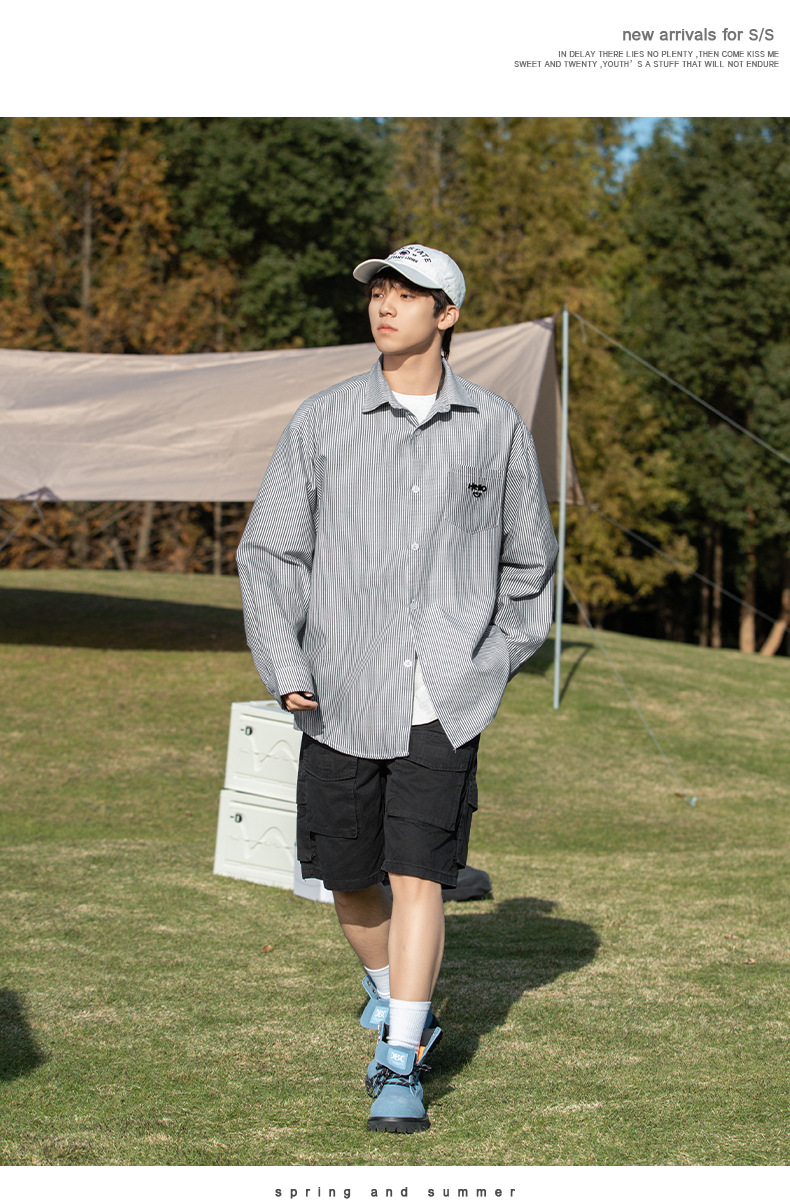 미국 레트로 스타일 캐주얼 긴팔 셔츠 남성용 스트라이프 배색 디자인 포켓 루즈핏 셔츠 입체 자수 자켓스토어 가기