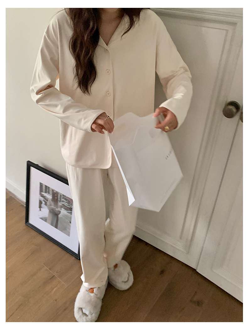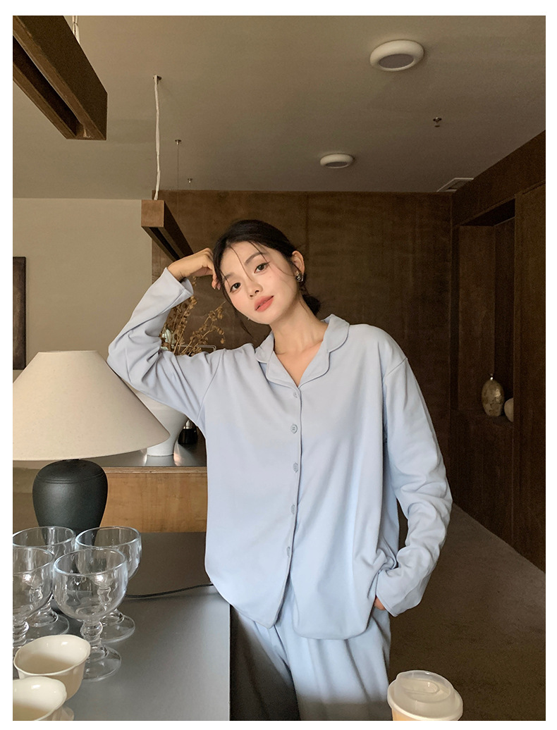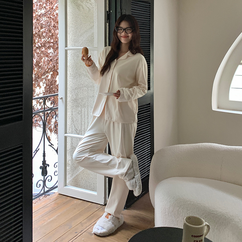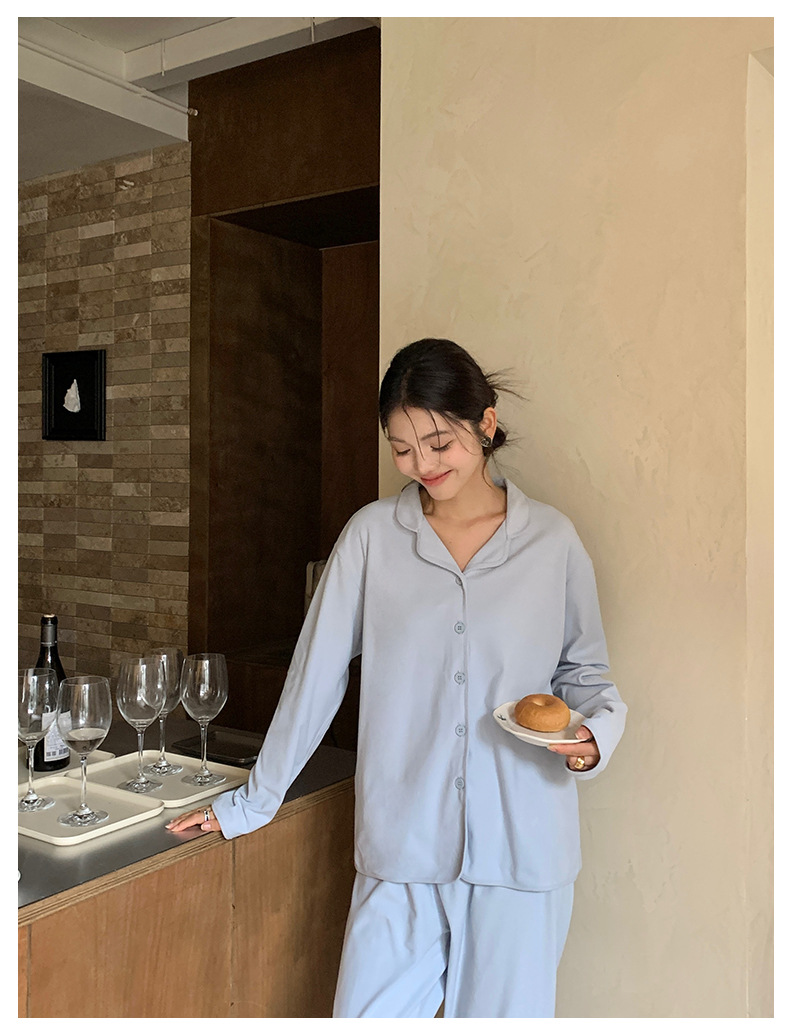 모리시마 가을과 겨울 홈웨어 여성용 한국식 버튼 단색 긴팔 탑 바지 따뜻한 세트 느슨한 아우터 파자마스토어 가기