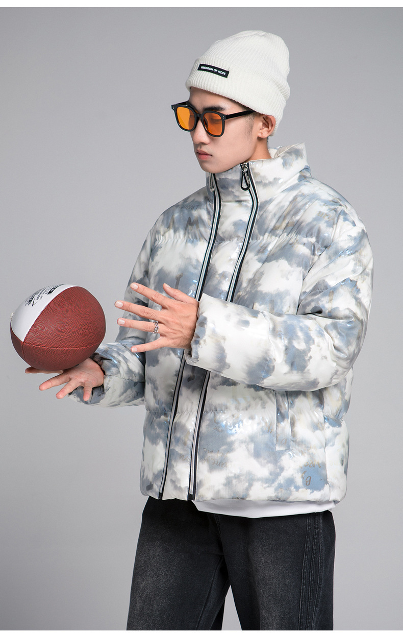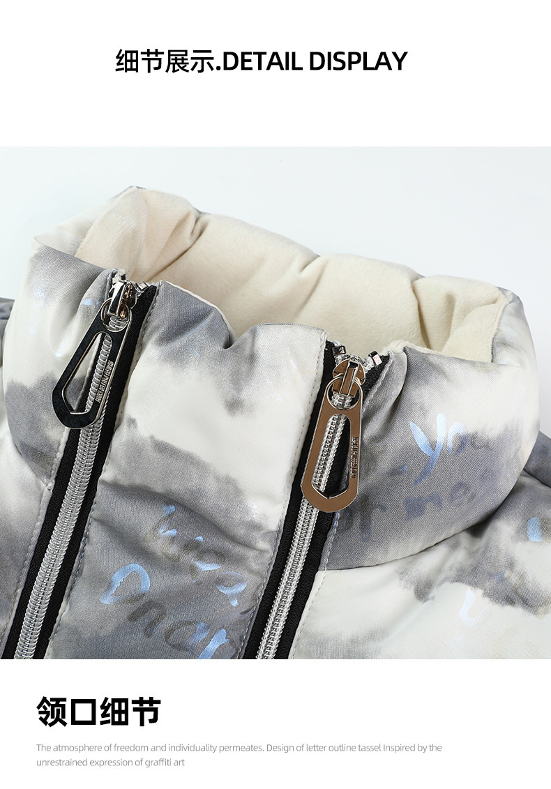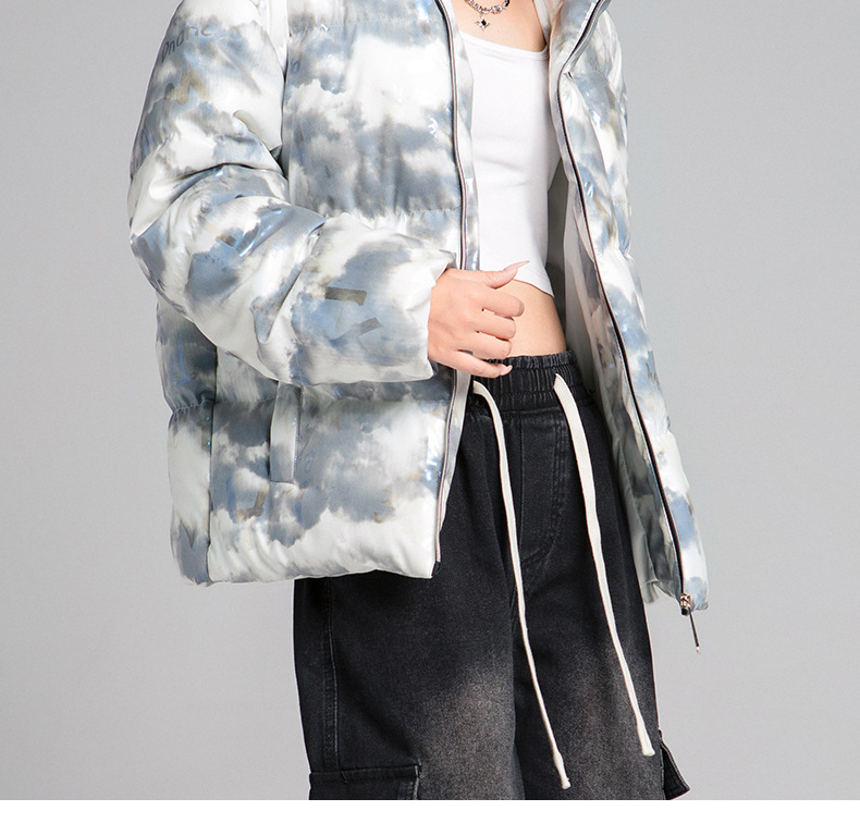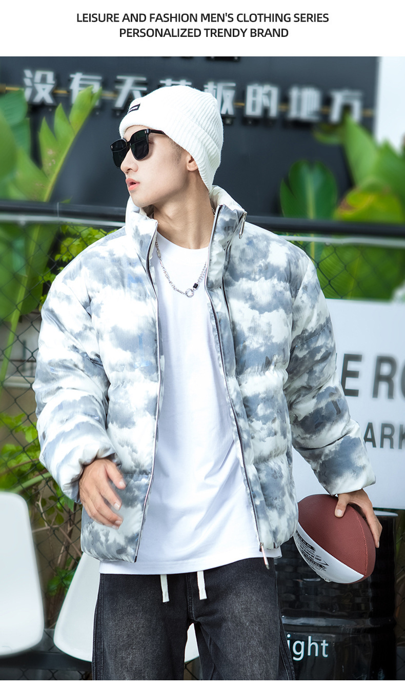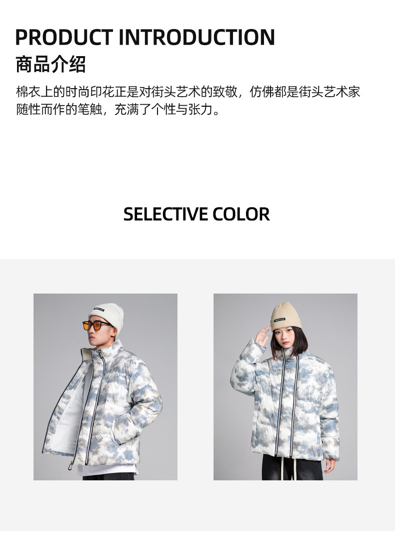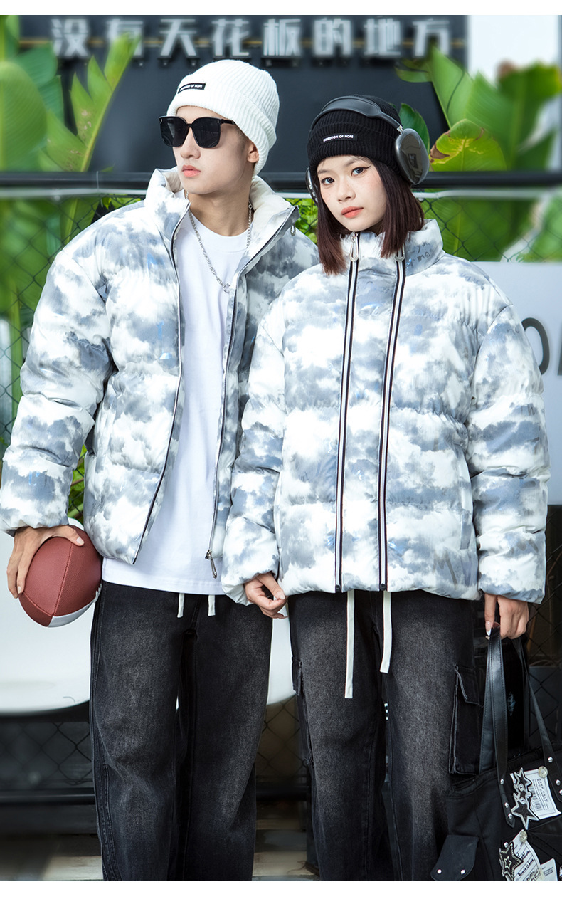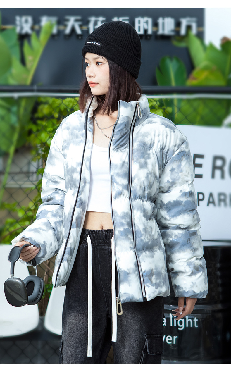 겨울용 두꺼운 면옷, 스탠드 칼라, 커플 스타일, 트렌디한 브랜드, 타이다이 면 재킷, 패셔너블한 더블 지퍼 면 패딩 재킷스토어 가기