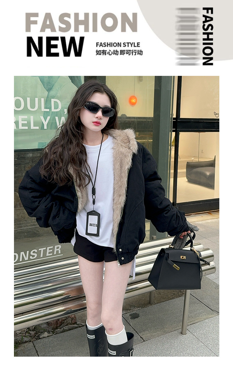 소녀 2025 가을과 겨울 양모 두꺼운 미국 레트로 짧은 후드 울 칼라 디자인 센스 가을과 겨울 파커 코트
