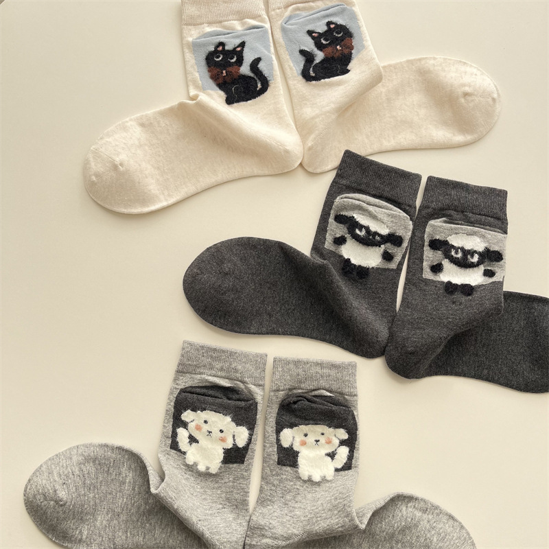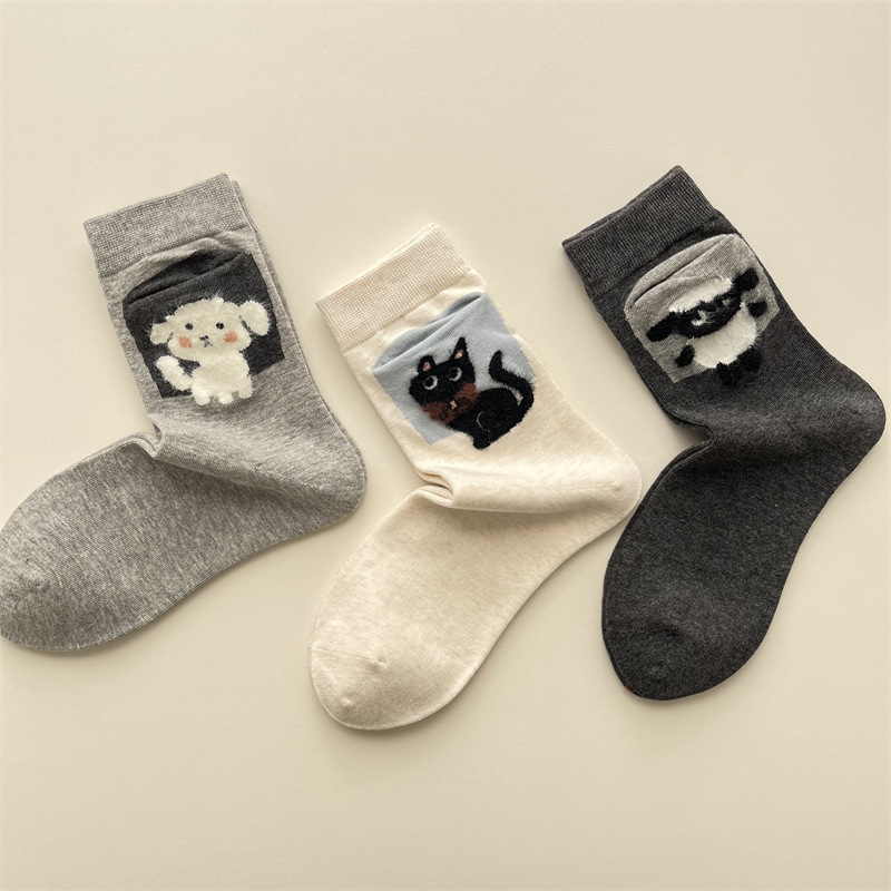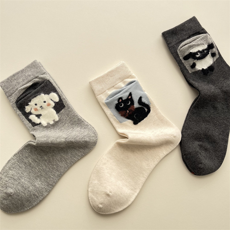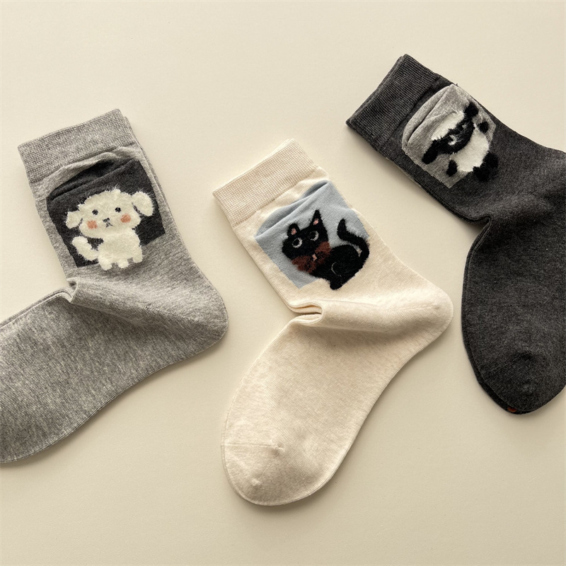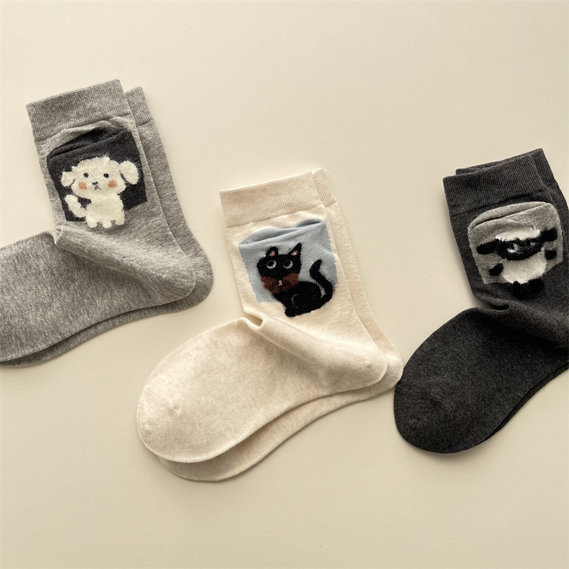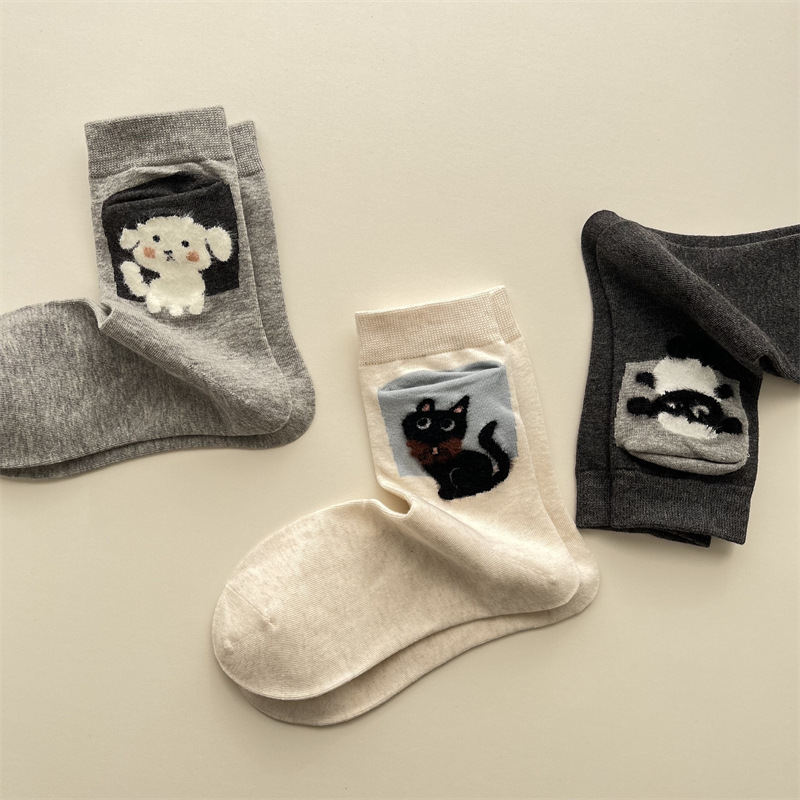 사계절 빗 코튼 만화 동물 양말 한국 스타일 귀여운 포켓 강아지 양고기 미드 튜브 양말 올 매치 통기성 여성 양말