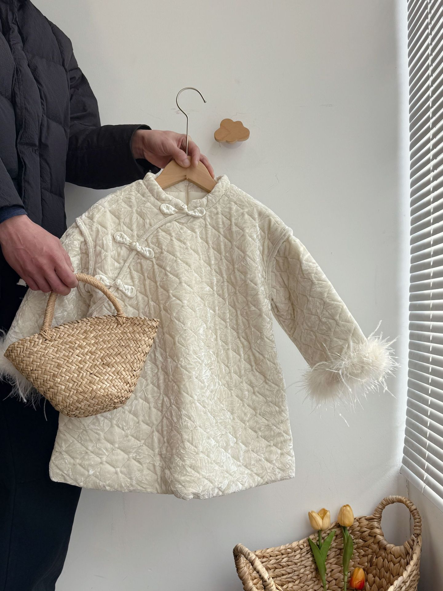 2025년 겨울 신상 레트로 중국풍 여자 어린이 설날 의상 새해 아기 격자무늬 벨벳 두꺼운 보온 원피스
