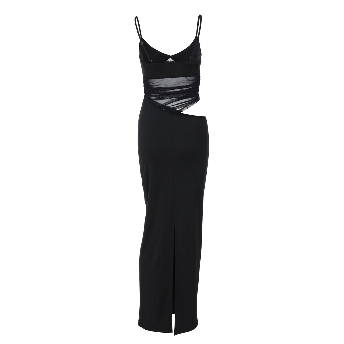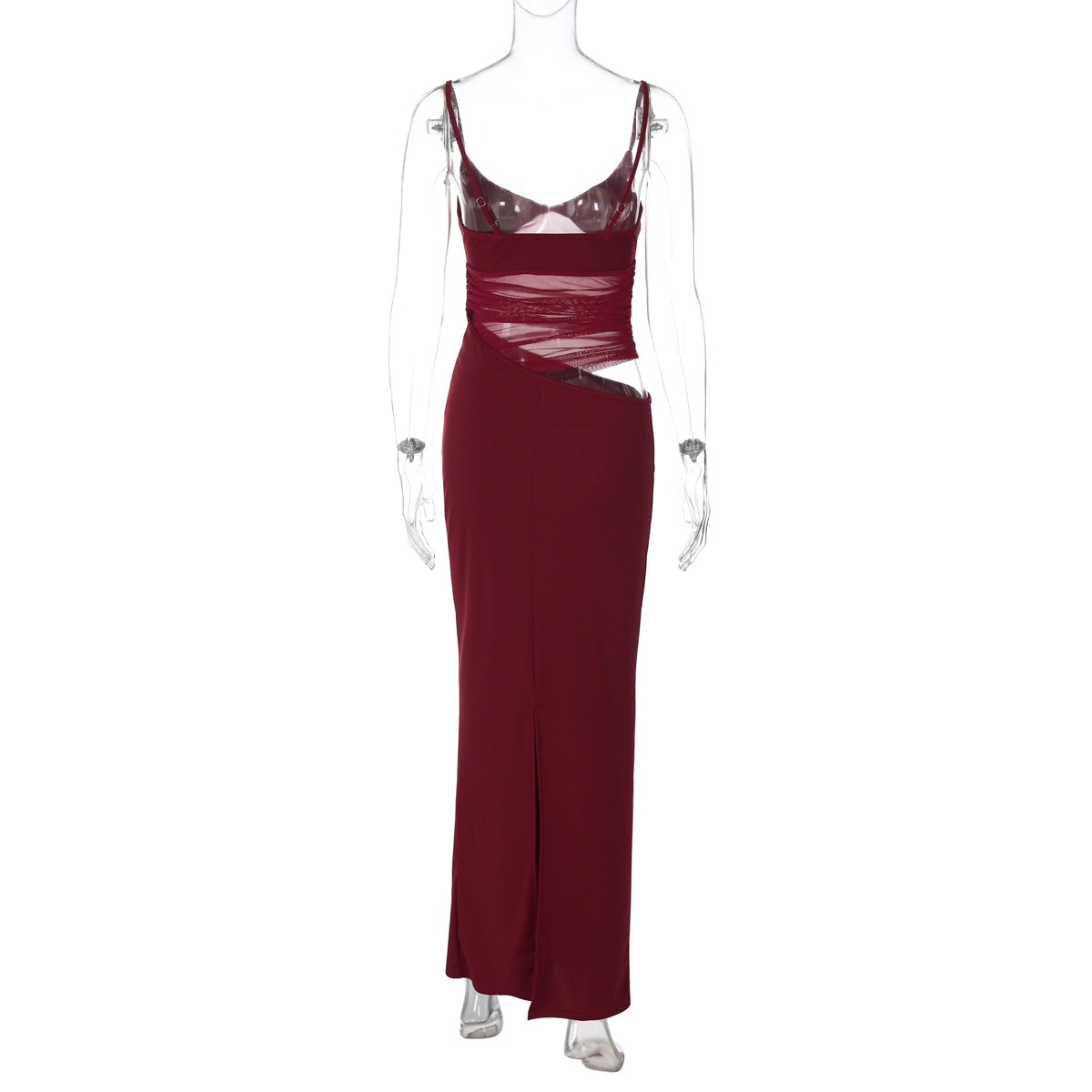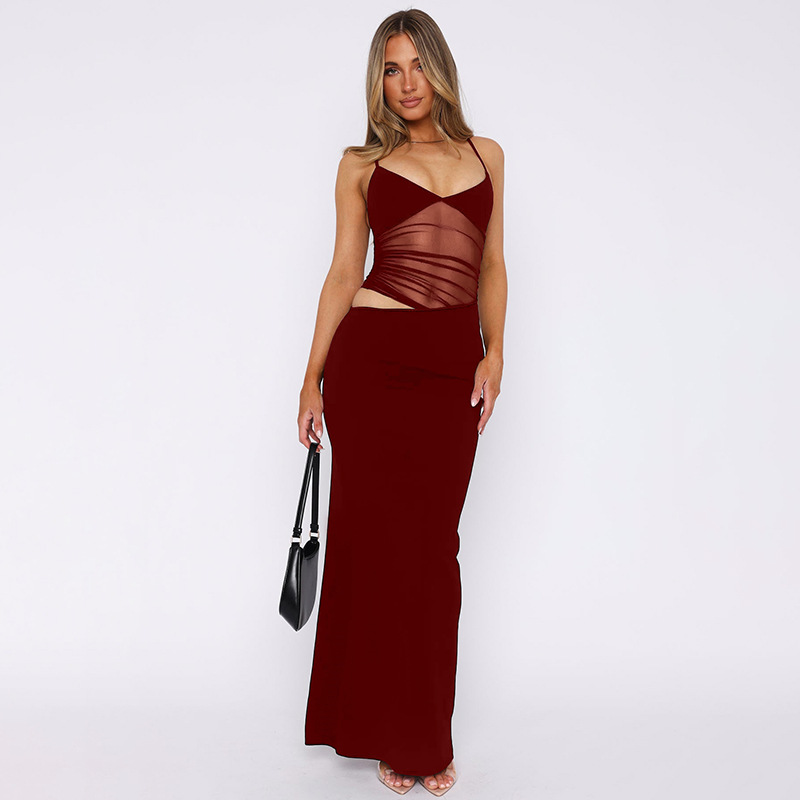 아마존 여성 의류 2025 여름 신상 패션 섹시 스플라이스 슬릿 메쉬 시스루 서스펜더 드레스 도매