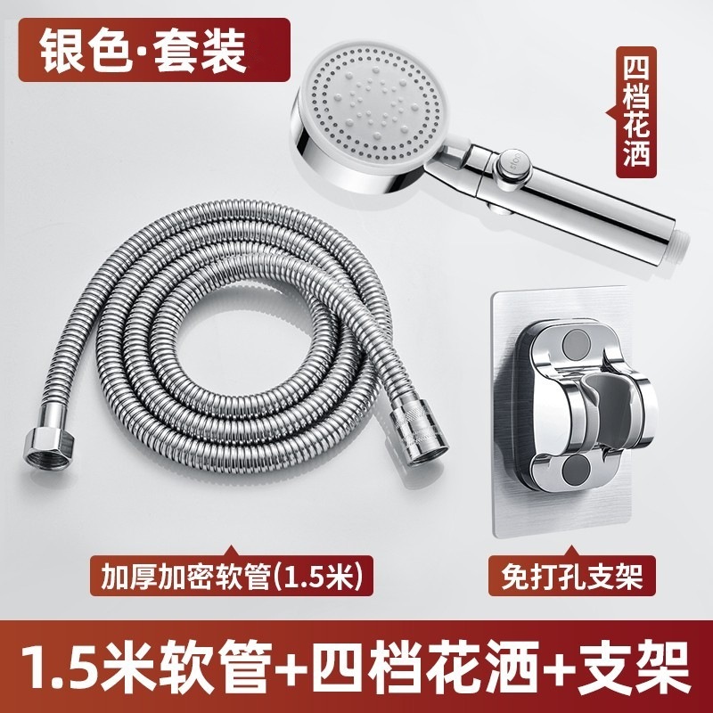 • [전기도금 실버 3종세트] 1.5m 샤워튜브 + 4단 슈퍼차저 샤워노즐 + 브라켓