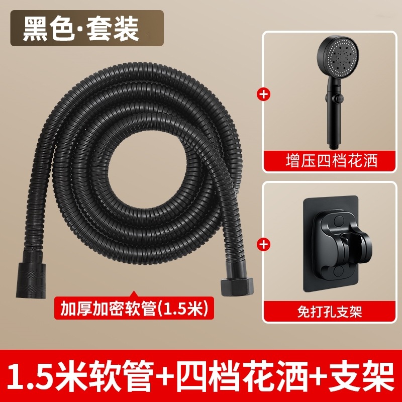 • [블랙 3종세트] 1.5m 샤워튜브 + 4단 슈퍼차저 샤워노즐 + 브라켓