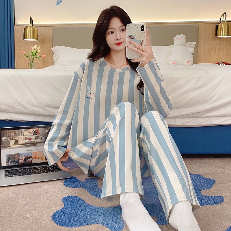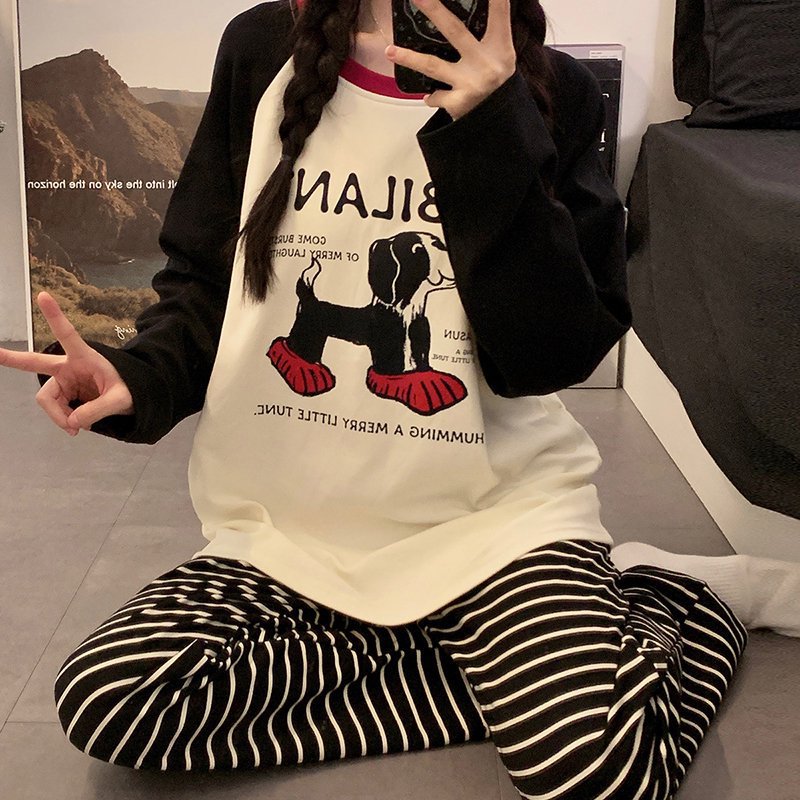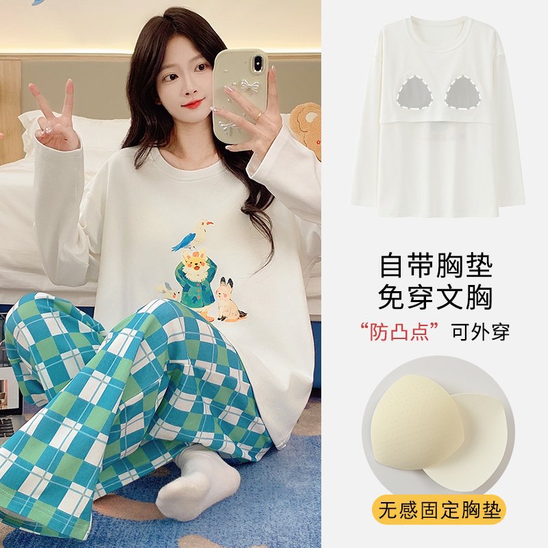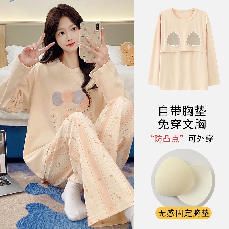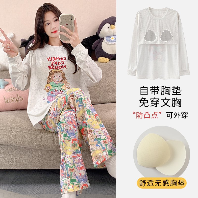 소스 공장 긴 소매 바지 봄과 가을 잠옷 여성 세트 코튼 캐주얼 플러스 사이즈 가슴 패드 느슨한 집스토어 가기