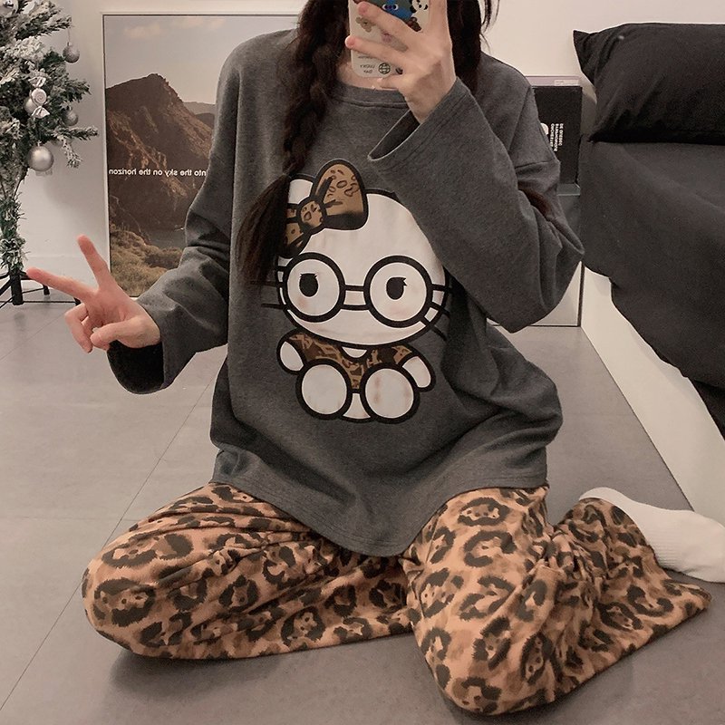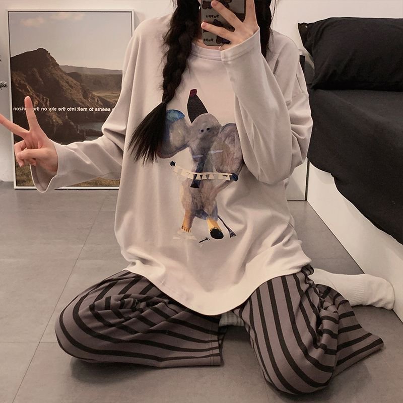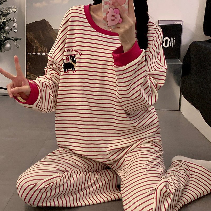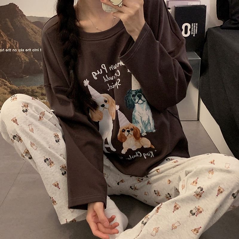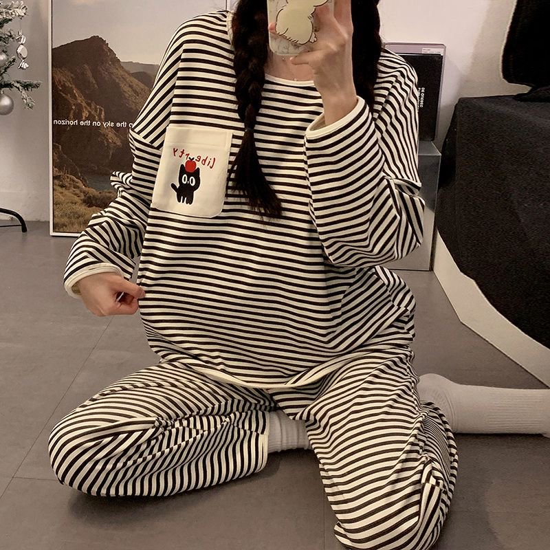 소스 공장 긴 소매 바지 봄과 가을 잠옷 여성 세트 코튼 캐주얼 플러스 사이즈 가슴 패드 느슨한 집스토어 가기