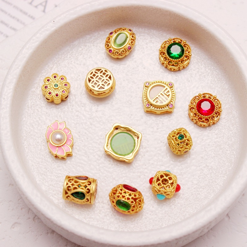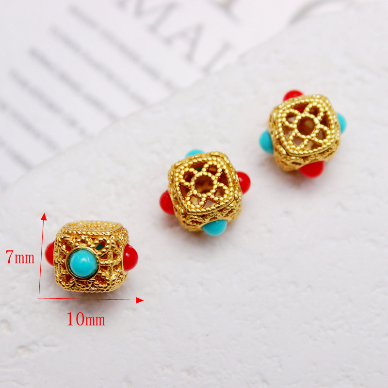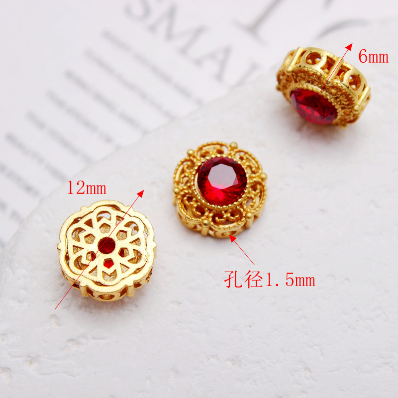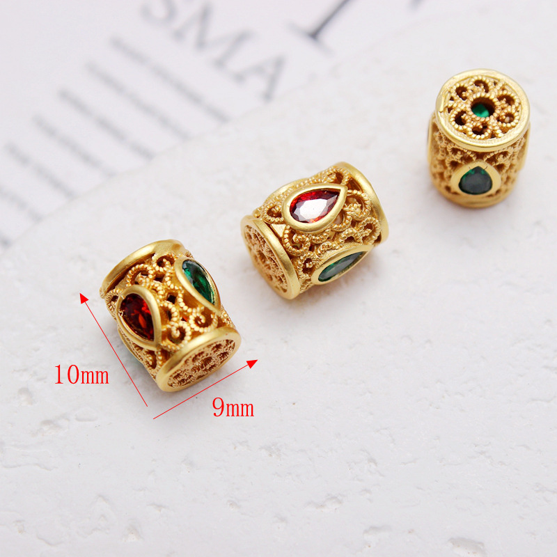 • 매트 골드 중공 레드 및 그린 지르콘 드럼 비즈 8mm
