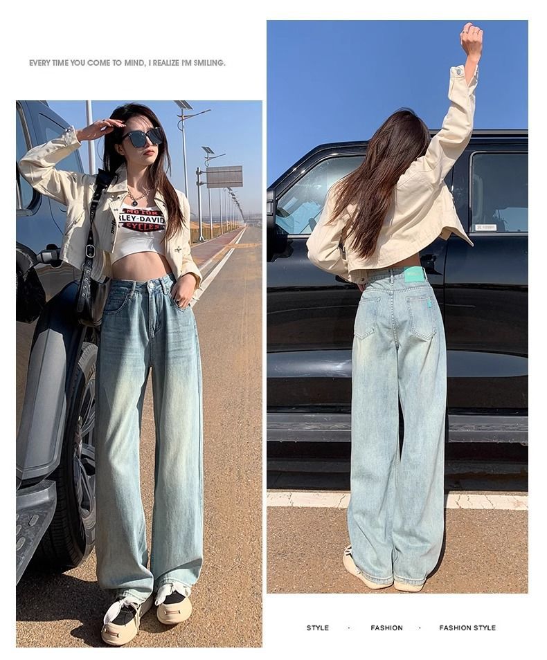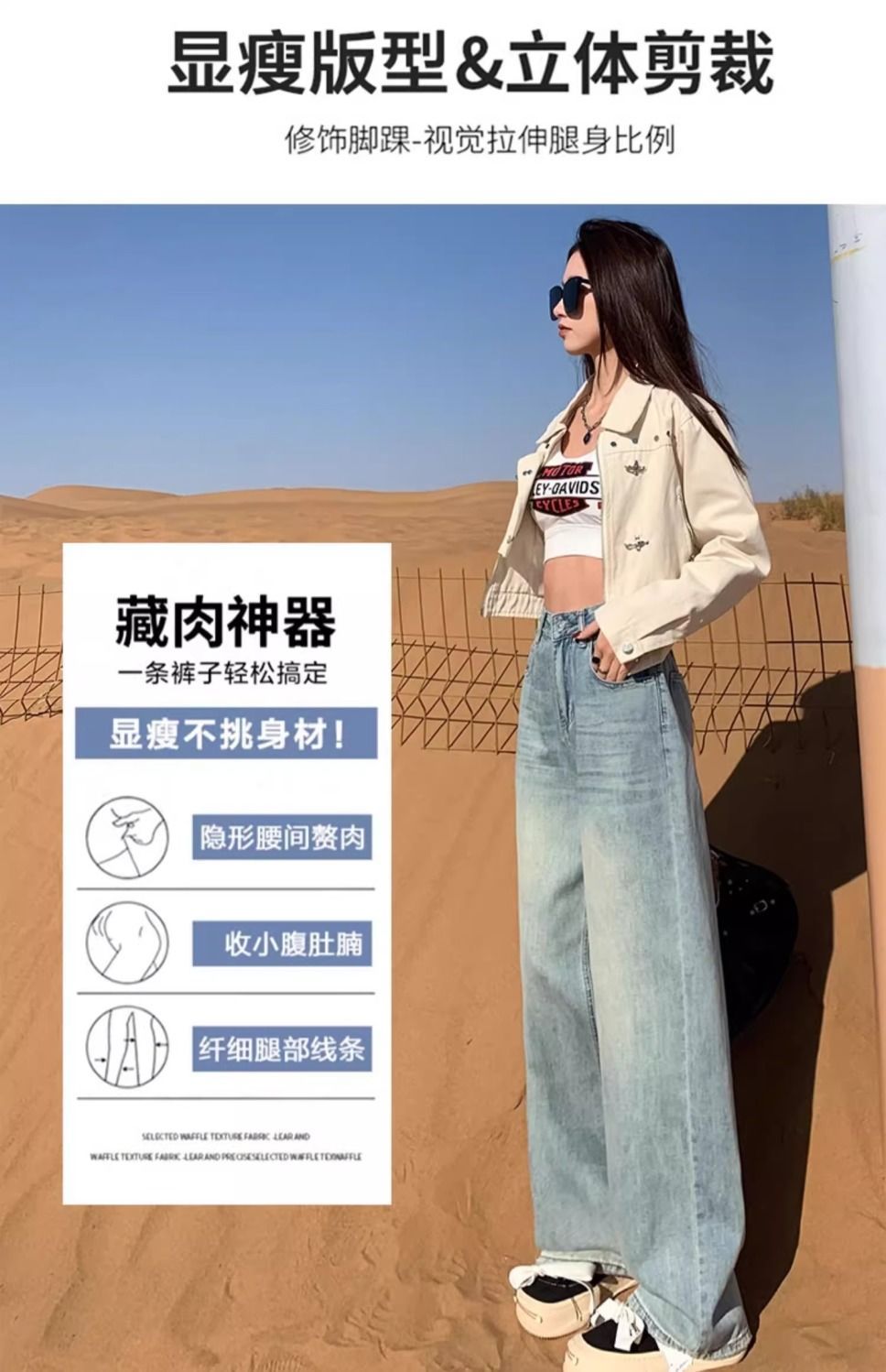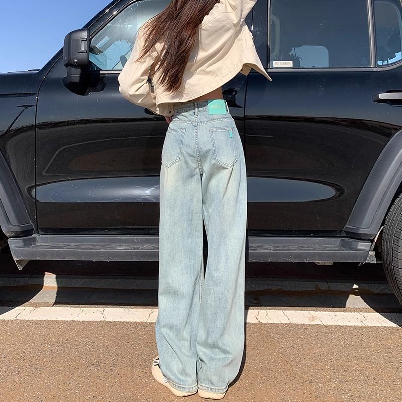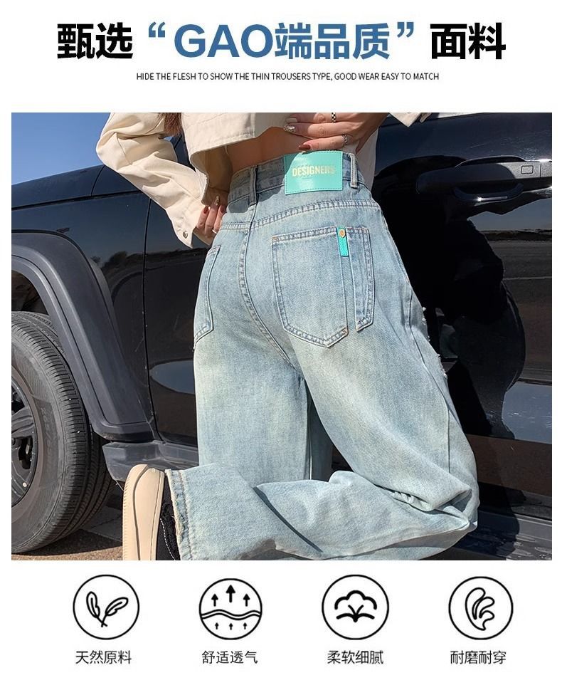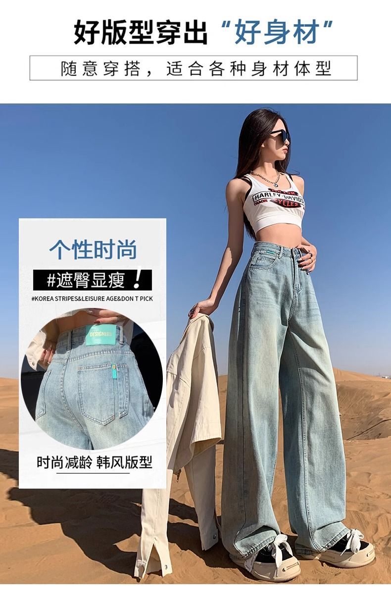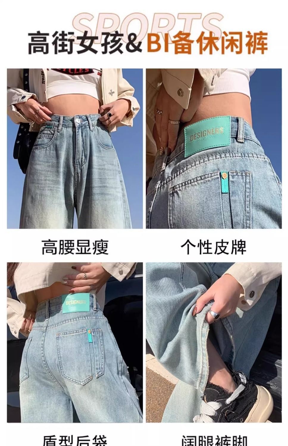 밝은 색 넓은 다리 청바지 여성의 2025 년 여름 봄 높은 허리 느슨한 스트레이트 배 모양의 그림 디자인-센스 트레일 링 바지스토어 가기